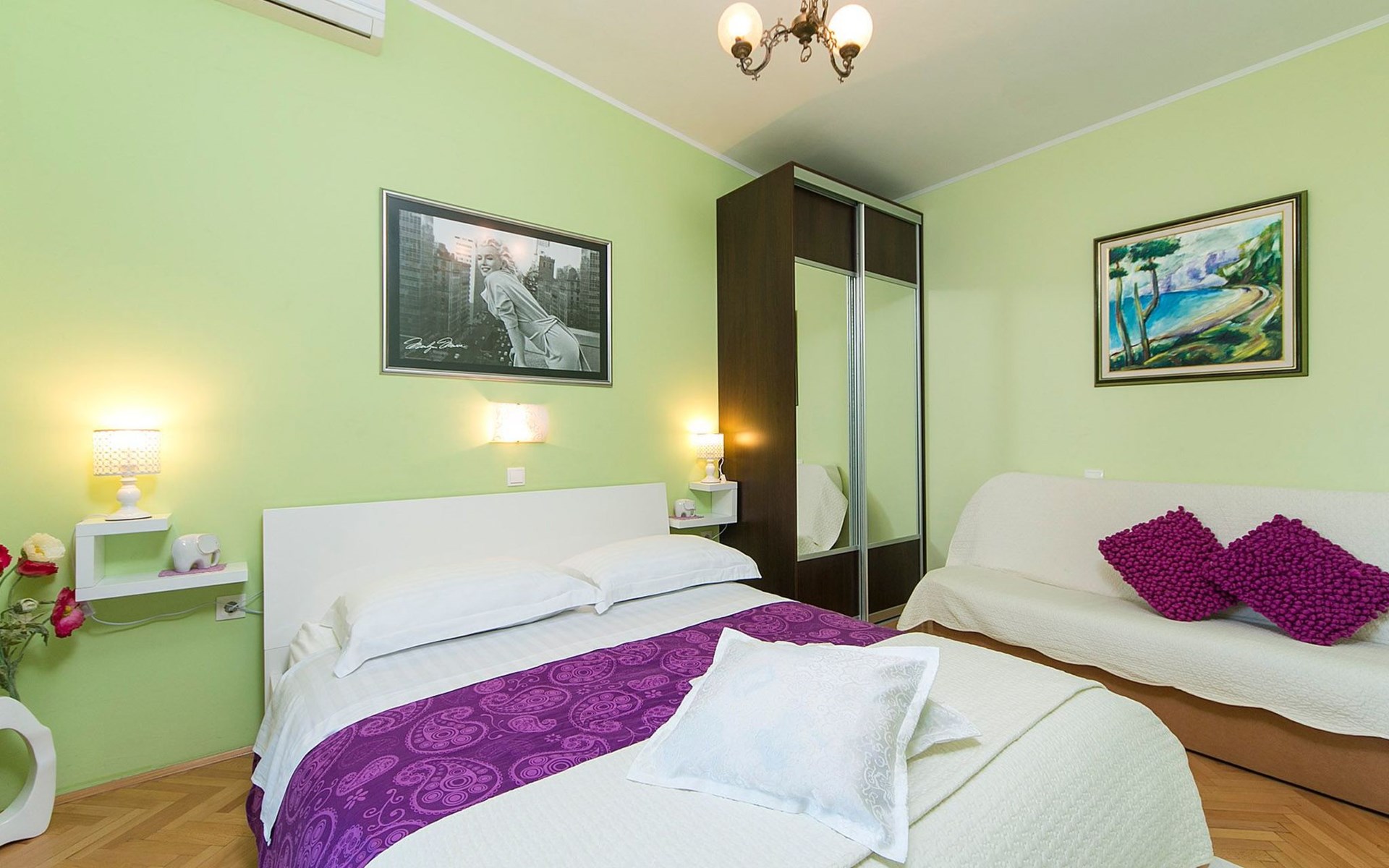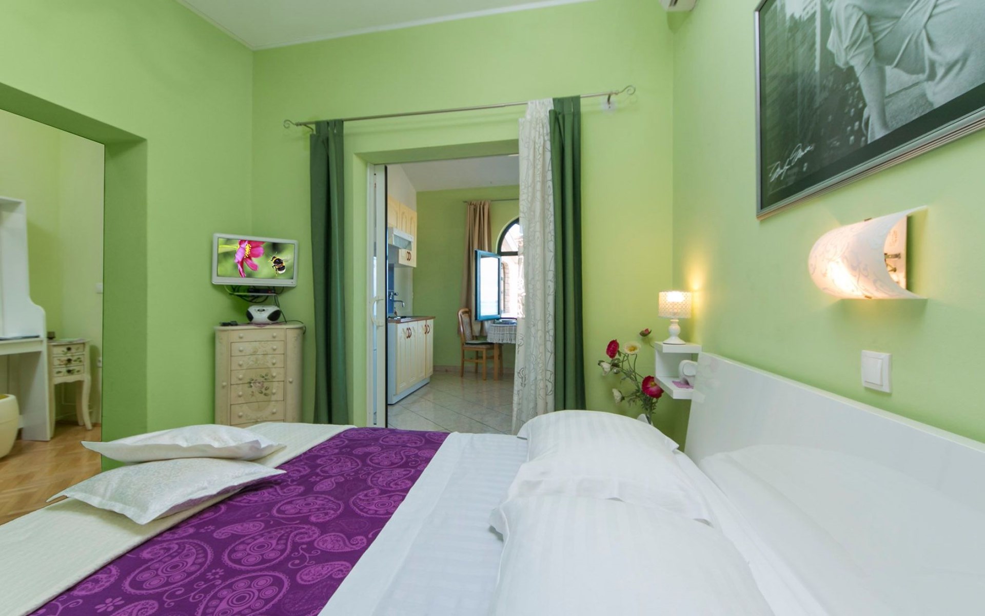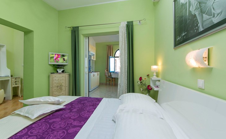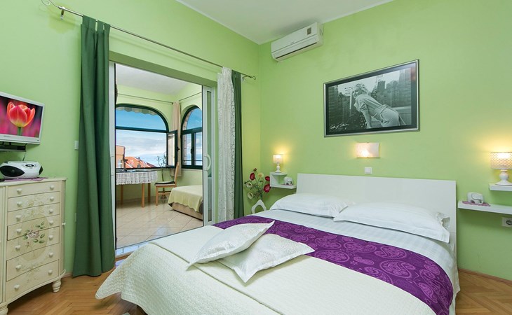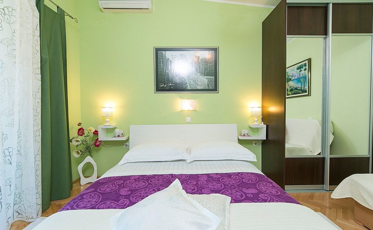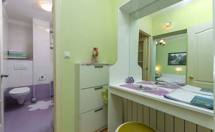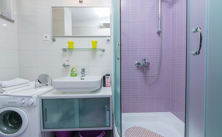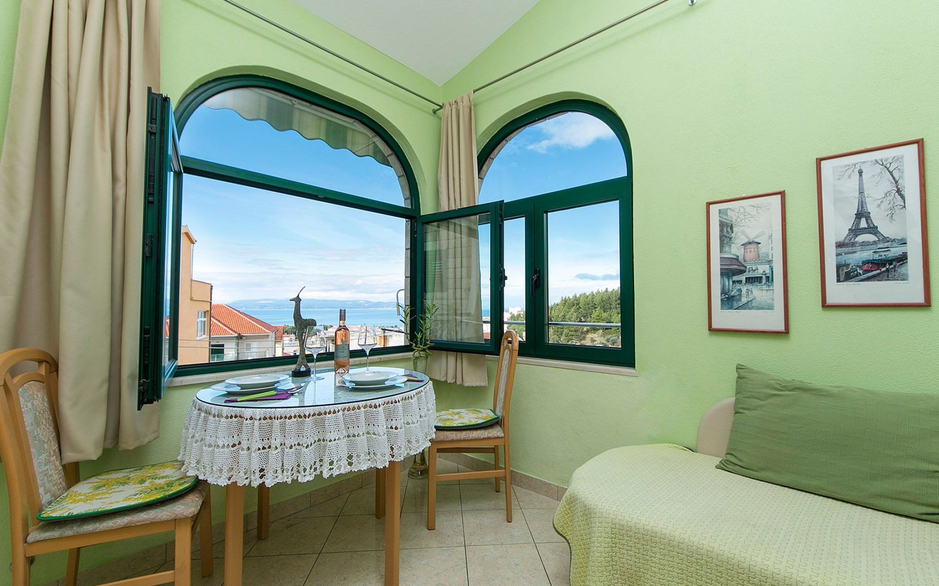 The apartment has a private little balcony with a sea view, furnished with a table and chairs. There is also a little outdoor kitchen with cooking rings, a fridge, sink, coffee machine and kettle. A grill is available for use. There are three parking spaces right by the house and there are also two garage parking spaces in the house.