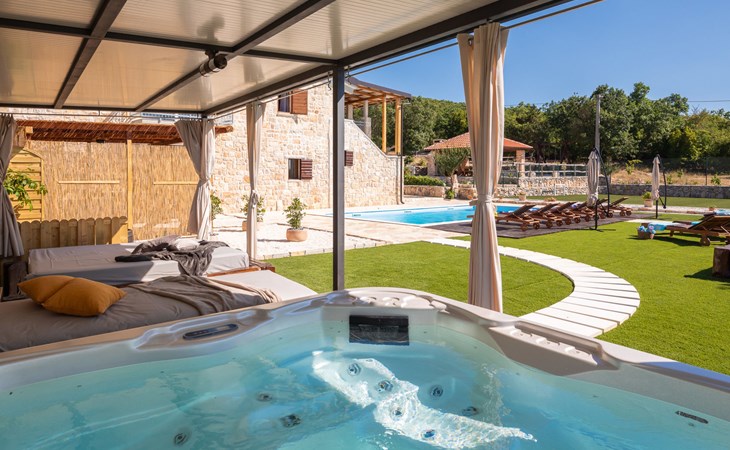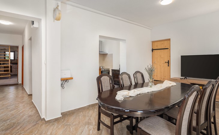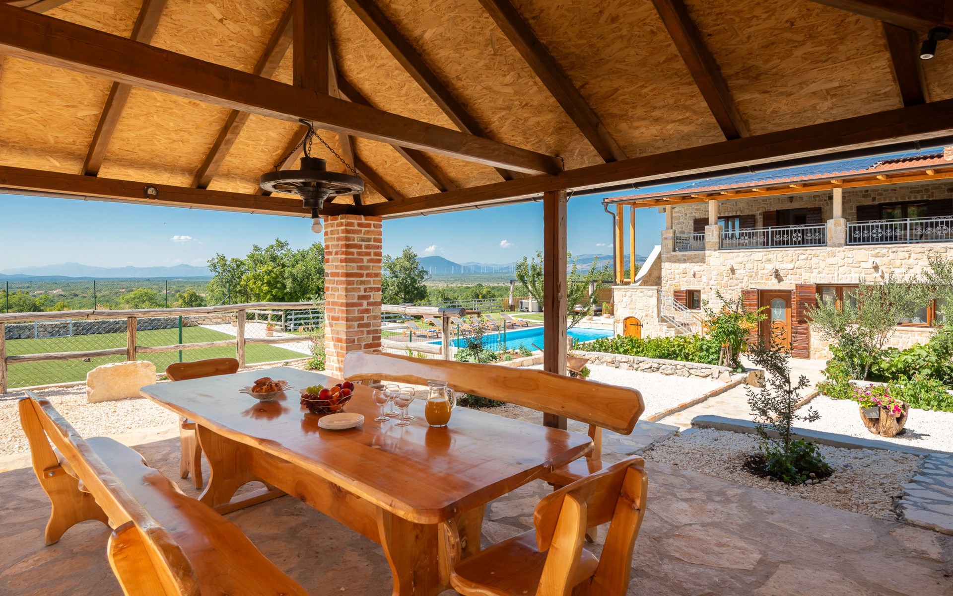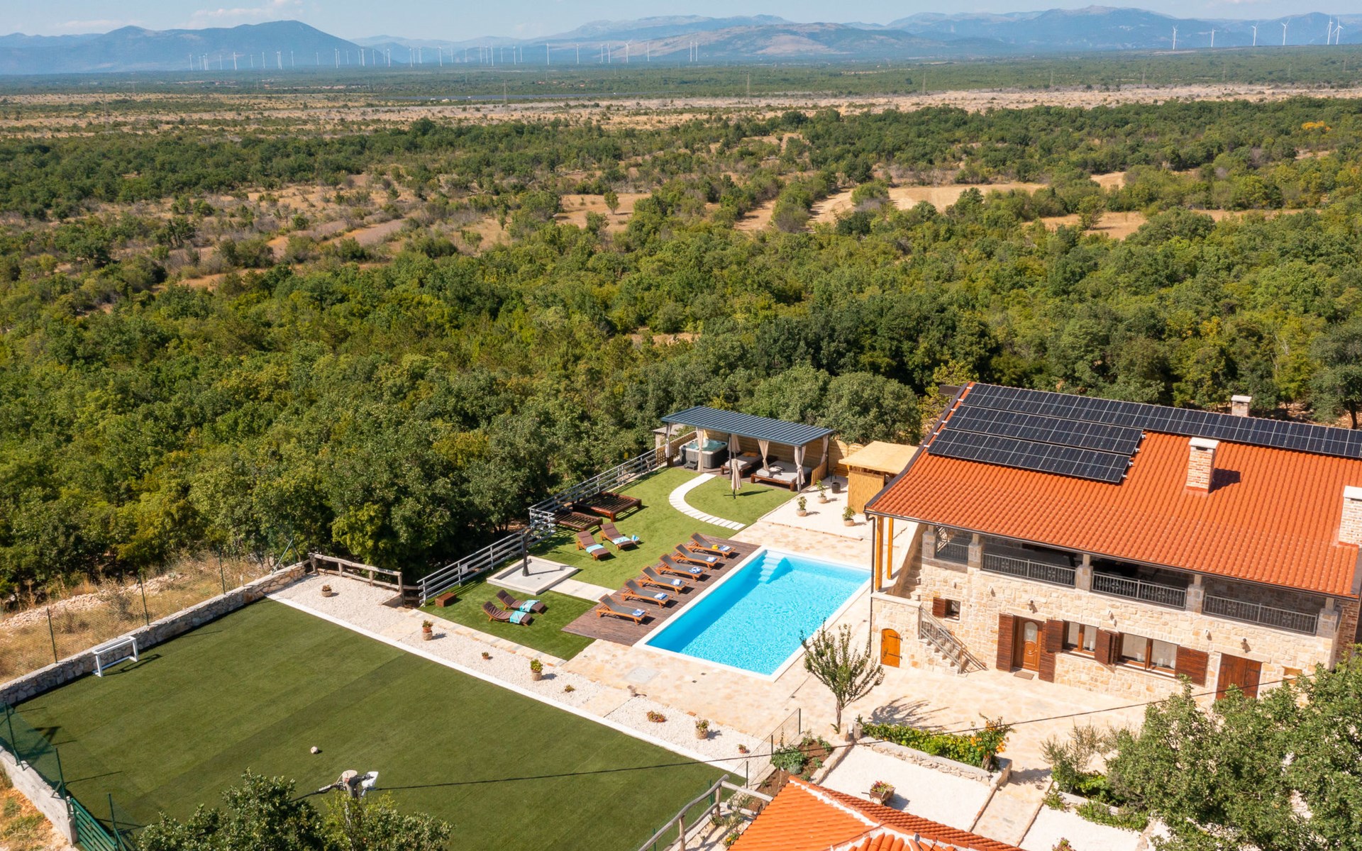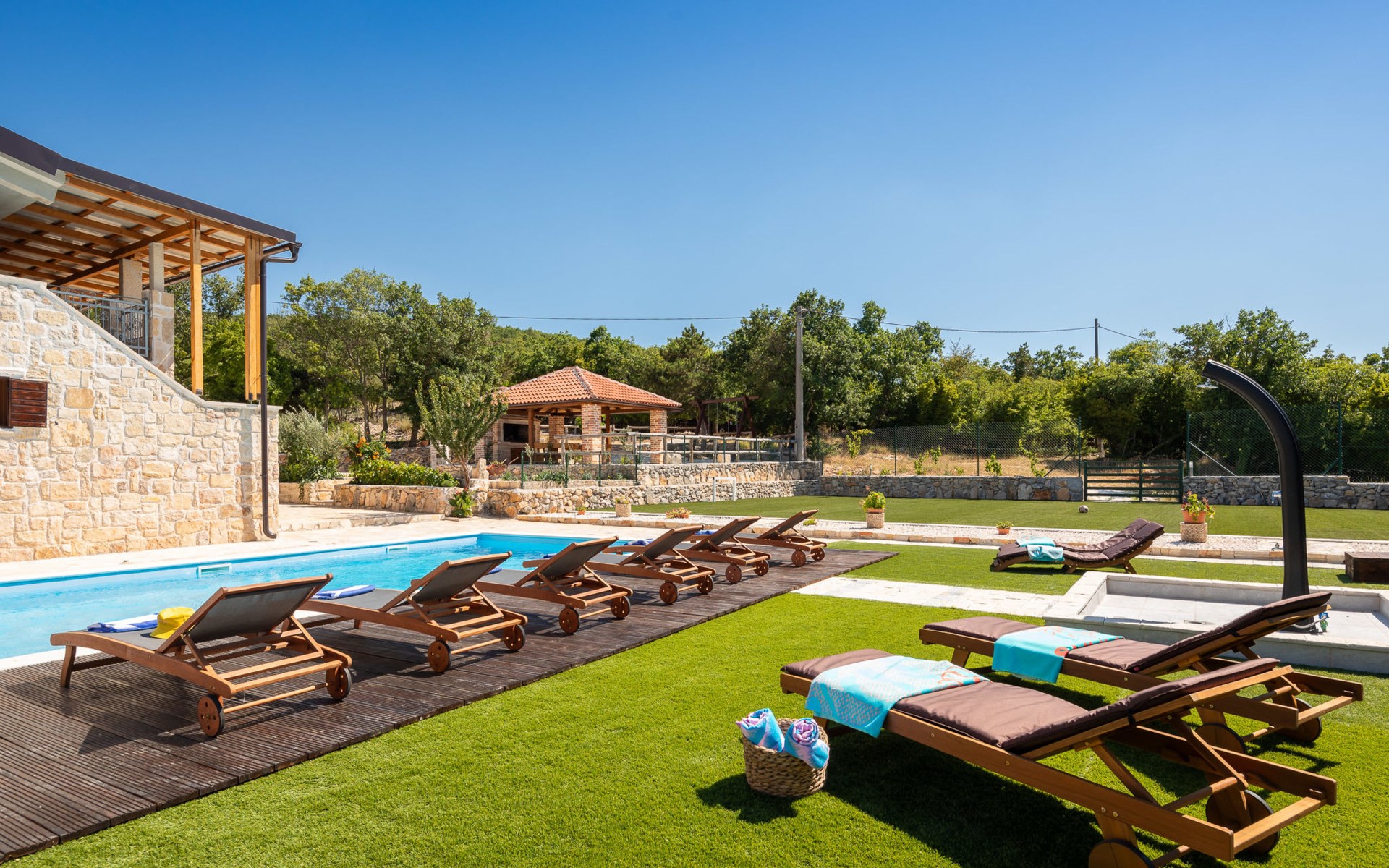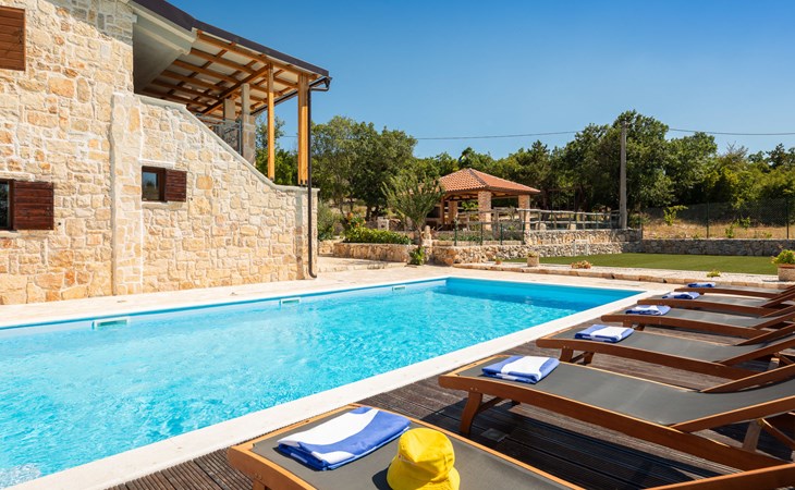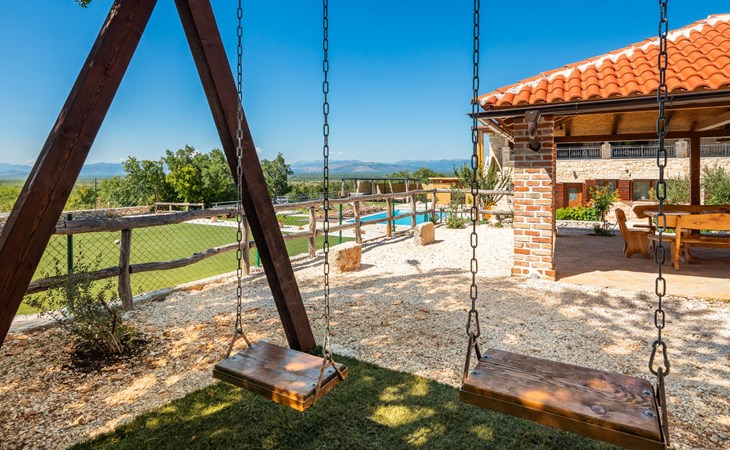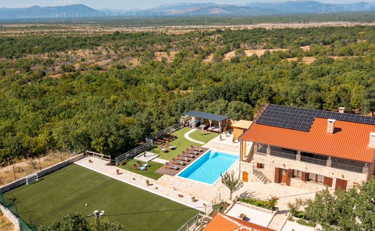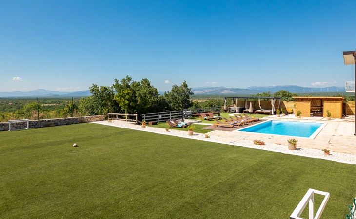 Lukar 3 km from Oklaj: Single-family house "Perva". In a quiet, sunny position, 48 km from the sea, in the countryside. Private: property 3'500 m2 (fenced), swimming pool angular, heated (10 x 5 m, depth 150 cm, seasonal availability: 15.May. - 30.Sep.) with internal staircase. Outdoor shower, hot tub, table tennis, arbour (30 m2), terrace (30 m2), garden furniture, barbecue, children's playground (swing). In the house: internet access, fitness room, trampoline, washing machine, tumble dryer. Parking (for 6 cars) at the house on the premises. Shop 3 km, restaurant 17 km, café 3 km, bus stop 3.5 km, pebble beach 48 km. Cycle lane 2 km. Nearby attractions: NP Krka 28 km.
