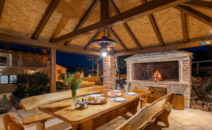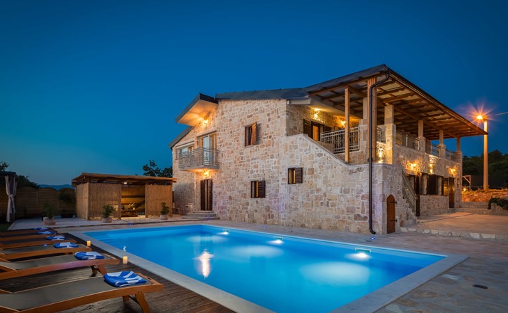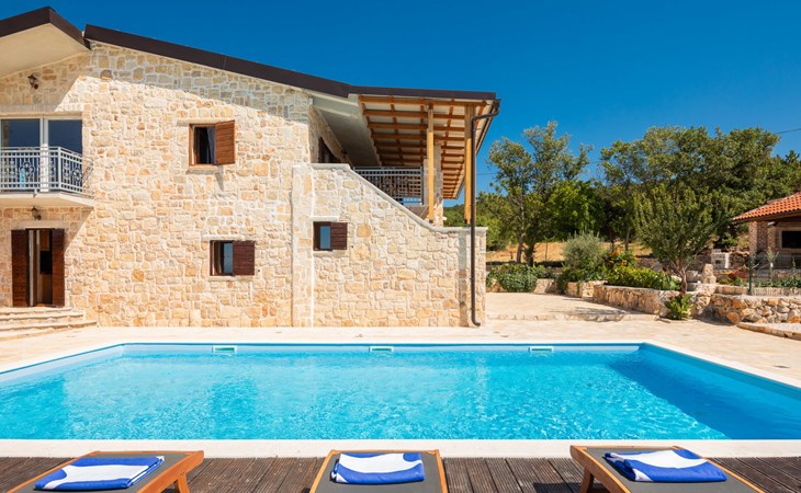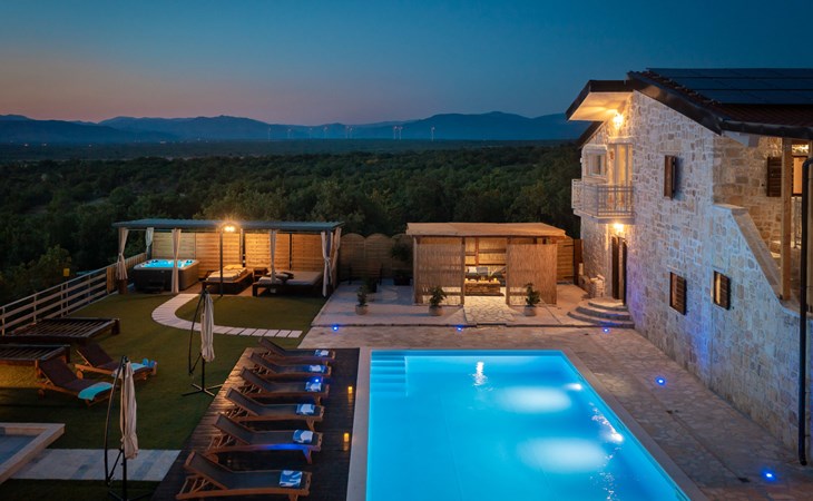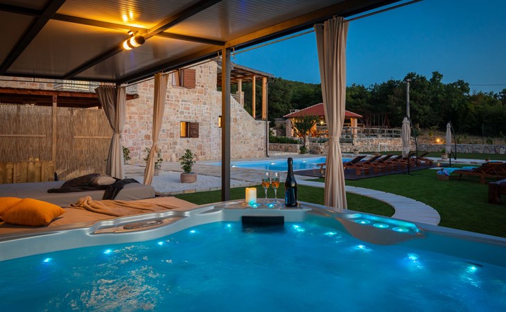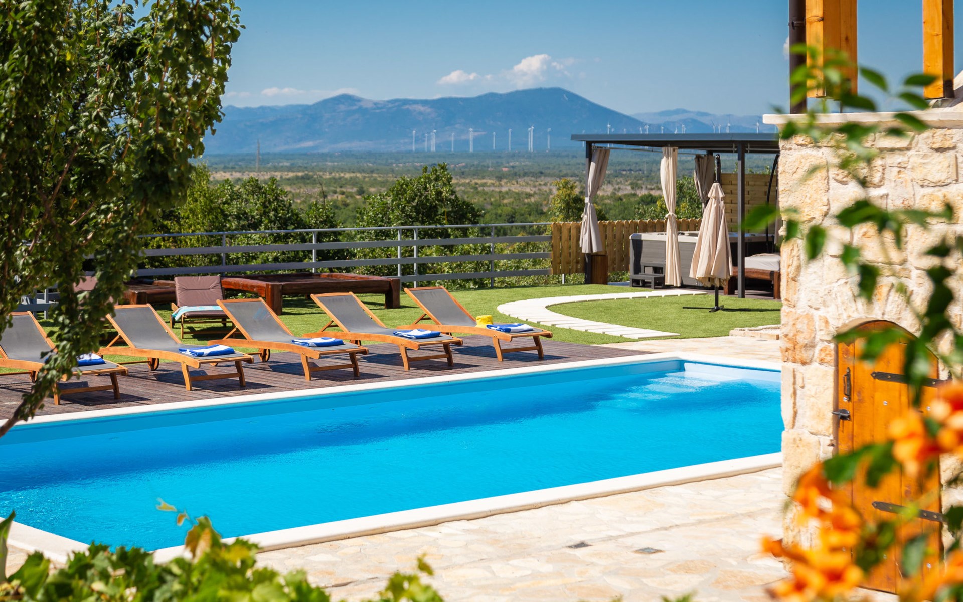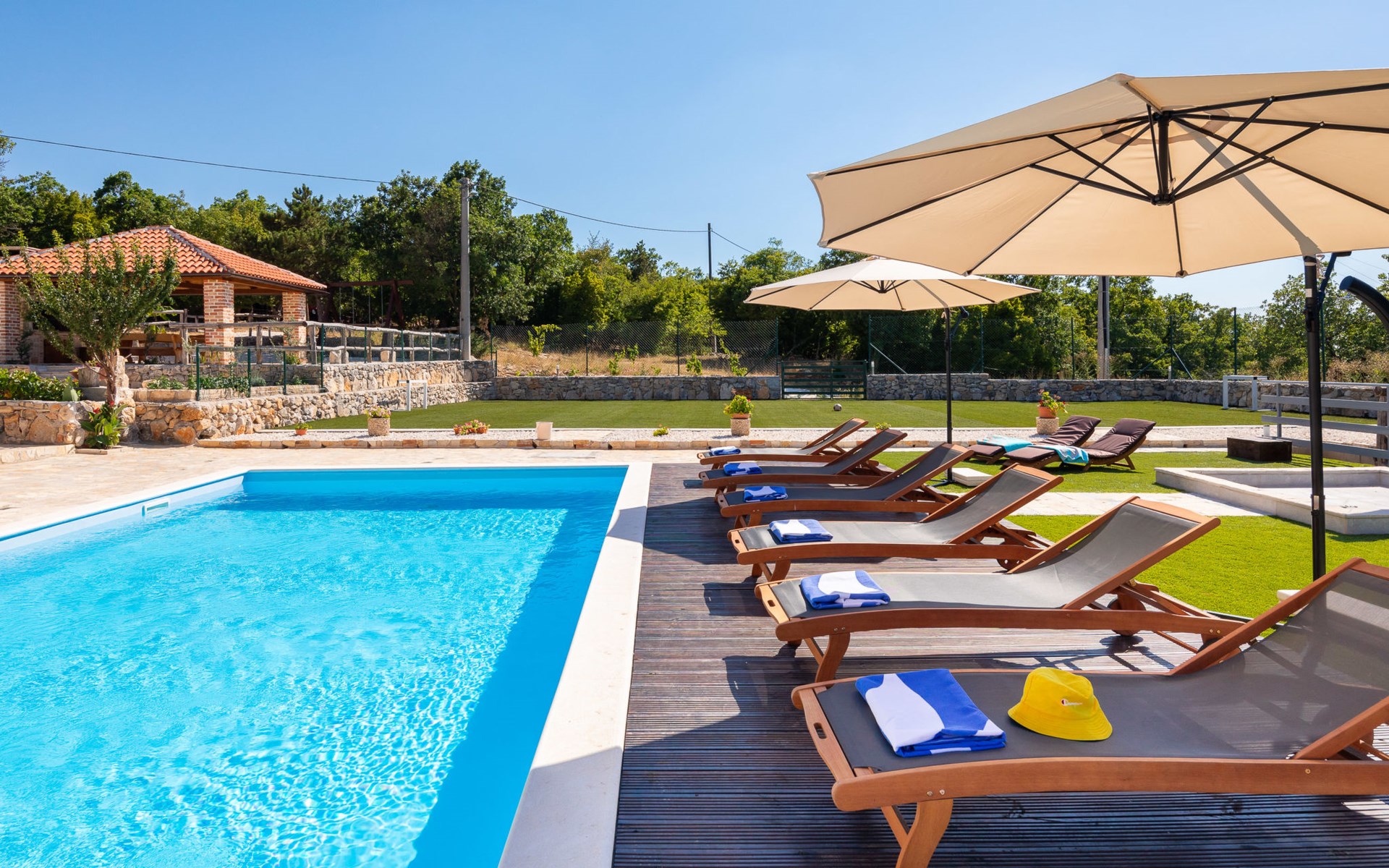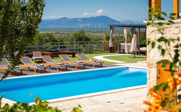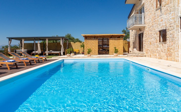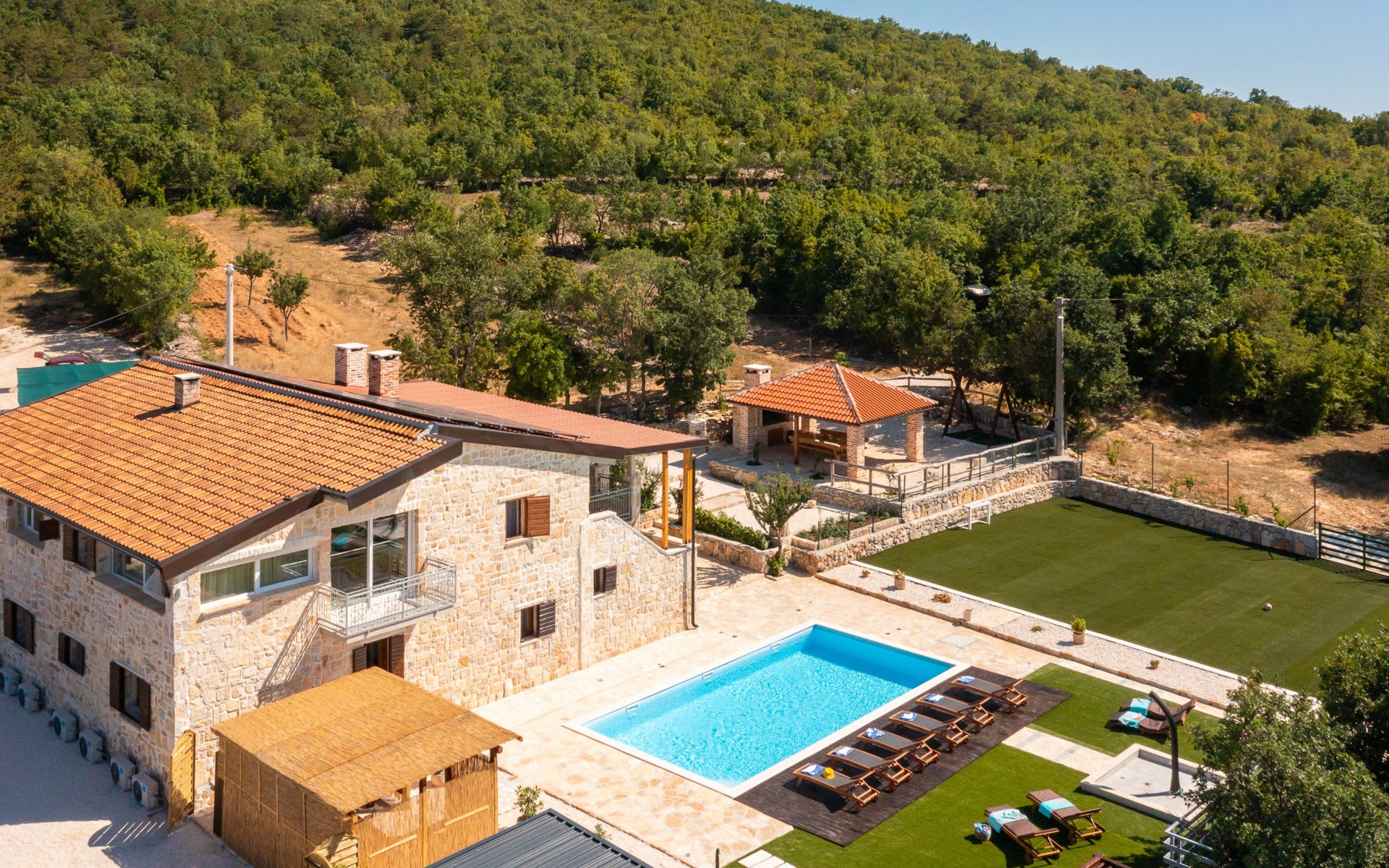 Lukar 3 km from Oklaj: Single-family house "Perva". In a quiet, sunny position, 48 km from the sea, in the countryside. Private: property 3'500 m2 (fenced), swimming pool angular, heated (10 x 5 m, depth 150 cm, seasonal availability: 15.May. - 30.Sep.) with internal staircase. Outdoor shower, hot tub, table tennis, arbour (30 m2), terrace (30 m2), garden furniture, barbecue, children's playground (swing). In the house: internet access, fitness room, trampoline, washing machine, tumble dryer. Parking (for 6 cars) at the house on the premises. Shop 3 km, restaurant 17 km, café 3 km, bus stop 3.5 km, pebble beach 48 km. Cycle lane 2 km. Nearby attractions: NP Krka 28 km.