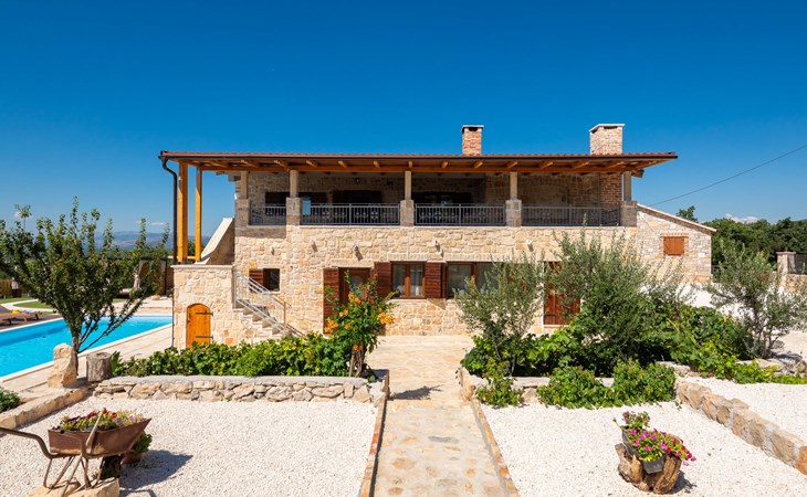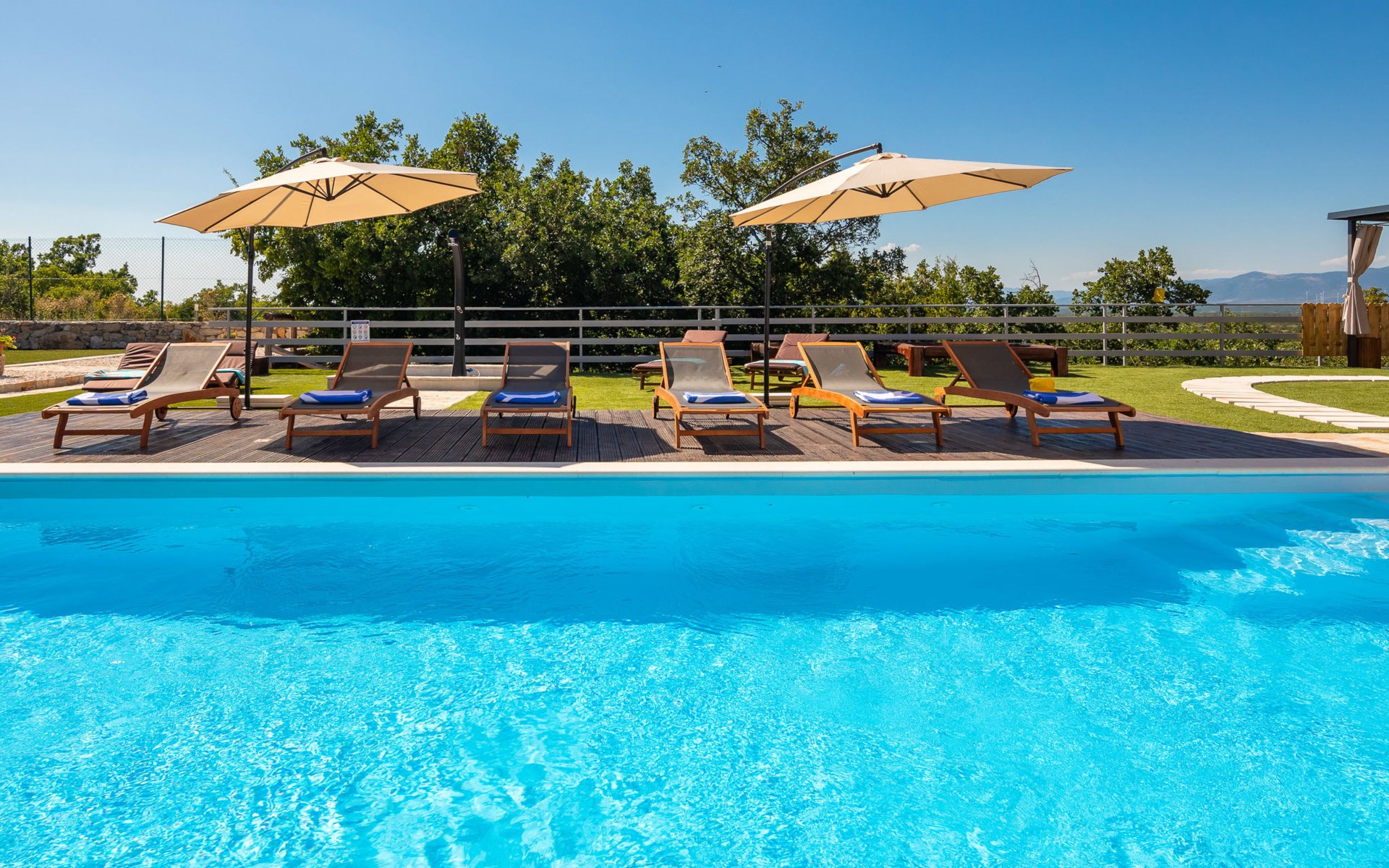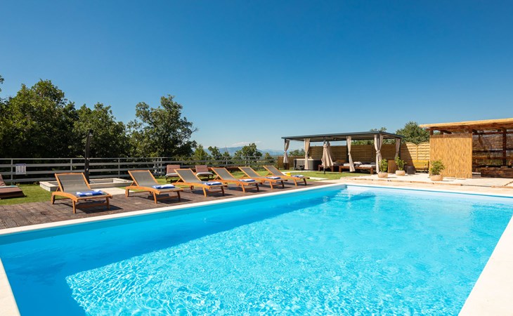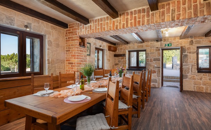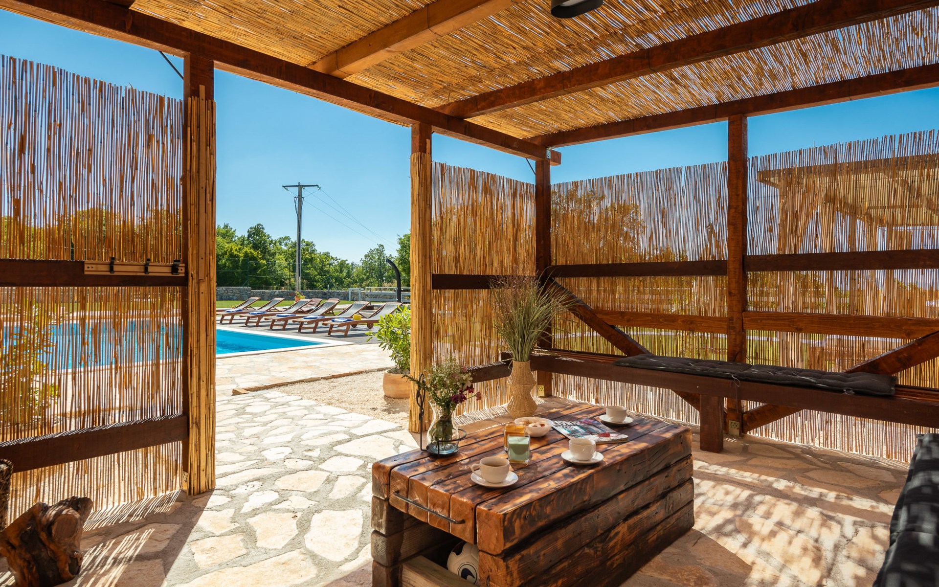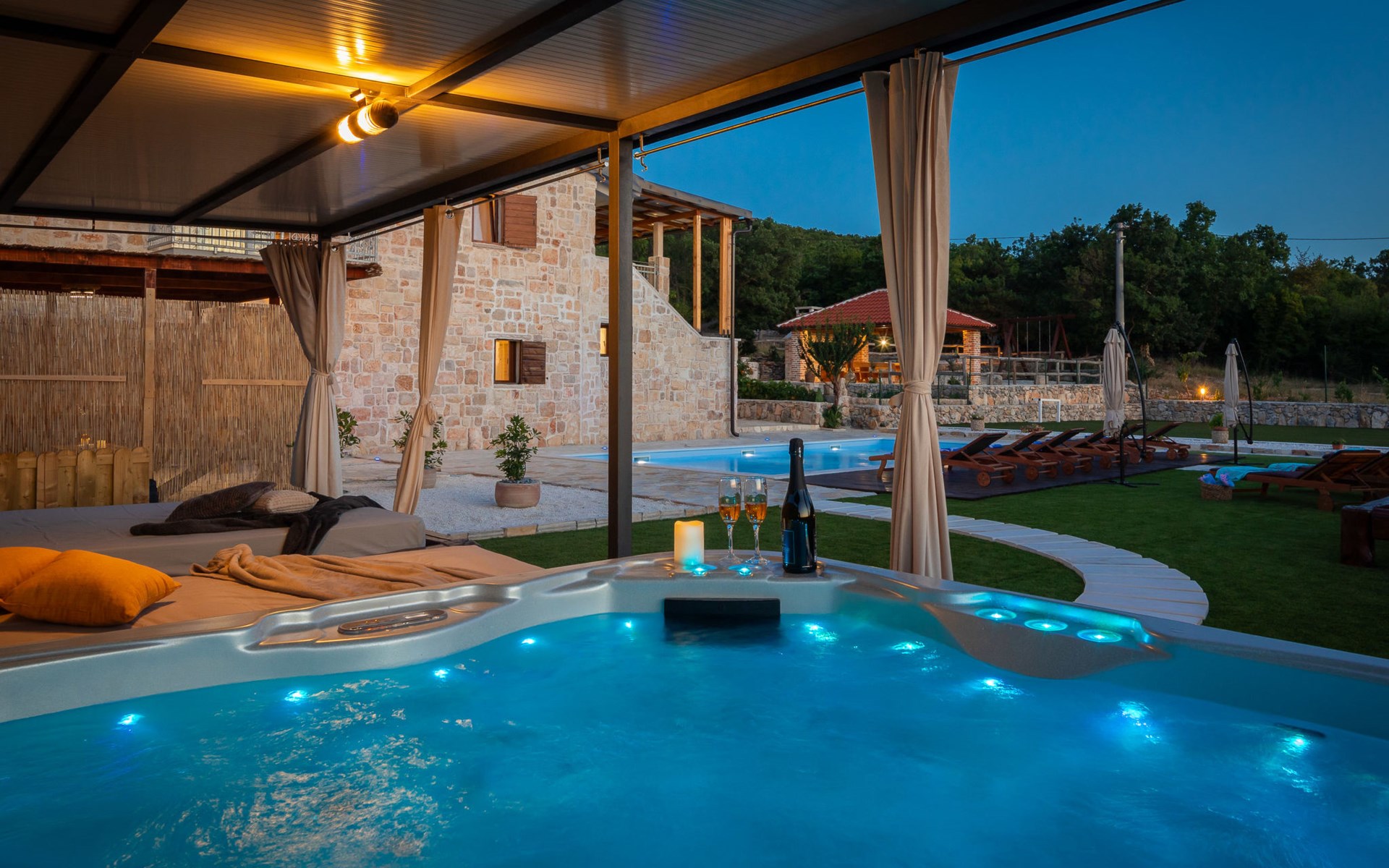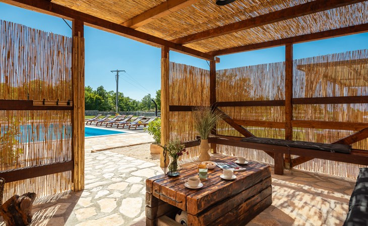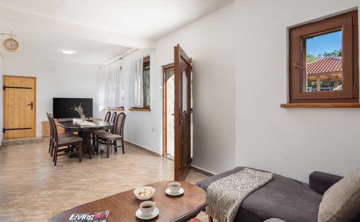 Lukar 3 km from Oklaj: Single-family house "Perva". In a quiet, sunny position, 48 km from the sea, in the countryside. Private: property 3'500 m2 (fenced), swimming pool angular, heated (10 x 5 m, depth 150 cm, seasonal availability: 15.May. - 30.Sep.) with internal staircase. Outdoor shower, hot tub, table tennis, arbour (30 m2), terrace (30 m2), garden furniture, barbecue, children's playground (swing). In the house: internet access, fitness room, trampoline, washing machine, tumble dryer. Parking (for 6 cars) at the house on the premises. Shop 3 km, restaurant 17 km, café 3 km, bus stop 3.5 km, pebble beach 48 km. Cycle lane 2 km. Nearby attractions: NP Krka 28 km.