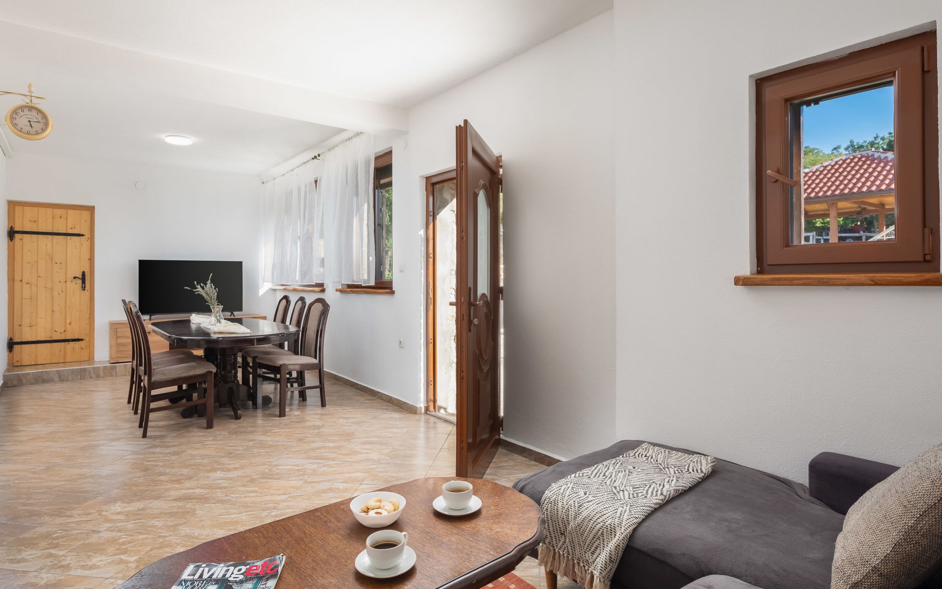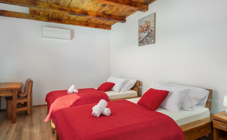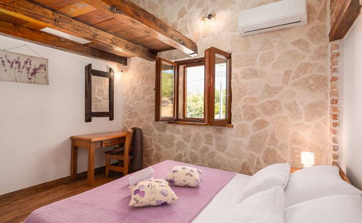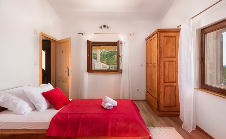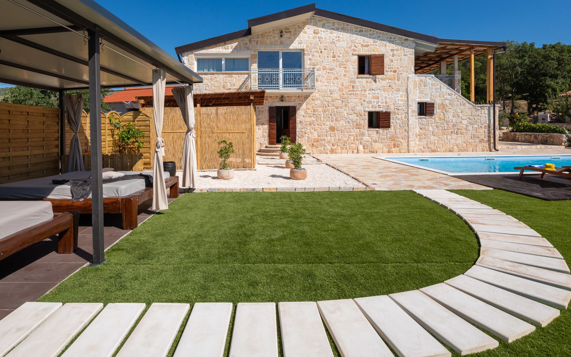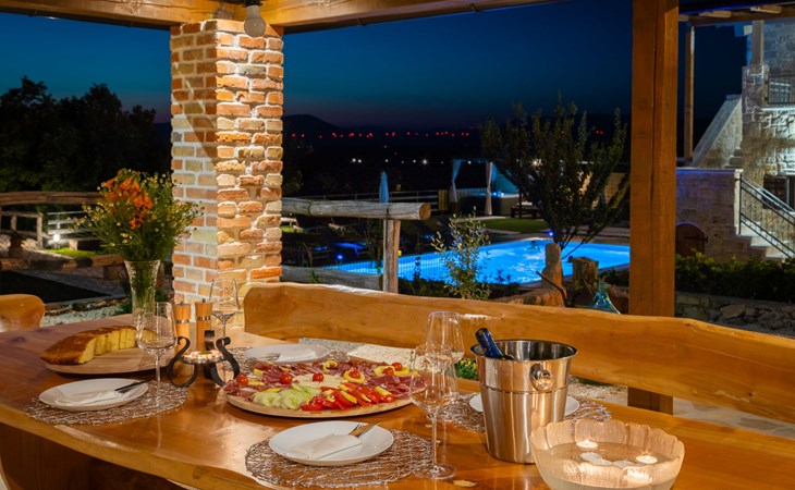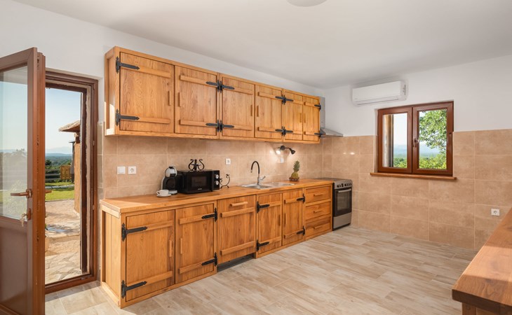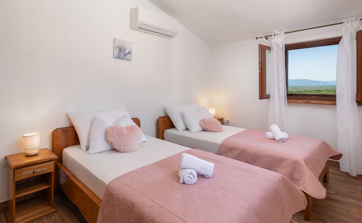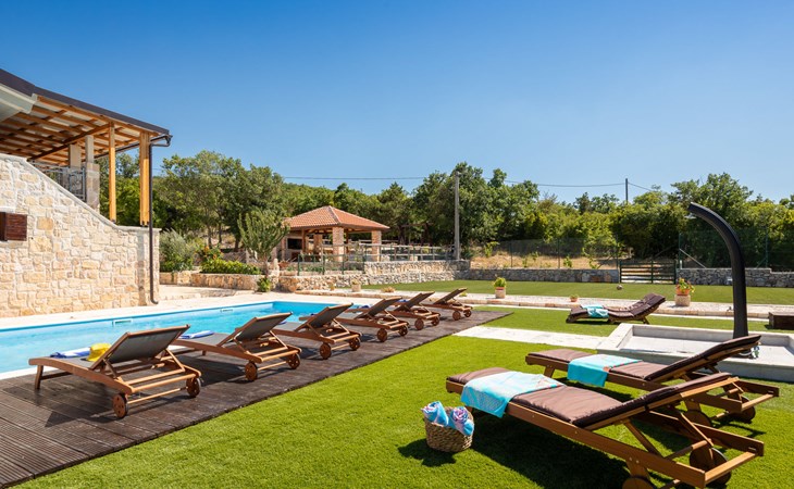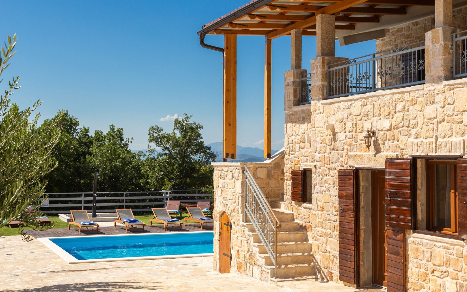 Lukar 3 km from Oklaj: Single-family house "Perva". In a quiet, sunny position, 48 km from the sea, in the countryside. Private: property 3'500 m2 (fenced), swimming pool angular, heated (10 x 5 m, depth 150 cm, seasonal availability: 15.May. - 30.Sep.) with internal staircase. Outdoor shower, hot tub, table tennis, arbour (30 m2), terrace (30 m2), garden furniture, barbecue, children's playground (swing). In the house: internet access, fitness room, trampoline, washing machine, tumble dryer. Parking (for 6 cars) at the house on the premises. Shop 3 km, restaurant 17 km, café 3 km, bus stop 3.5 km, pebble beach 48 km. Cycle lane 2 km. Nearby attractions: NP Krka 28 km.