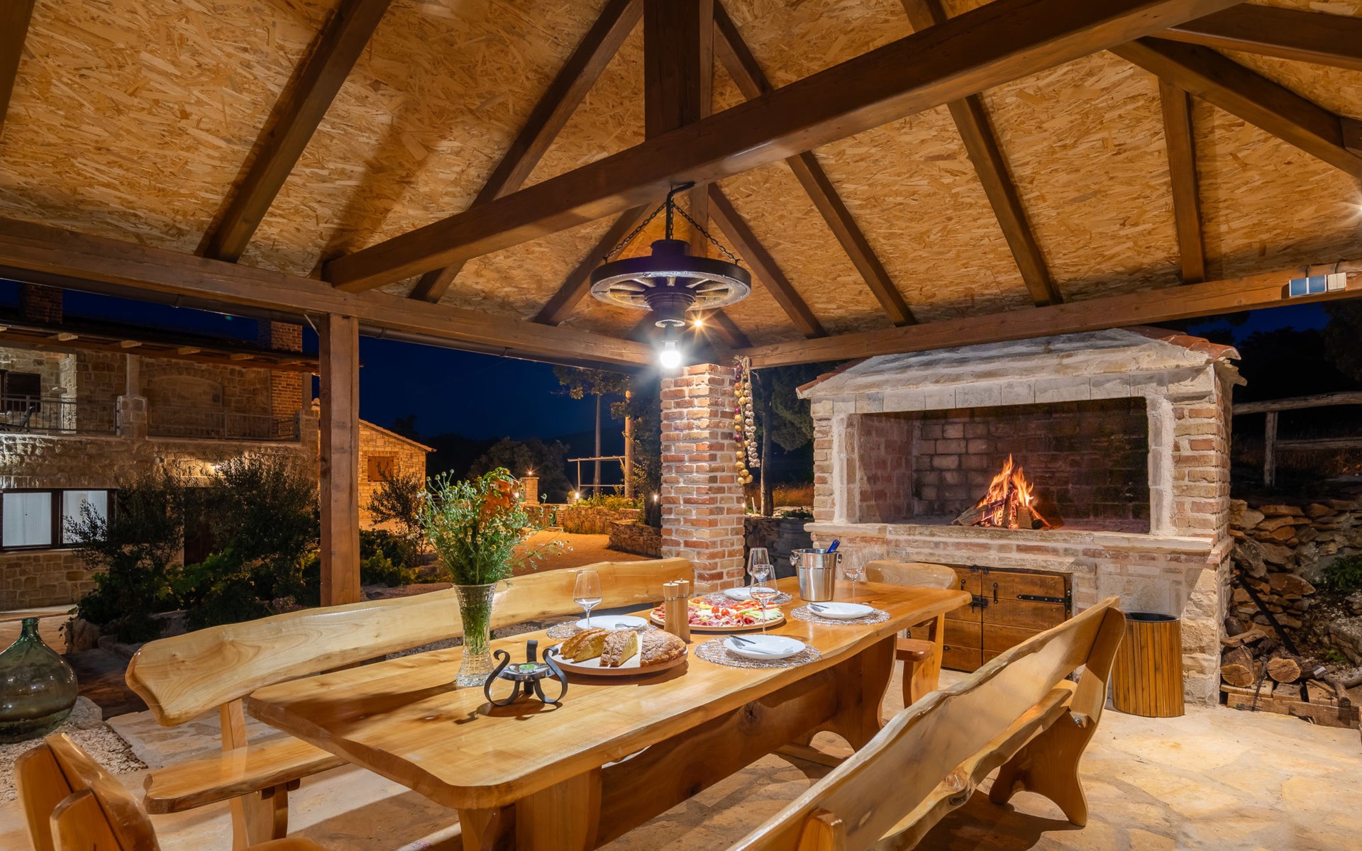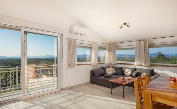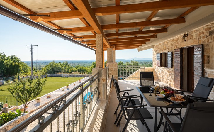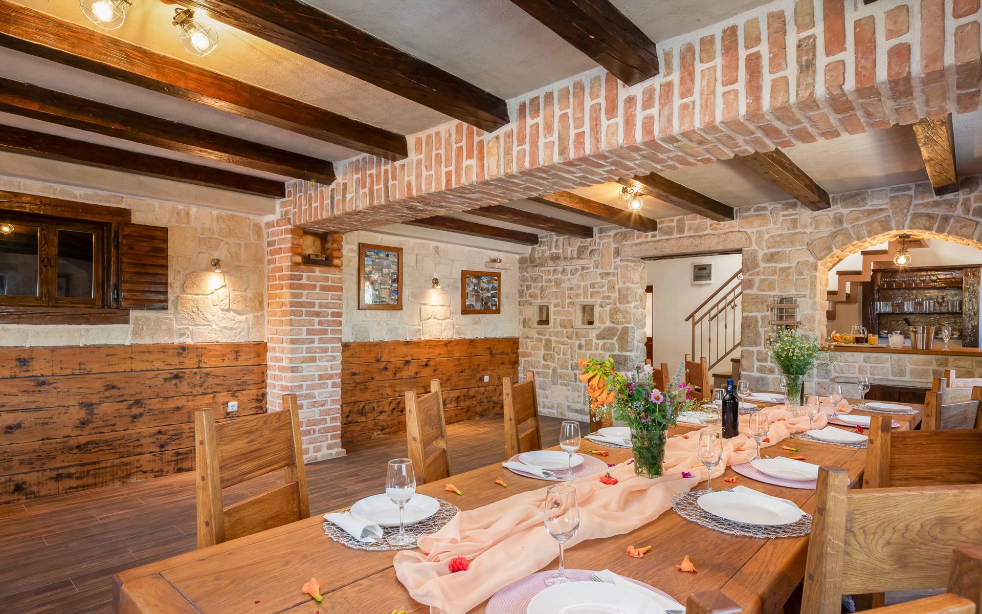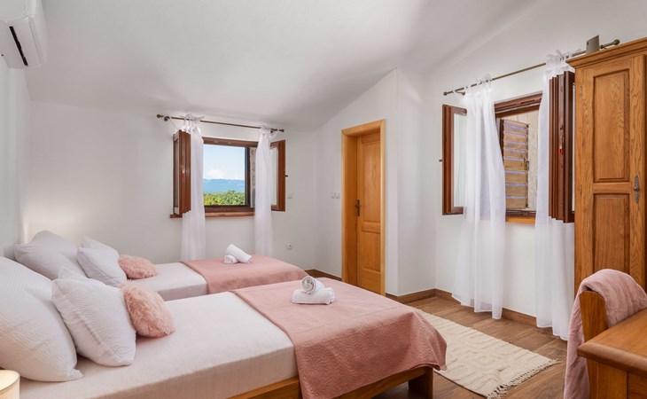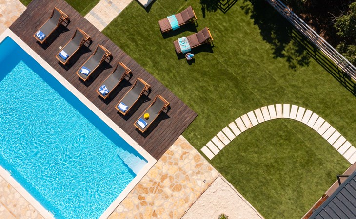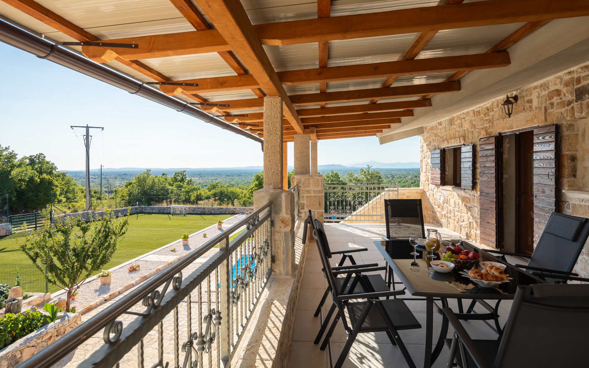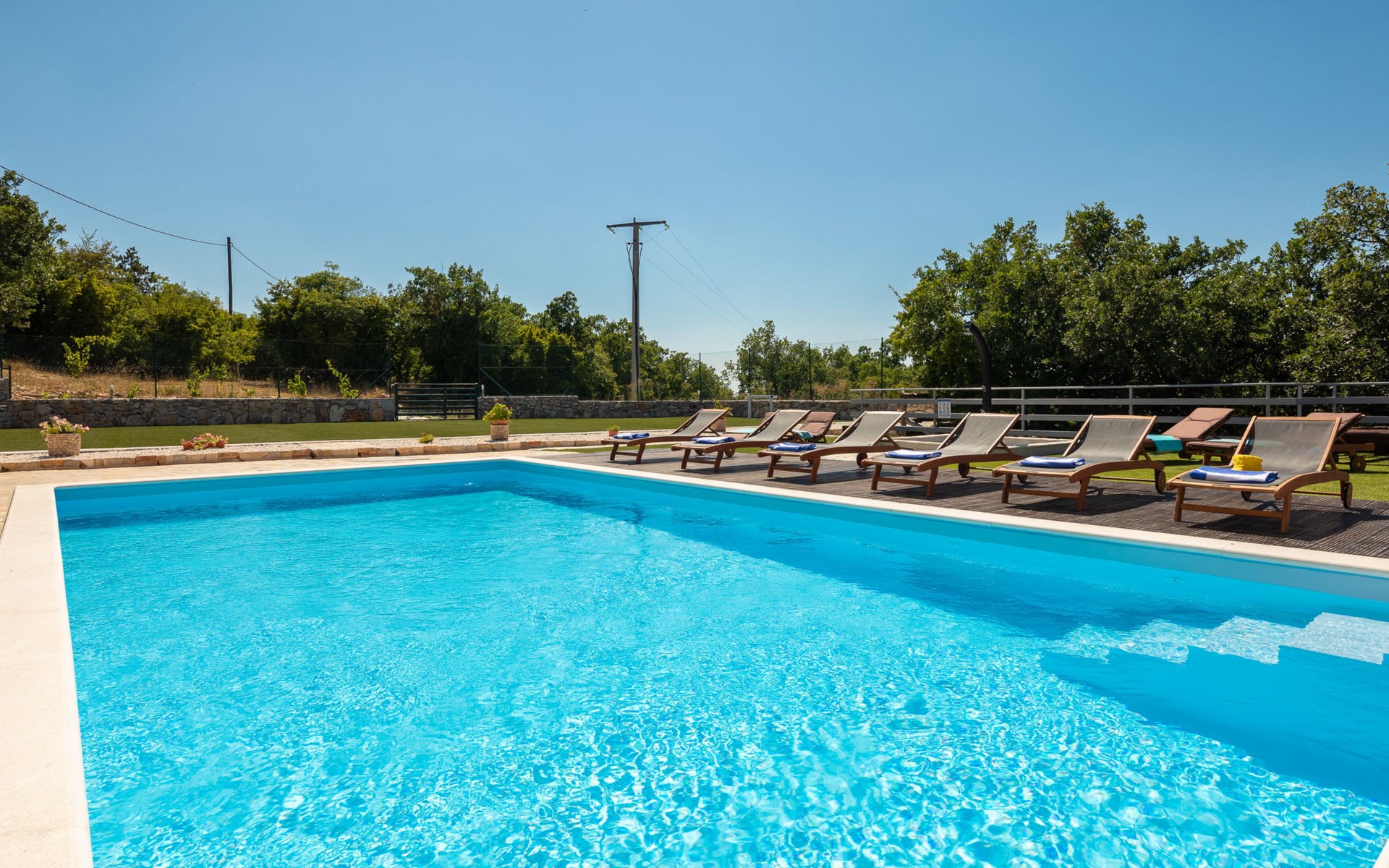Lukar 3 km from Oklaj: Single-family house "Perva". In a quiet, sunny position, 48 km from the sea, in the countryside. Private: property 3'500 m2 (fenced), swimming pool angular, heated (10 x 5 m, depth 150 cm, seasonal availability: 15.May. - 30.Sep.) with internal staircase. Outdoor shower, hot tub, table tennis, arbour (30 m2), terrace (30 m2), garden furniture, barbecue, children's playground (swing). In the house: internet access, fitness room, trampoline, washing machine, tumble dryer. Parking (for 6 cars) at the house on the premises. Shop 3 km, restaurant 17 km, café 3 km, bus stop 3.5 km, pebble beach 48 km. Cycle lane 2 km. Nearby attractions: NP Krka 28 km.