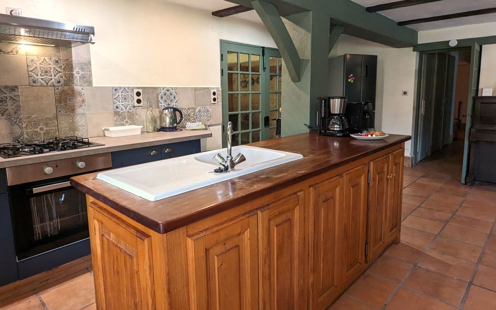 Equipped with dishwasher, refrigerator with separate freezer compartment, microwave, electric coffee maker (filter and Nespresso capsules), 4-burner hob, toaster, electric kettle, kitchen utensils and crockery.