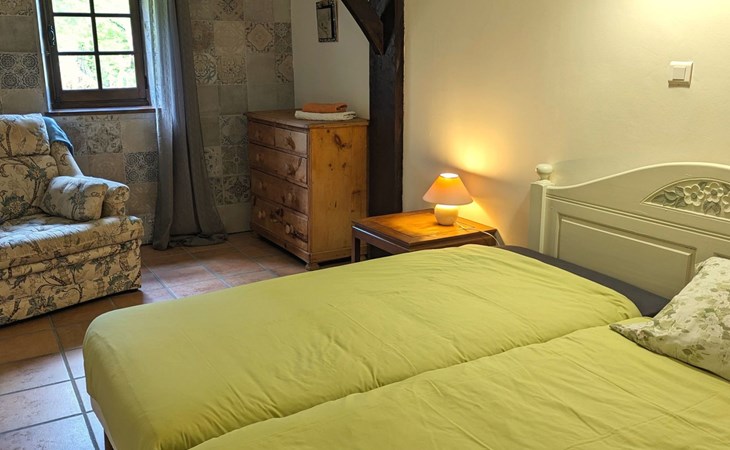 Bedroom 1: Double bed (160-200 cm), view of the private pond, adjoining bathroom with bathtub, double sink and WC.Bedroom 2: Twin beds (2x 90-190 cm), view of the private pond.Bed linen and towels provided (1 set per person), beds made on arrival.Baby bed (umbrella) and high chair available