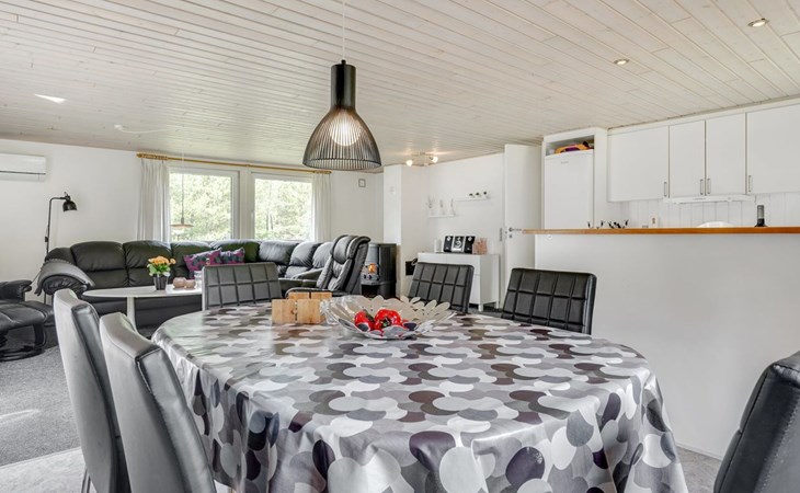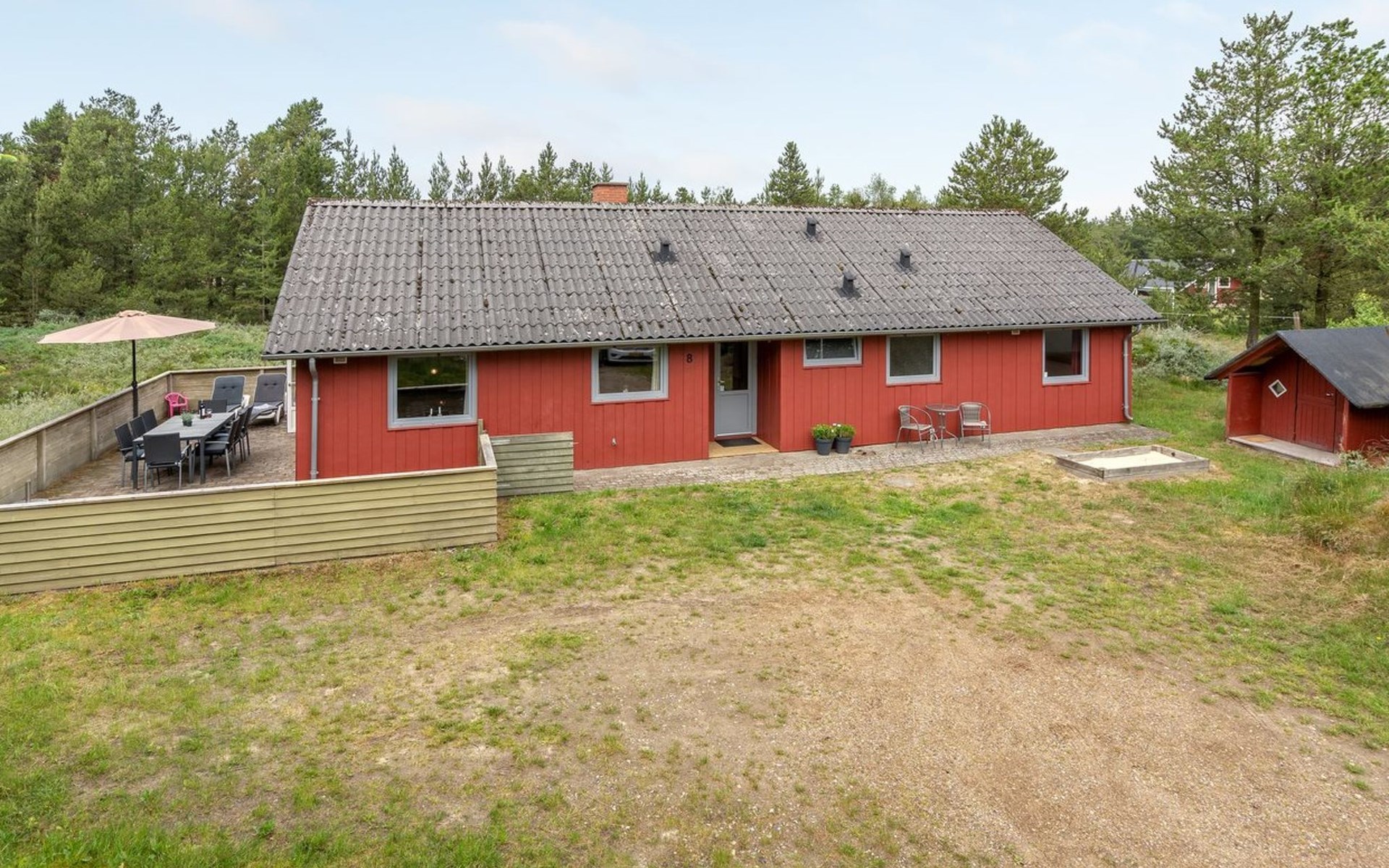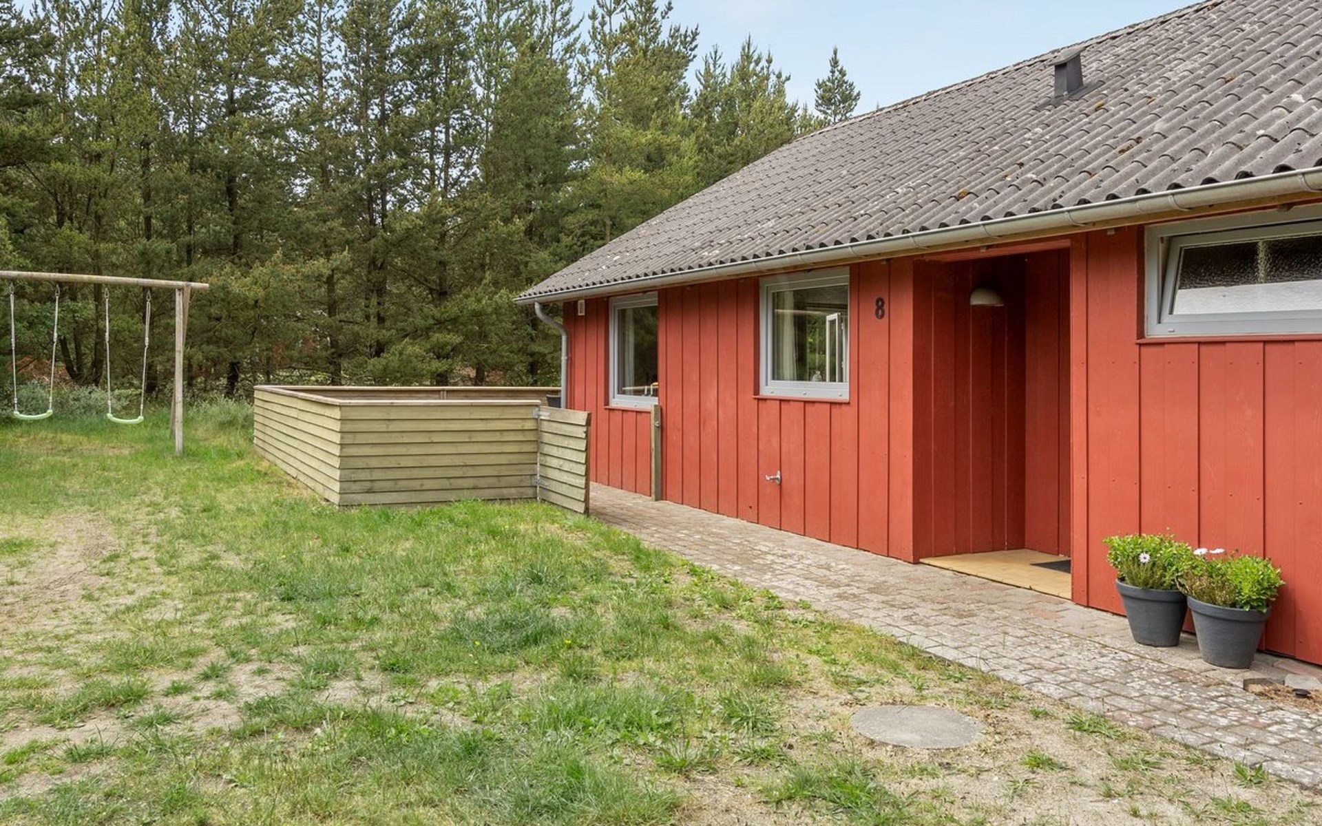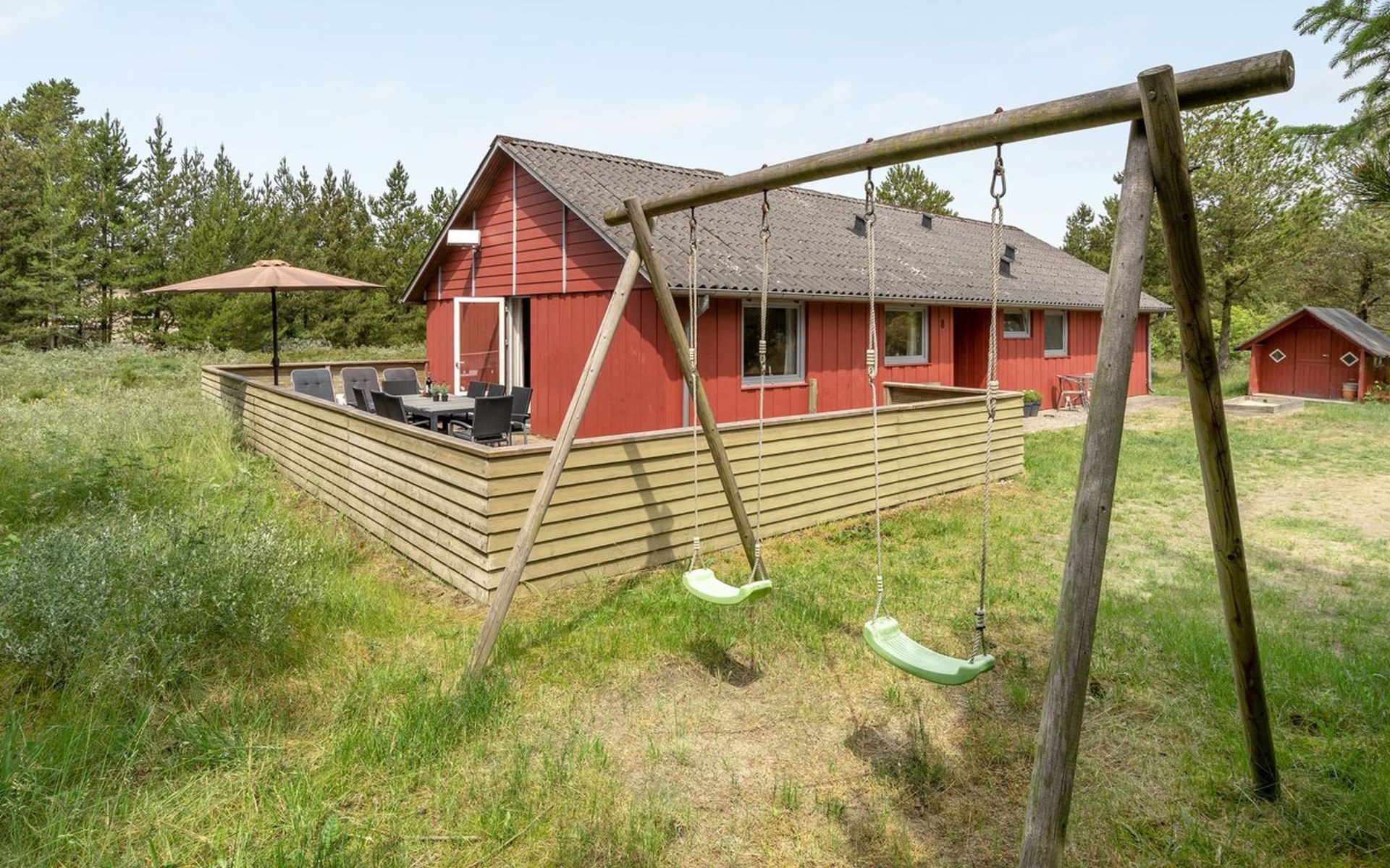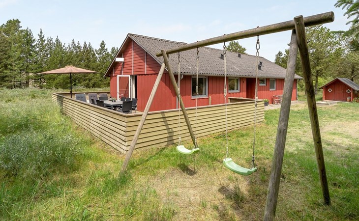 Single-family house, built in 1975. 1.4 km from the sea. Private: natural state property 2'533 m2. Terrace (36 m2), children's playground (swing). In the house: sauna, washing machine, tumble dryer. E-charging station. Grocery 1.6 km. Golf course 1 km. The owner does not accept any youth groups.