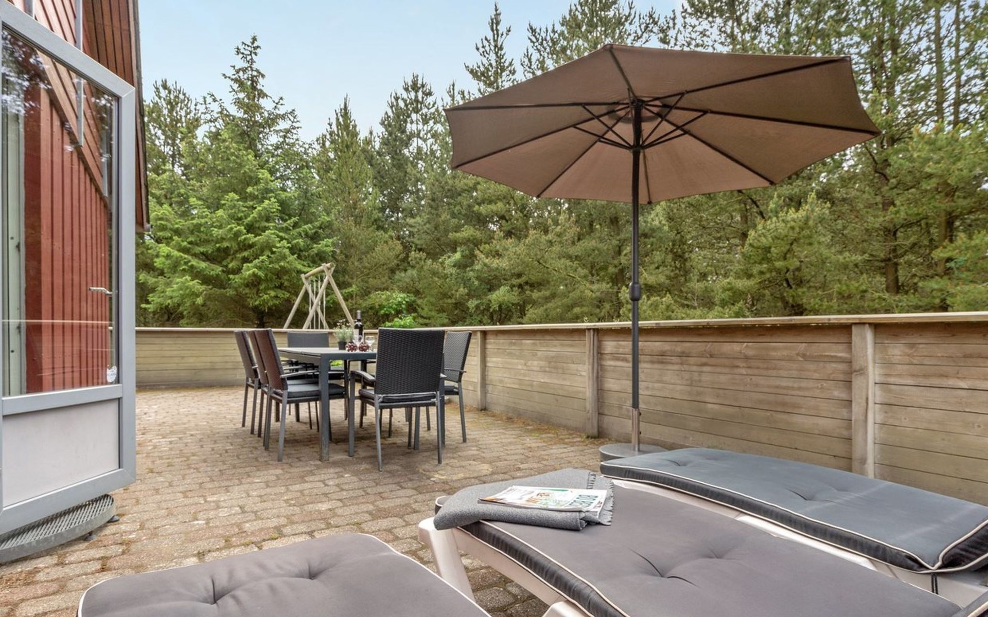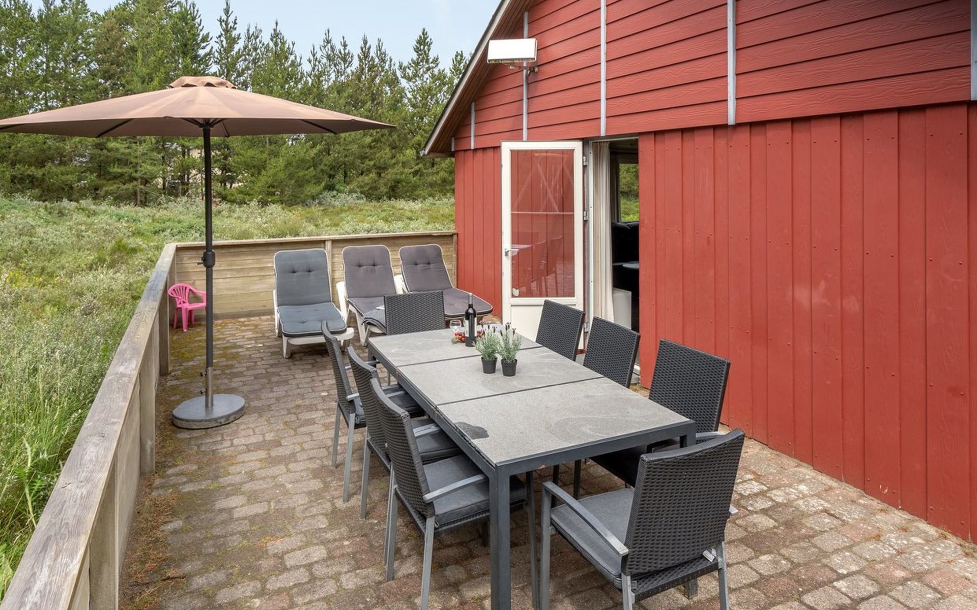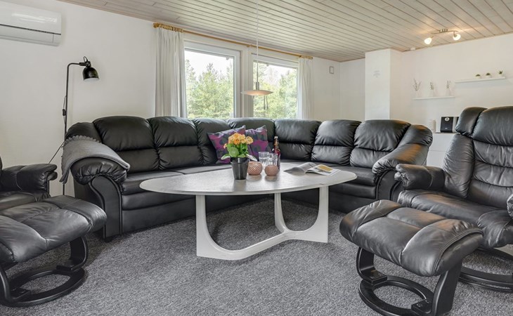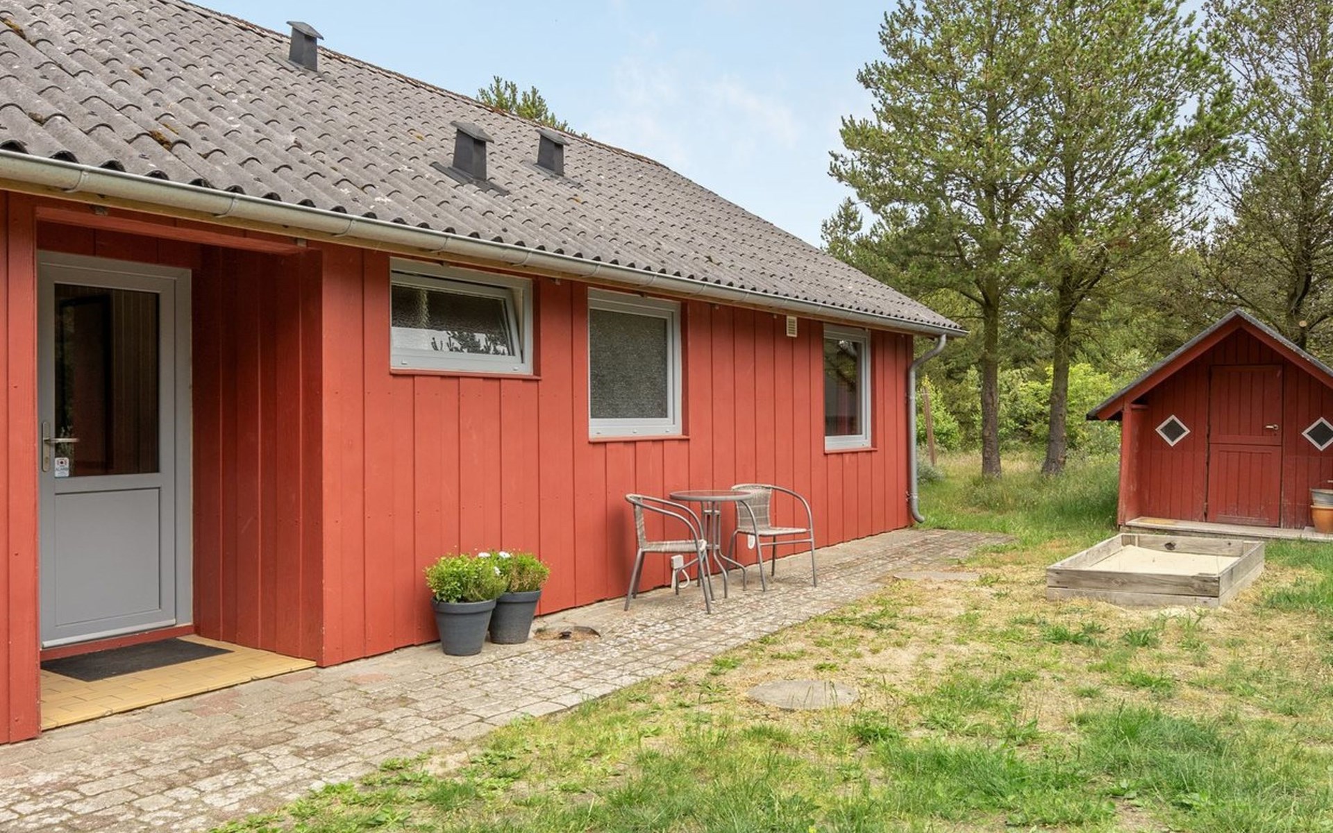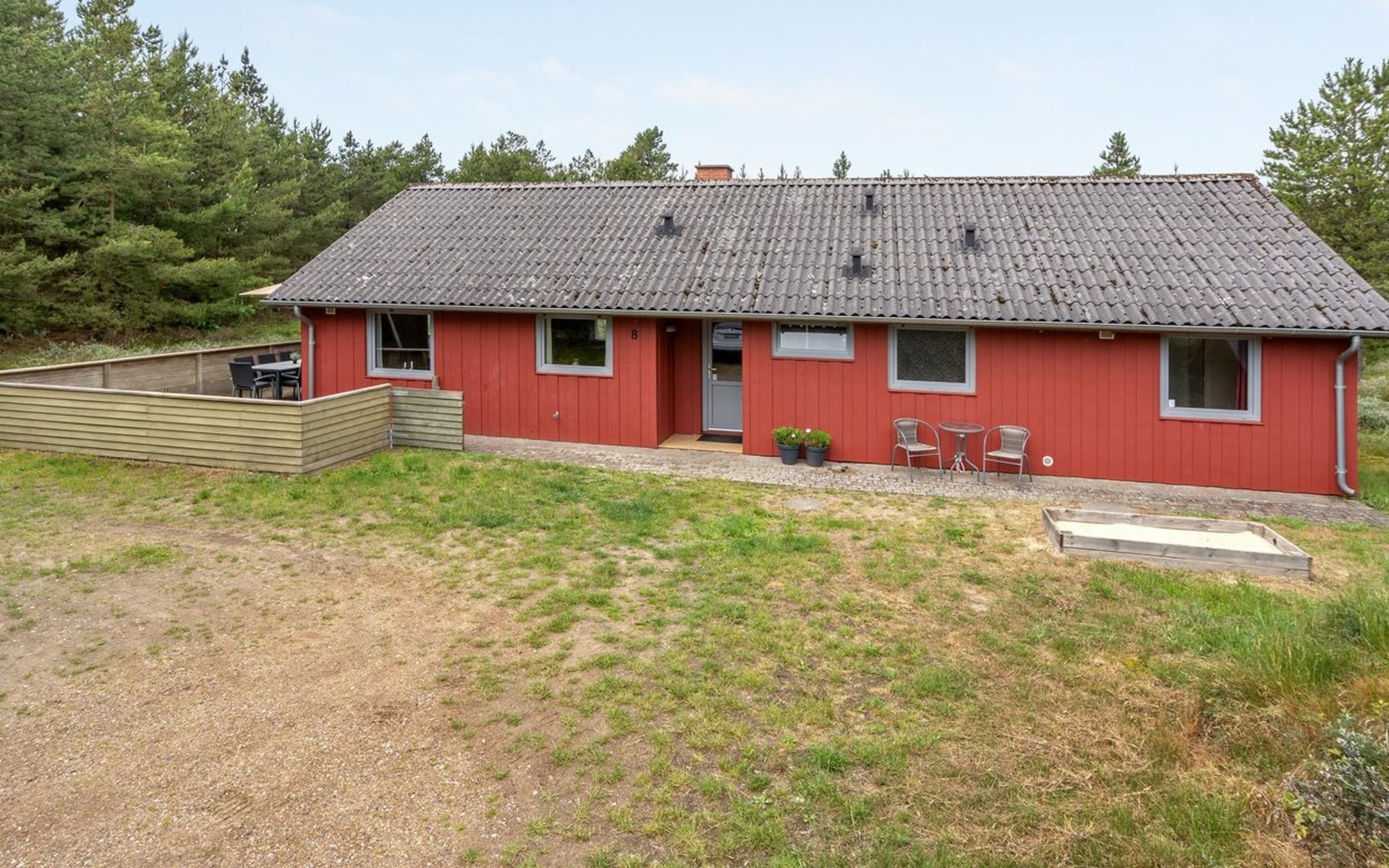 Single-family house, built in 1975. 1.4 km from the sea. Private: natural state property 2'533 m2. Terrace (36 m2), children's playground (swing). In the house: sauna, washing machine, tumble dryer. E-charging station. Grocery 1.6 km. Golf course 1 km. The owner does not accept any youth groups.