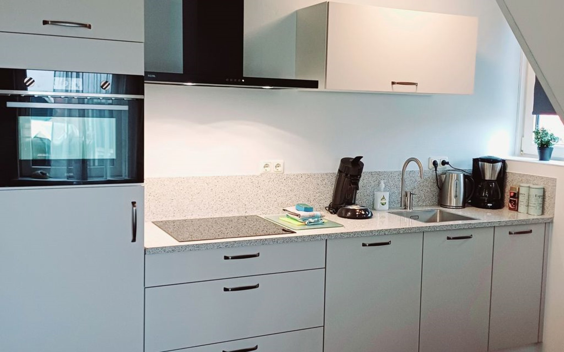 The spacious living area is approximately 25 m2 and is divided into the living room and an open-plan kitchen. In the cosy living room you will find two sofas, a television, a CD/DVD player, a radio and various board games. The kitchen is equipped with a dishwasher, fridge, cooker and microwave. The large dining table can seat the whole family. If required, we can provide a high chair for small children on request. The master bedroom has a double bed (box spring 180 x 200 cm), the children's room has two single beds of 80 x 200 cm. Bed linen and blankets are provided and included in the rental price. On request, the landlord can place an extra cot for children up to three years old. The stairs leading to the apartment are secured with a stair gate. The modern bathroom has a toilet, a bathtub and a shower. The entire flat is modern and brightly decorated. Wi-Fi is available throughout the flat. It also features central heating, making it ideal for trips during the cold autumn and winter months. On the ground floor you will find a washing machine, which you can use for free on request.