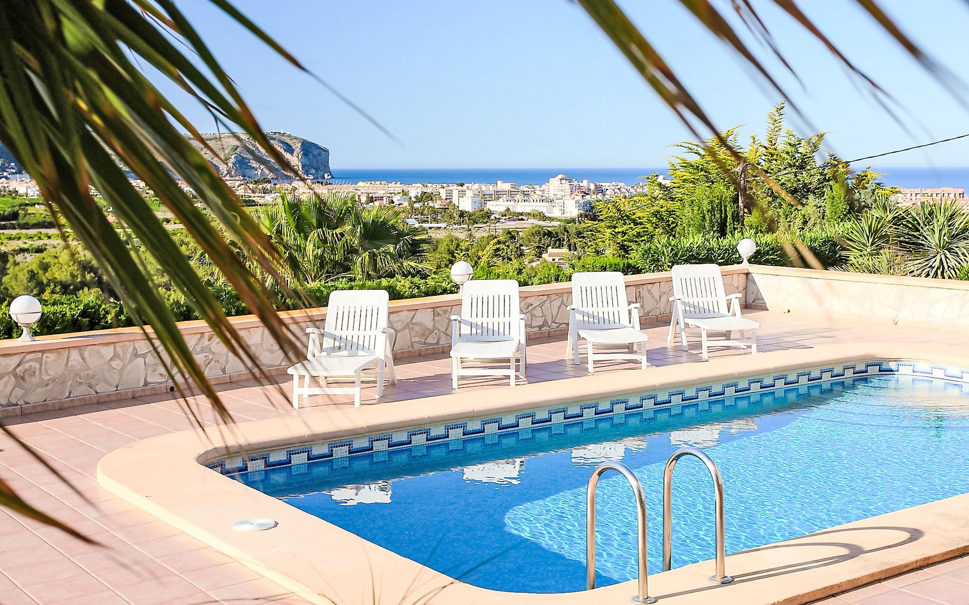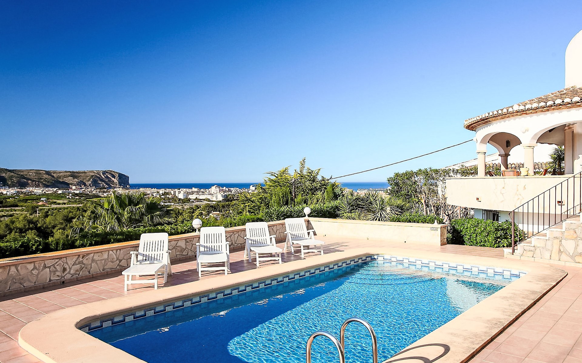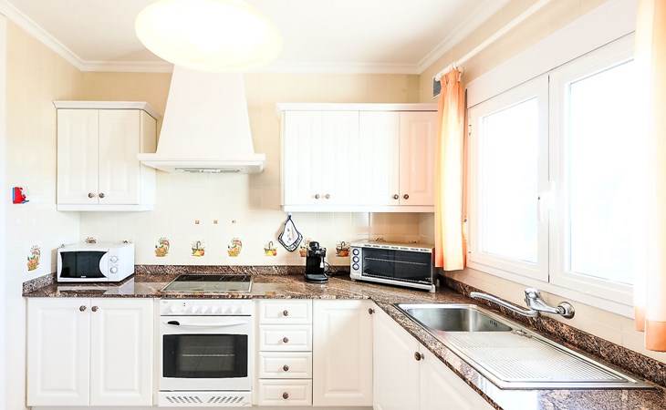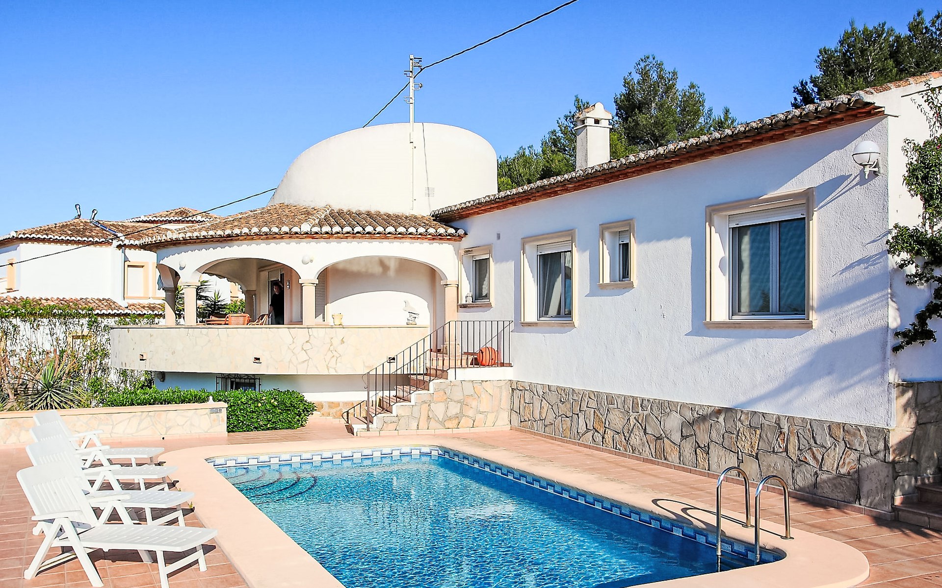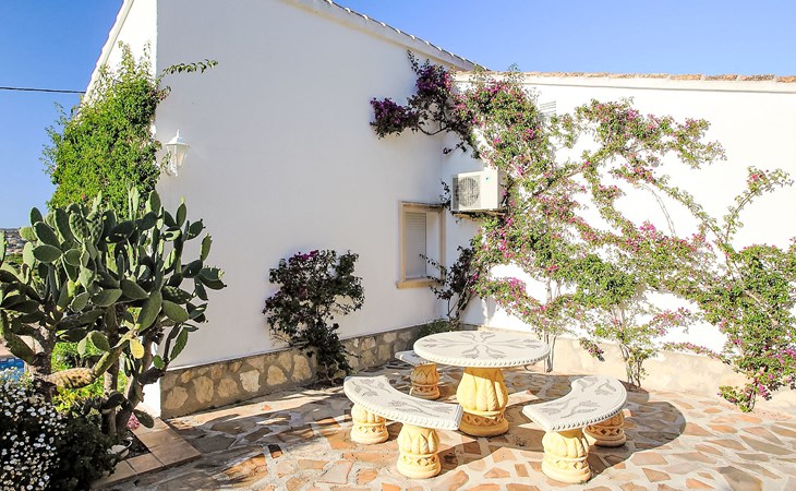 Beautiful house "Sara". In the district of Adsubia, in a quiet, sunny, elevated position in the residential district, 5 km from the sea. Private: garden 780 m2 (fenced) with wildlife garden, natural garden 780 m2, swimming pool with privacy (4 x 8 m, seasonal availability: 01.Jan. - 31.Dec.) with internal staircase. Outdoor shower. In the house: central heating system. Supermarket 4 km, restaurant 4 km, bus stop "Mas y Mas carretera del Pla" 1.9 km, sandy beach "Arenal" 5 km. Golf course (9 hole) 3 km. Groups of teenagers on request only.