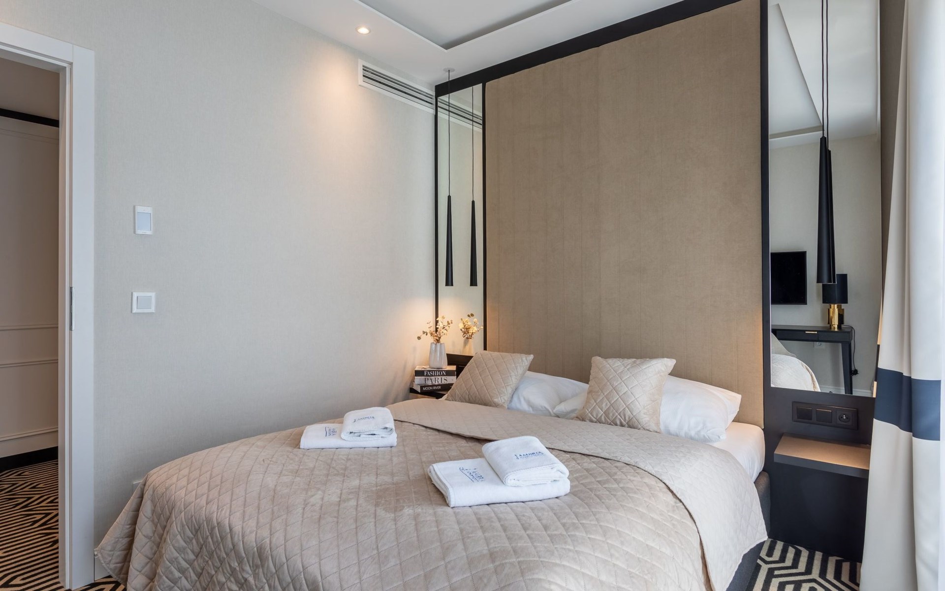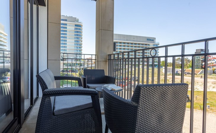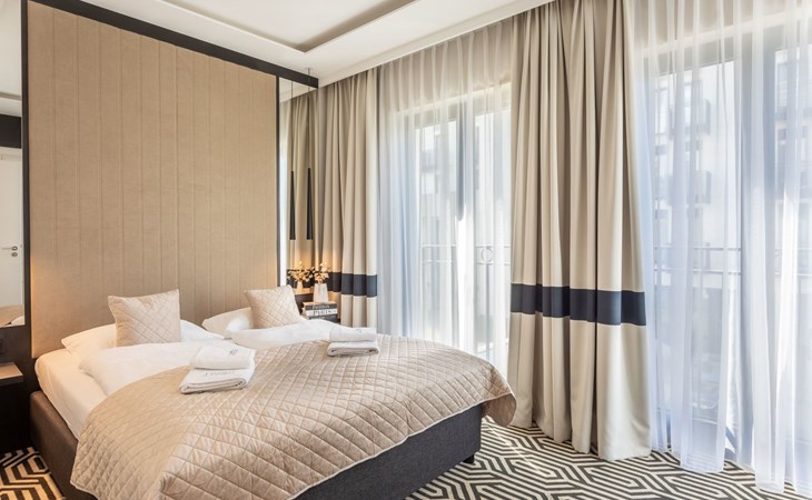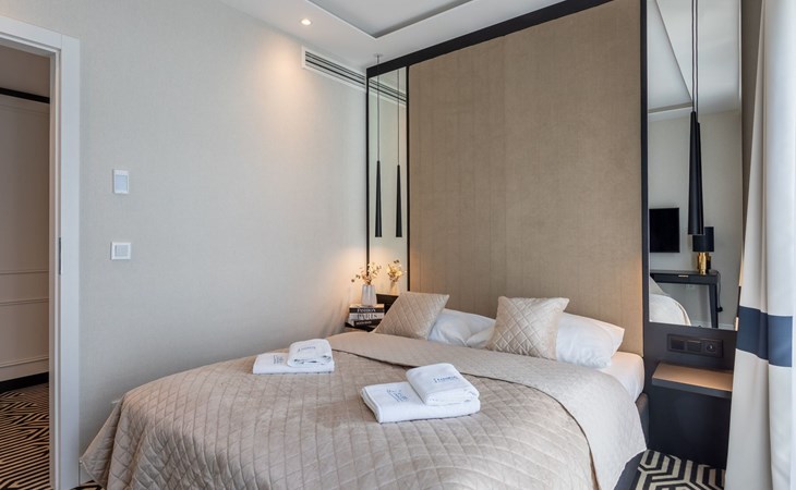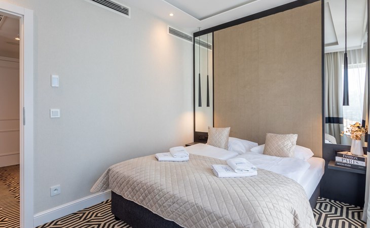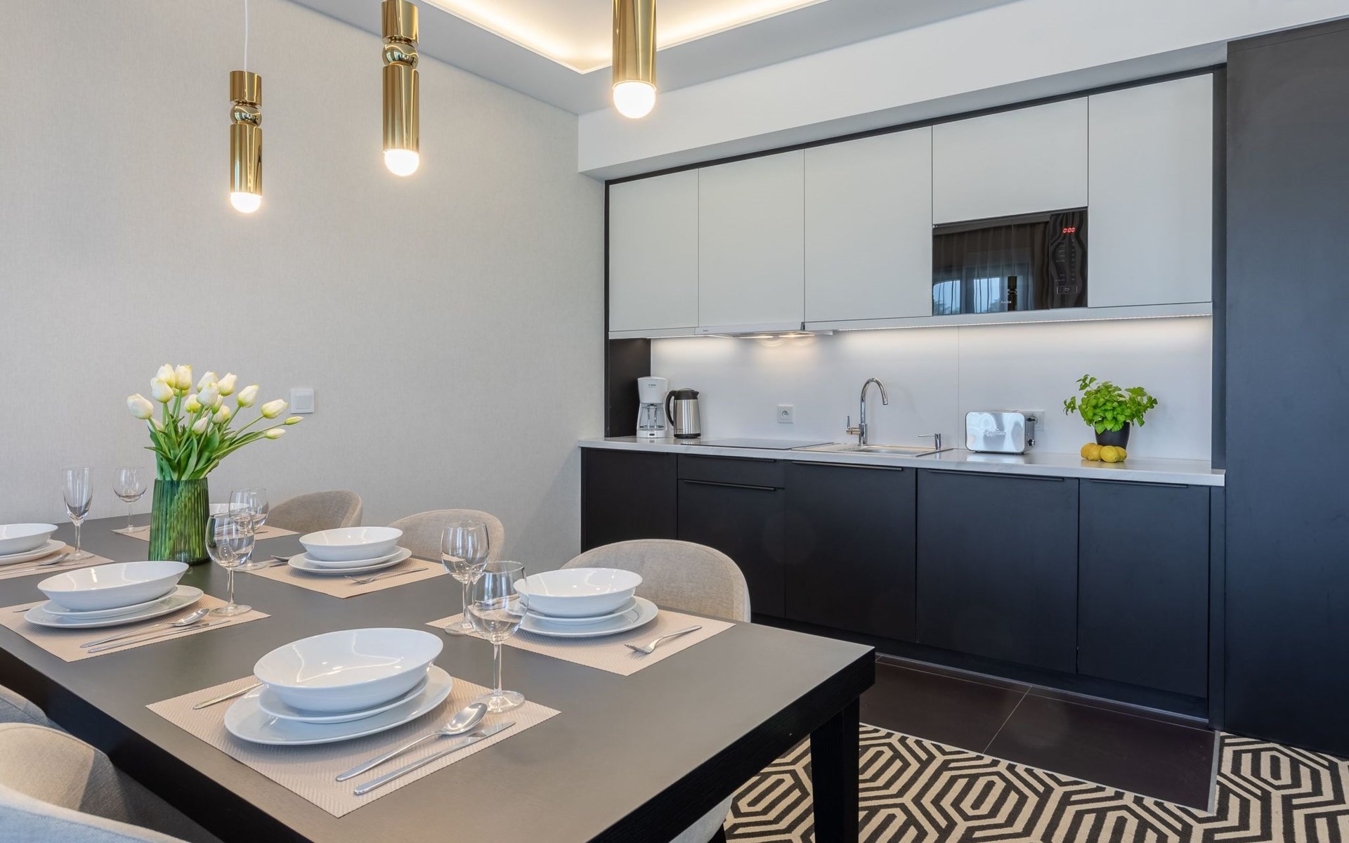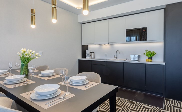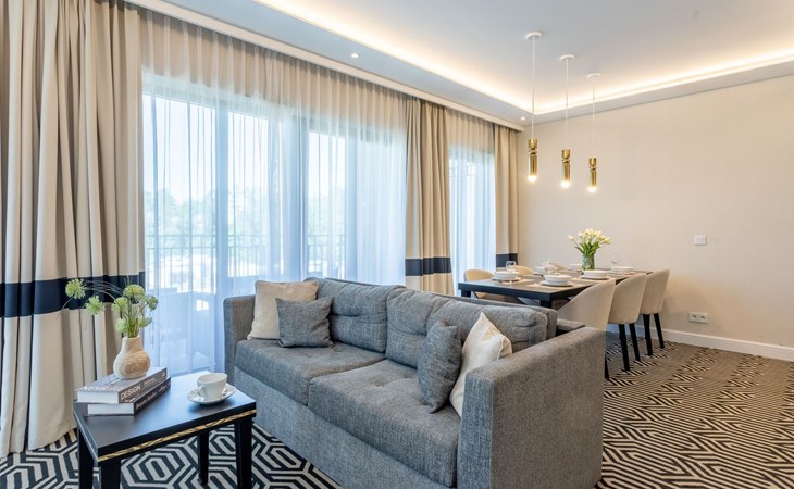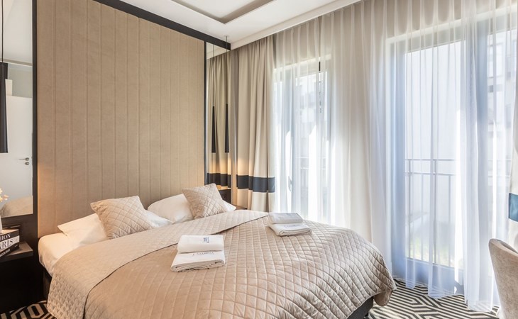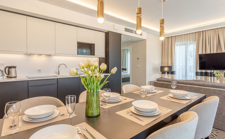 The flat consists of a living area with a kitchenette, two bedrooms and two bathrooms - its total area is 69m2. Its great advantage is air conditioning in every room and a balcony, which is a very practical extension of the living area. Each element of this classic interior has been selected to provide not only the greatest comfort of use, but also to influence the aesthetic sense and inspire pleasure in communicating with beauty and sophistication. The flat combines luxury and sensuality with a touch of lightness - the furnishings are expressive yet harmonious, warm and very sublime. It certainly encourages you to stay longer and allows you to spend your free time comfortably after all-day trips by the sea in a spirit of opulence and elegance.
