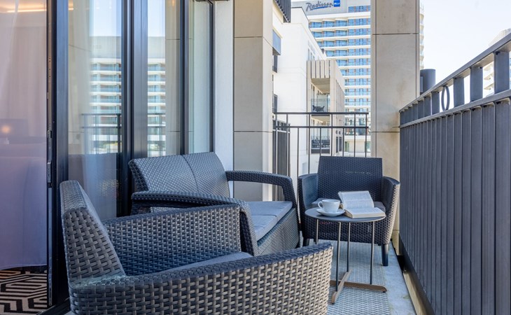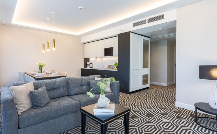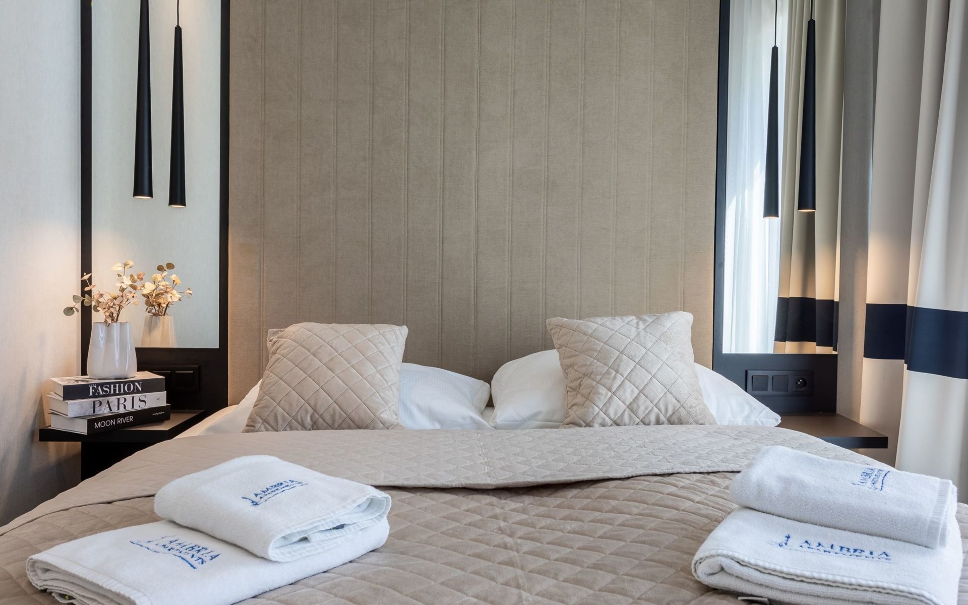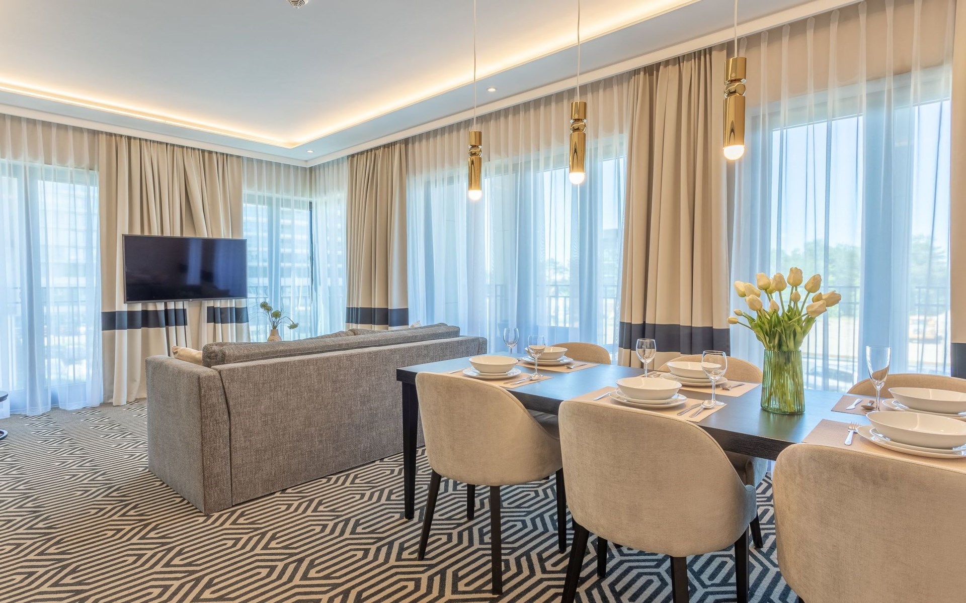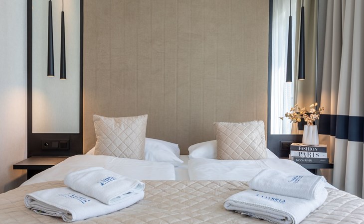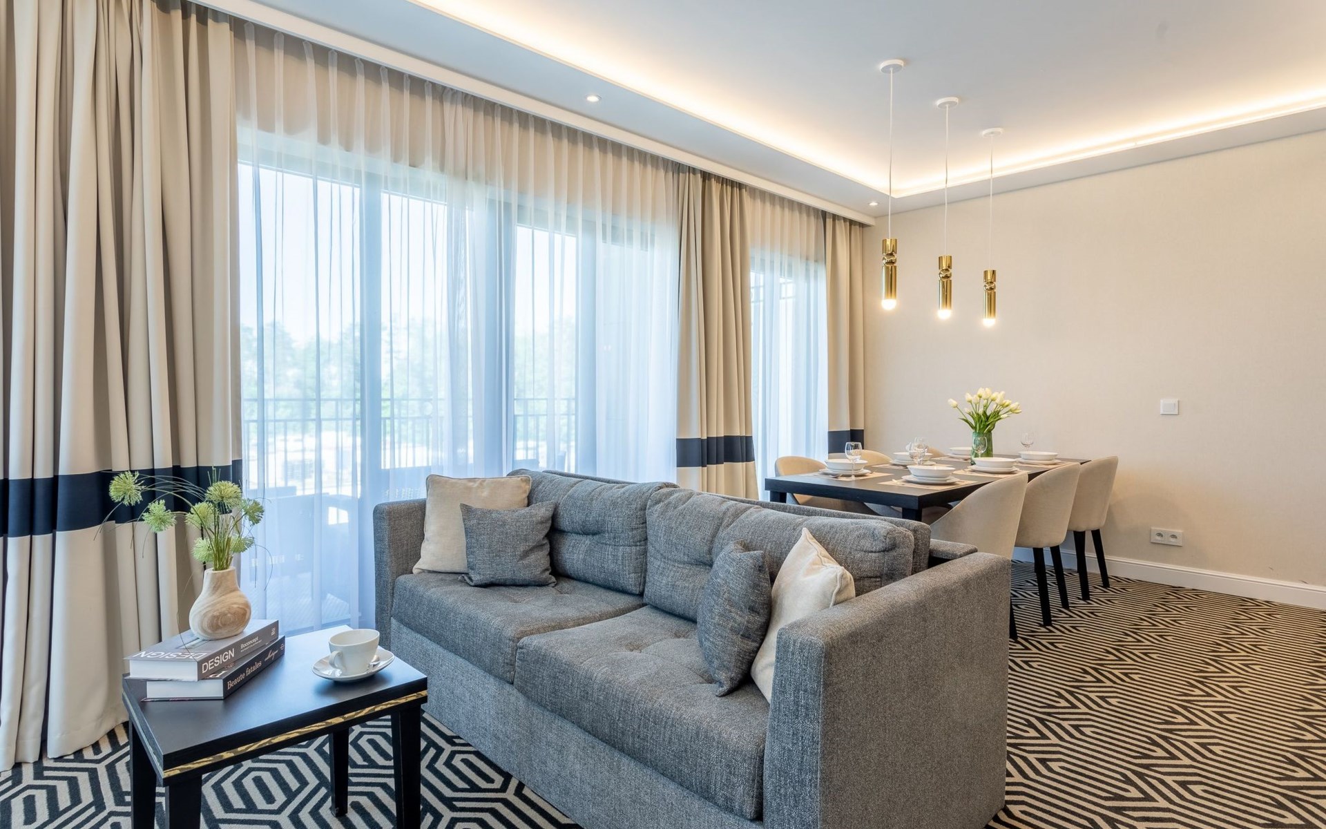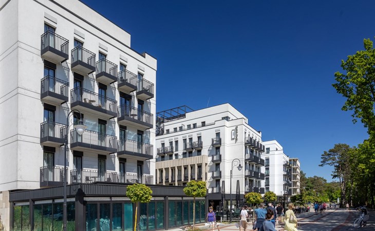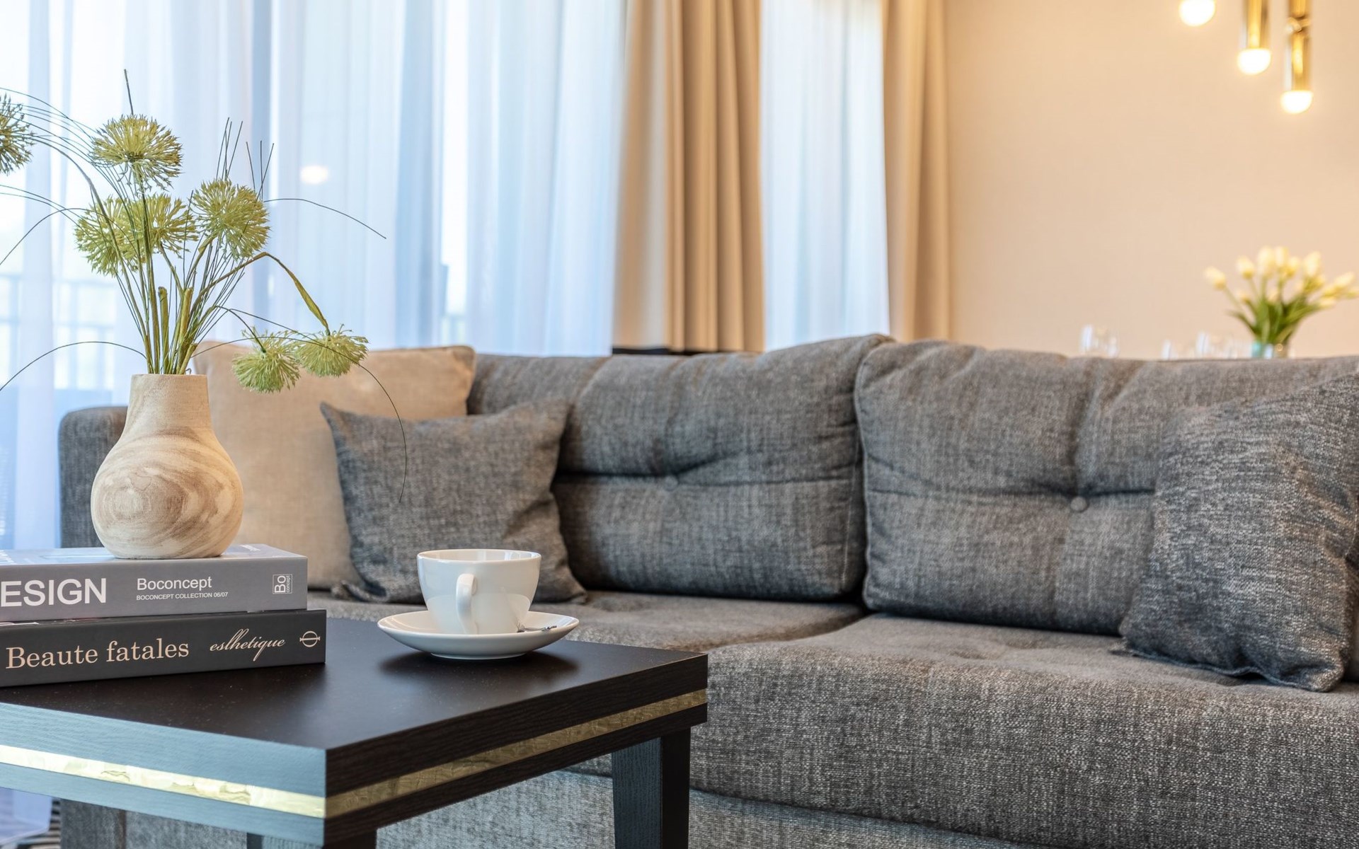 The flat consists of a living area with a kitchenette, two bedrooms and two bathrooms - its total area is 69m2. Its great advantage is air conditioning in every room and a balcony, which is a very practical extension of the living area. Each element of this classic interior has been selected to provide not only the greatest comfort of use, but also to influence the aesthetic sense and inspire pleasure in communicating with beauty and sophistication. The flat combines luxury and sensuality with a touch of lightness - the furnishings are expressive yet harmonious, warm and very sublime. It certainly encourages you to stay longer and allows you to spend your free time comfortably after all-day trips by the sea in a spirit of opulence and elegance.