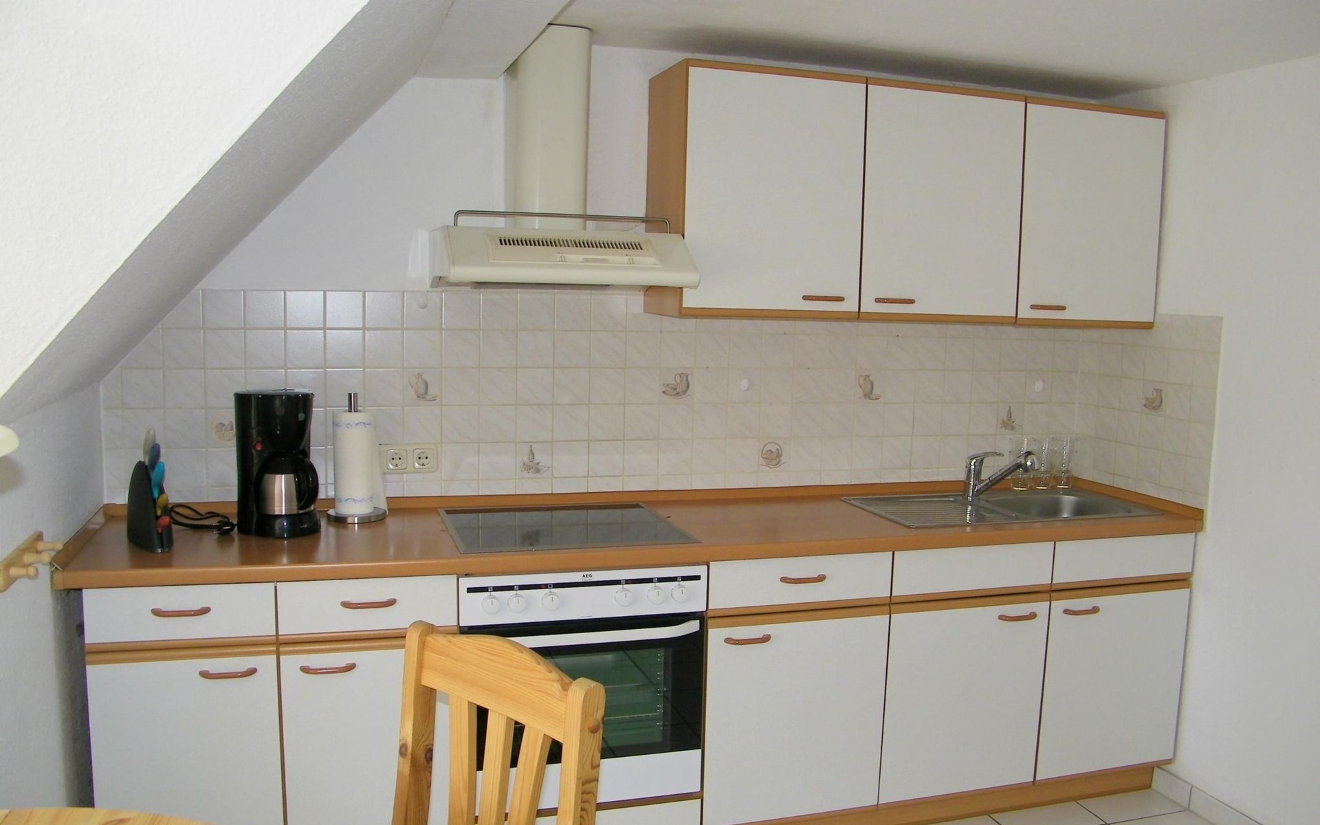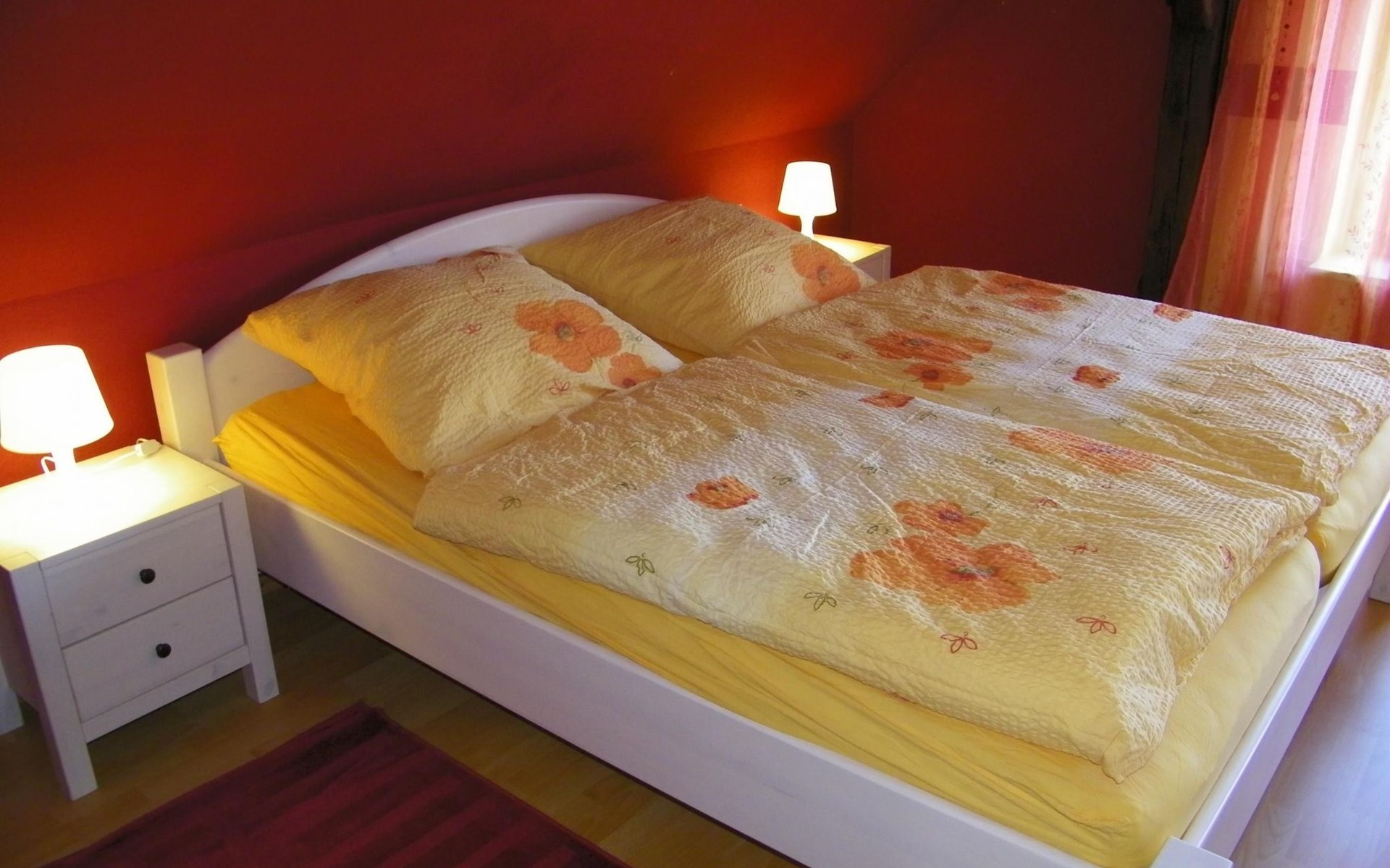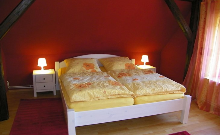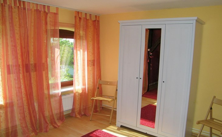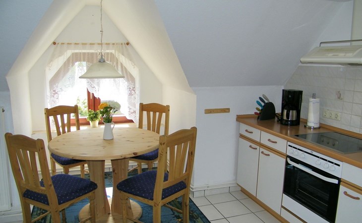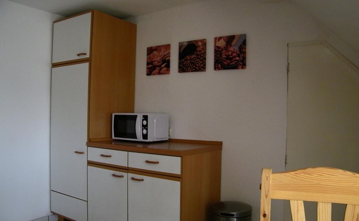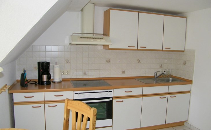 The apartment is in the attic of the house and has a bedroom with a double bed (180 x 200cm), very good foam mattresses and plenty of storage space. The very cosy living room provides an additional sofa bed, armchairs and a TV with a DVD player. The kitchen includes a dining space for enjoying meals, sitting or playing games together and is amply equipped with a fridge, electric hob and oven, microwave, coffee machine, kettle and plenty of crockery, glasses, cutlery and cooking utensils. The shower room is functionally equipped and includes a makeup mirror and hairdryer.