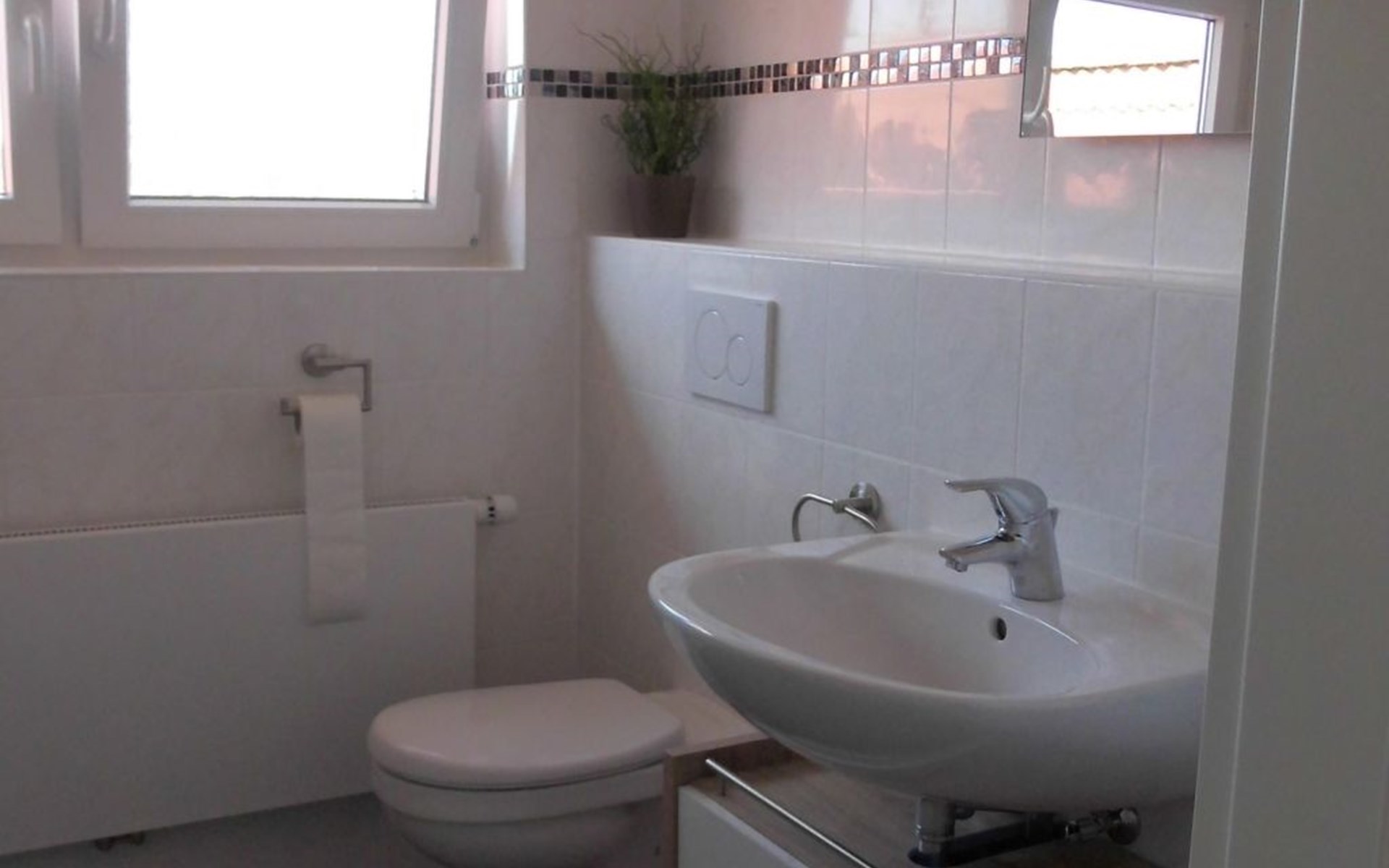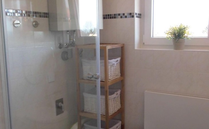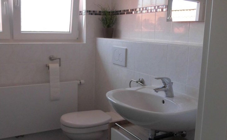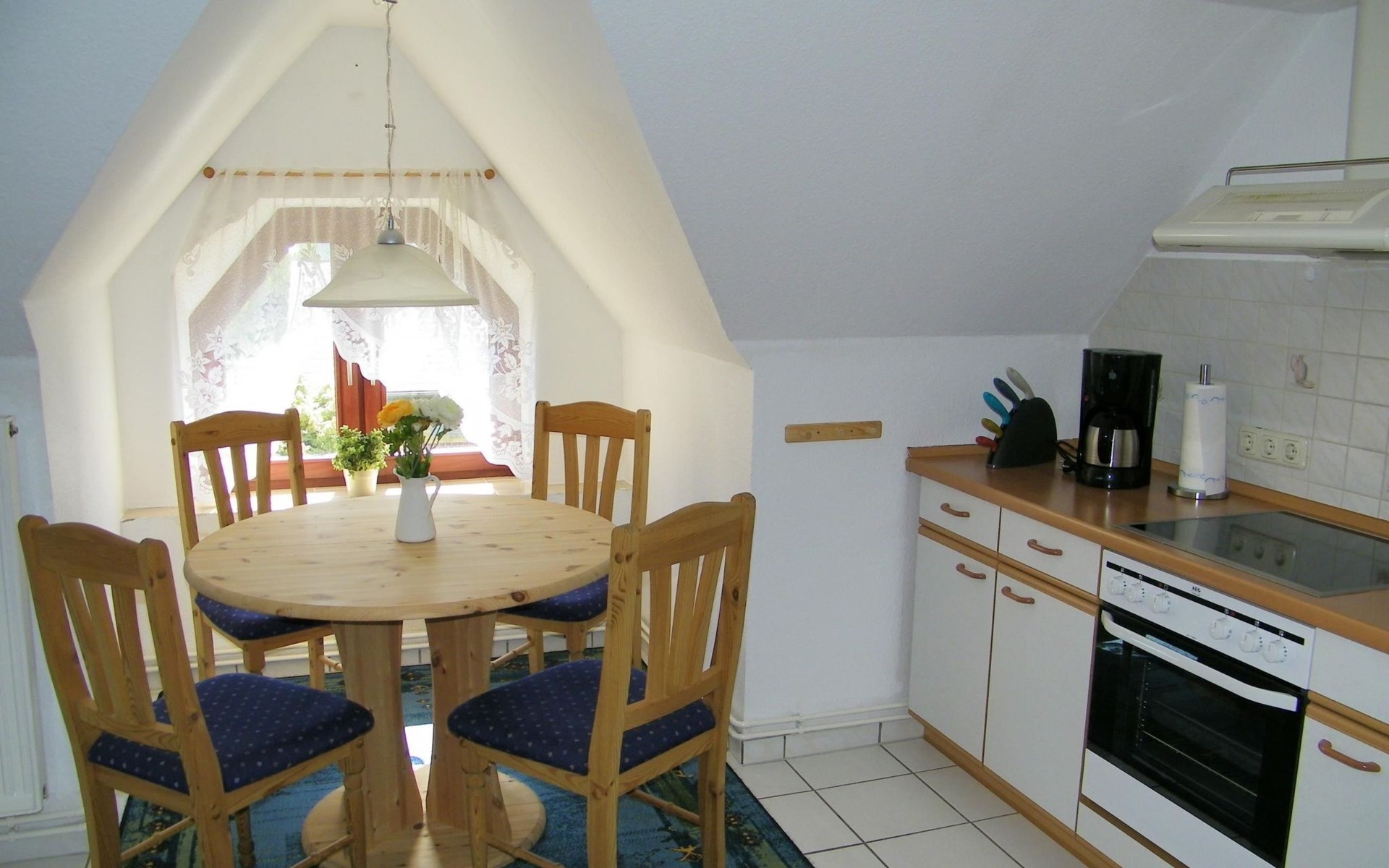 The apartment is in the attic of the house and has a bedroom with a double bed (180 x 200cm), very good foam mattresses and plenty of storage space. The very cosy living room provides an additional sofa bed, armchairs and a TV with a DVD player. The kitchen includes a dining space for enjoying meals, sitting or playing games together and is amply equipped with a fridge, electric hob and oven, microwave, coffee machine, kettle and plenty of crockery, glasses, cutlery and cooking utensils. The shower room is functionally equipped and includes a makeup mirror and hairdryer.