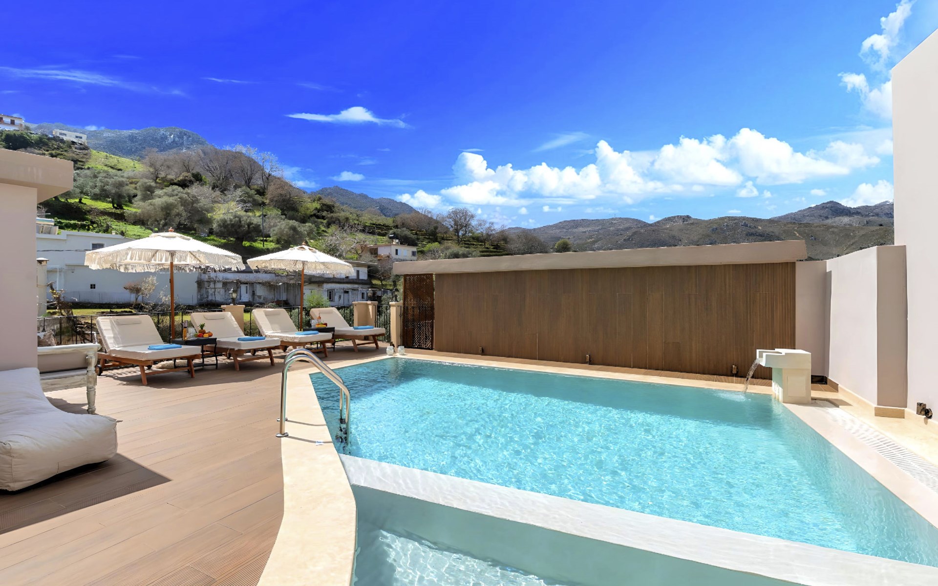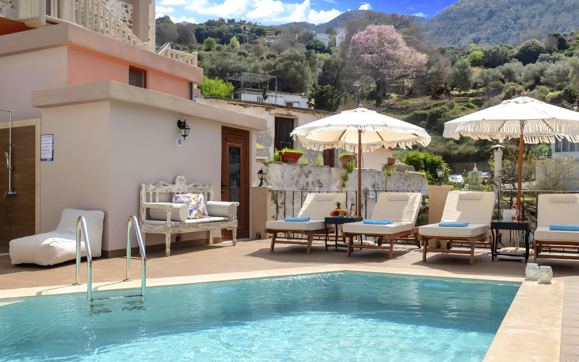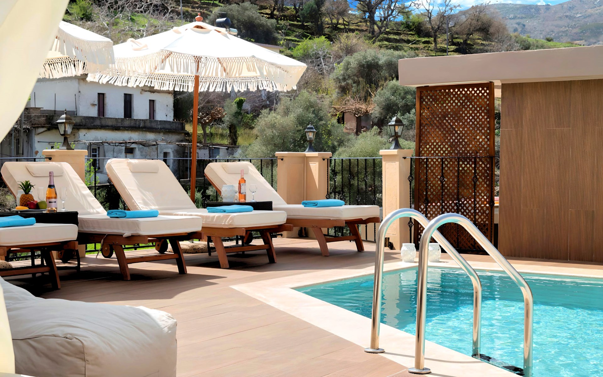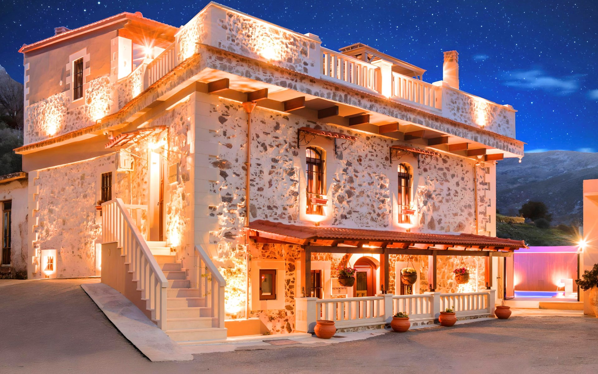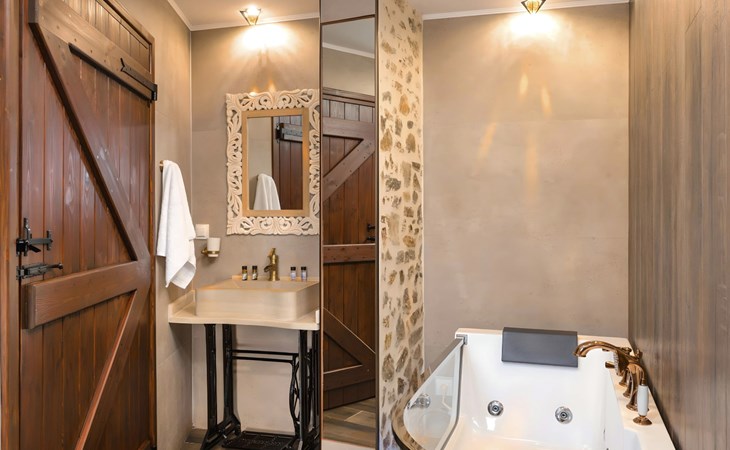 Outside, the mansion showcases its splendid traditional stone architecture, complemented by modern amenities such as a private pool, where guests can enjoy refreshing swims or relax by the poolside. The outdoor area is designed for ultimate relaxation and enjoyment, featuring a terrace and a balcony where you can unwind and soak up the serene surroundings. The mansion's positioning offers a unique vantage point amidst mountains and valleys, providing a tranquil escape from the hustle and bustle.