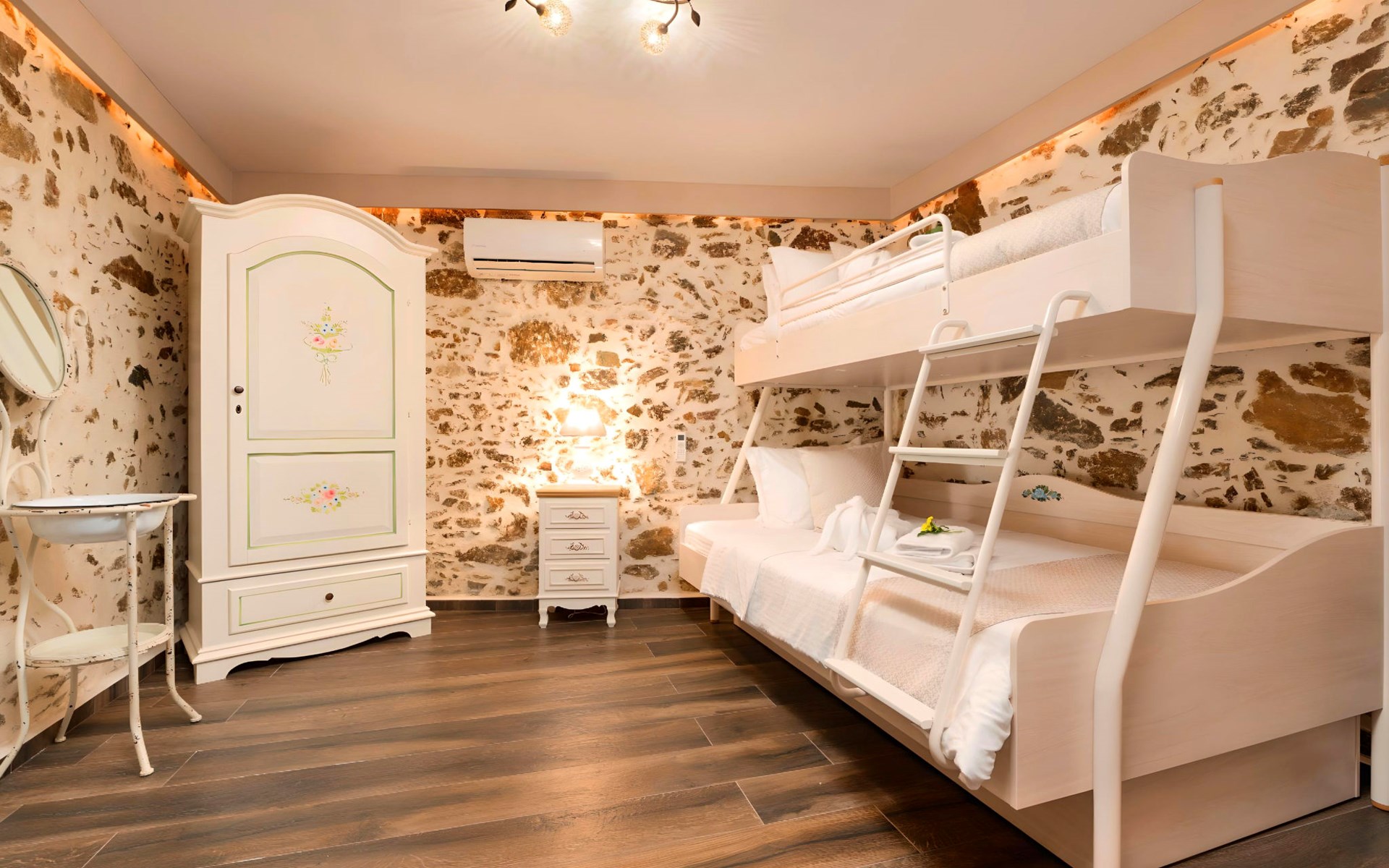Inside, the mansion is divided into two independent floors, ensuring ample space and privacy for guests. Each floor comes fully equipped to meet all your needs, featuring air conditioning throughout to keep you cool during those warm Cretan days. The living spaces boast comfort and convenience, with a washing machine for exclusive use, ensuring you have everything you need for a hassle-free holiday. Culinary enthusiasts will appreciate the fully equipped kitchens, featuring a capsule coffee machine, dishwasher, and electric kettle – perfect for preparing delightful meals or a quick coffee to start the day.