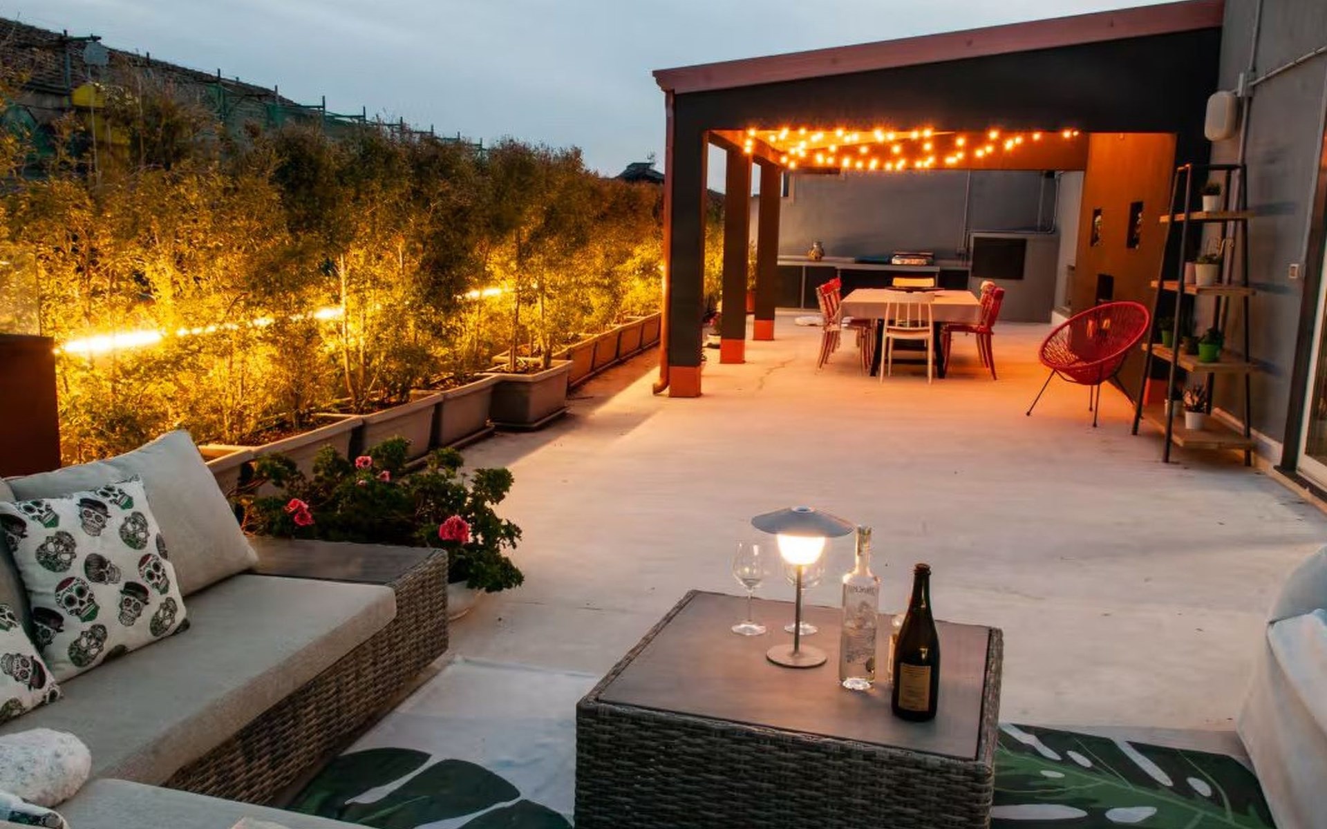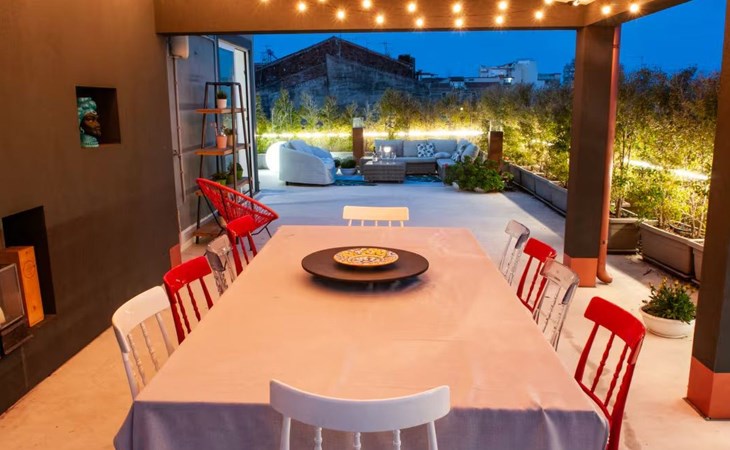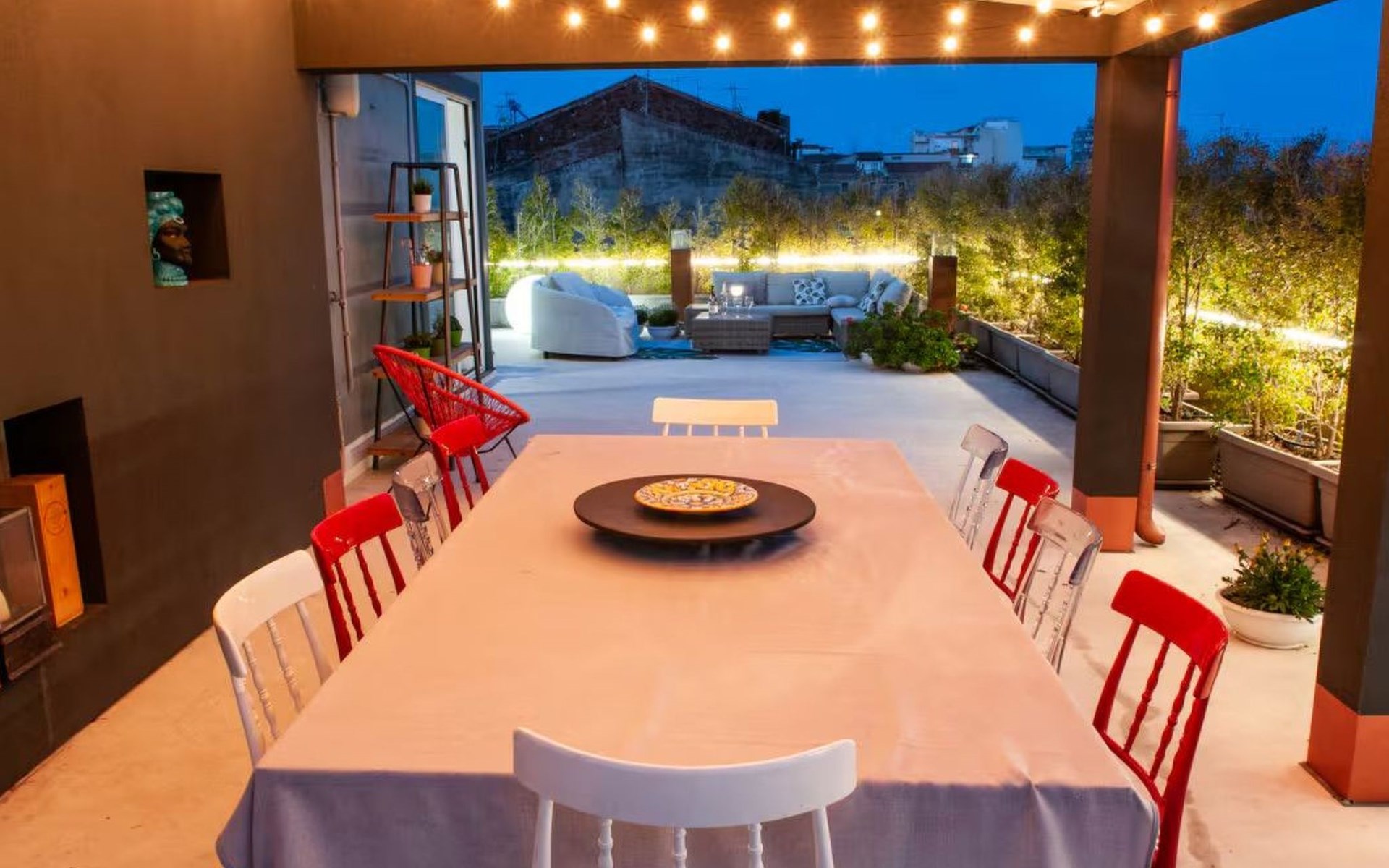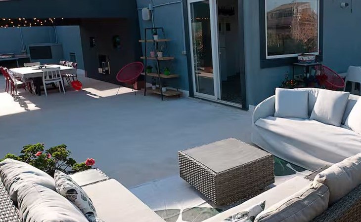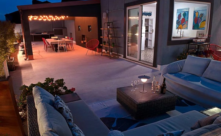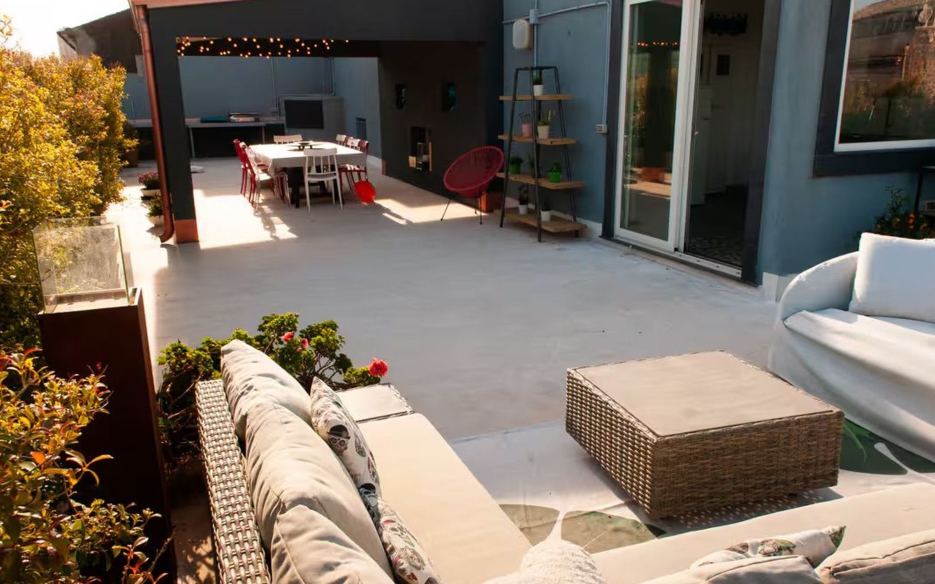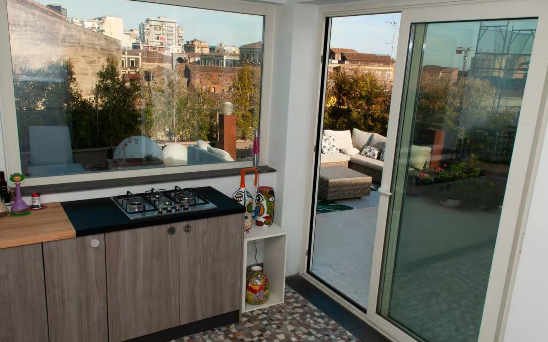 Outside the interior, an impressive roof terrace invites you to unwind or enjoy time together in the open air. Barbecue and use the kitchen on the terrace to prepare meals. This outdoor area has plenty of space for relaxed moments in a group or for a quiet breakfast, lunch or dinner with a view over the old town and the peak of Mount Etna.