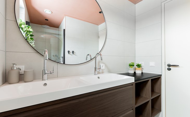 The luxury bathroom features a double washbasin with ample storage space, underfloor heating and a modern rain shower. There is also a separate toilet.