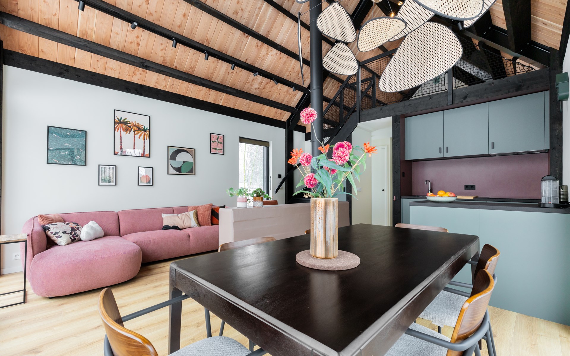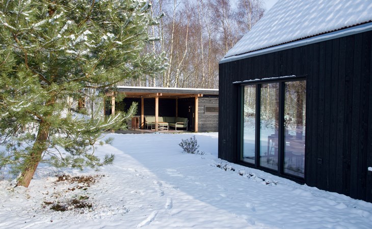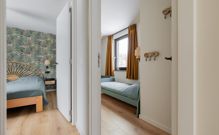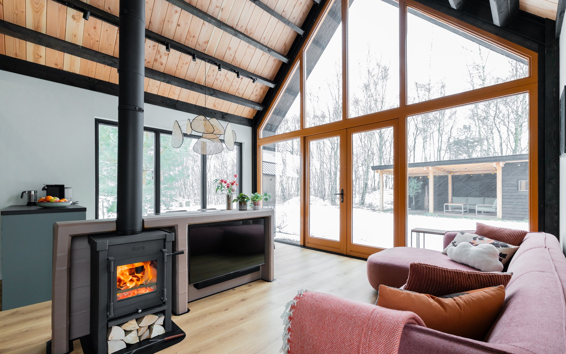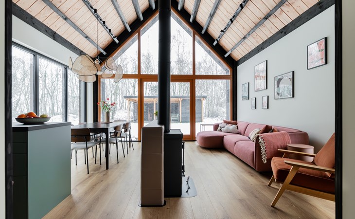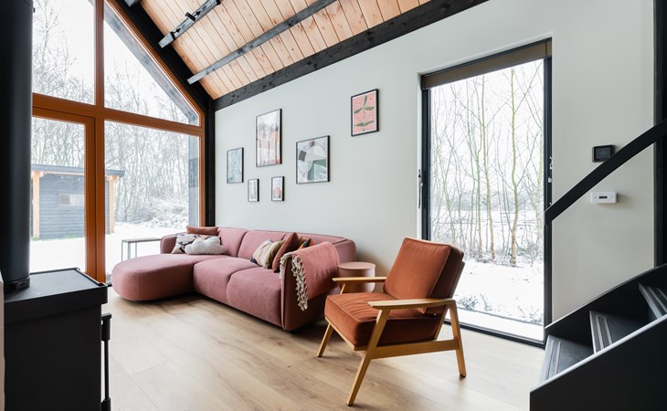 At the dining table for six people you can enjoy long dinners, game nights and views of the surrounding greenery. The seating area invites you to relax with a smart TV, soundbar and an atmospheric Jacobus wood-burning stove. A Bluetooth speaker is also available for your favorite music.