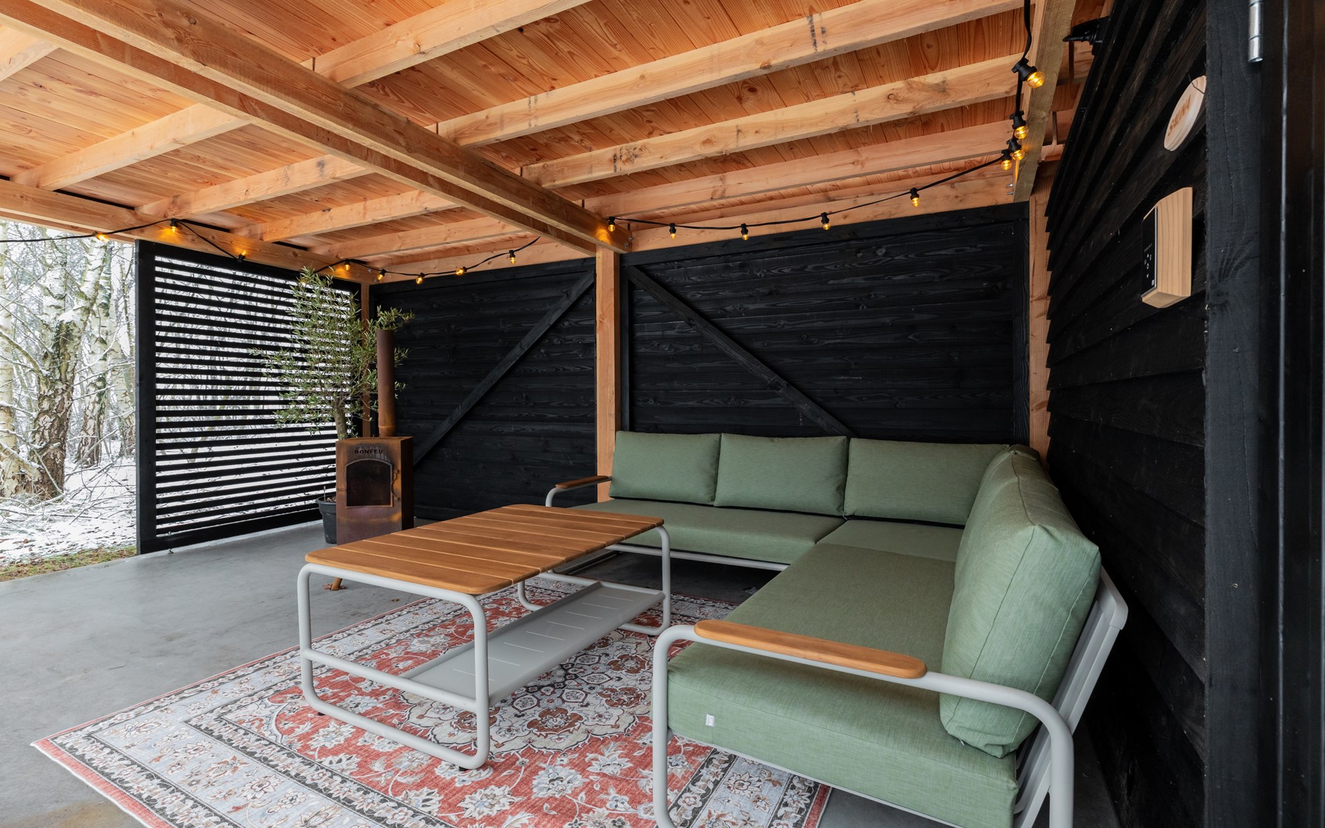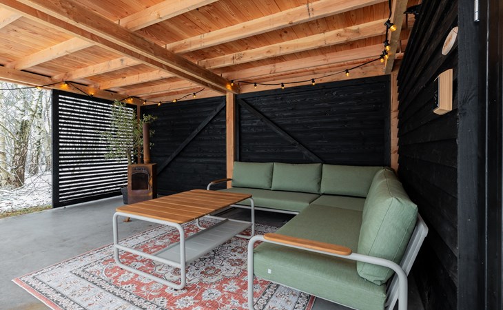 Through the French doors you step straight into the garden. Here you will find a spacious covered terrace with a luxury lounge set, where you can sit sheltered and enjoy the sun all day long. On warm summer days, the shaded areas of the garden provide pleasant cooling. There is an outdoor wood-burning stove that can also be used as a barbecue.