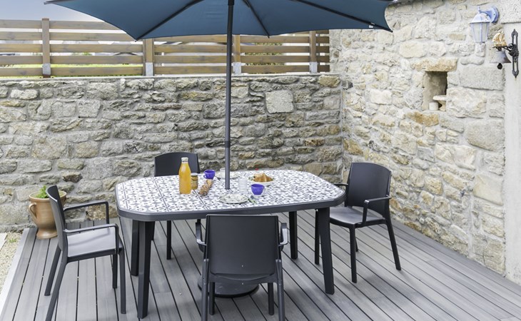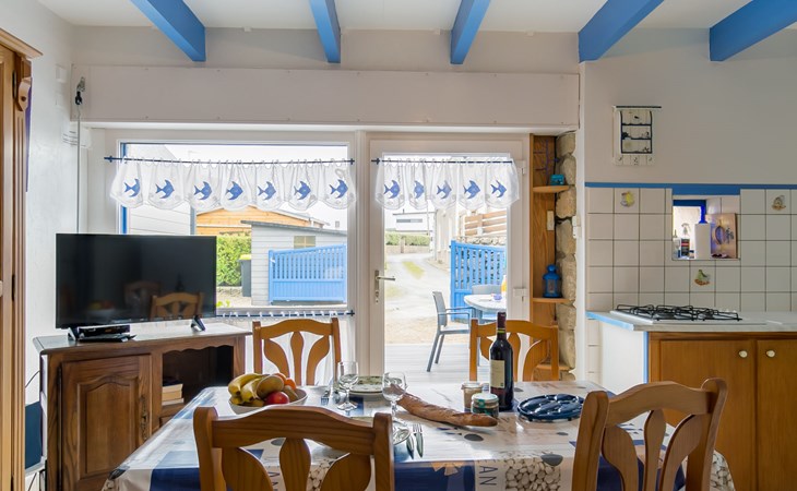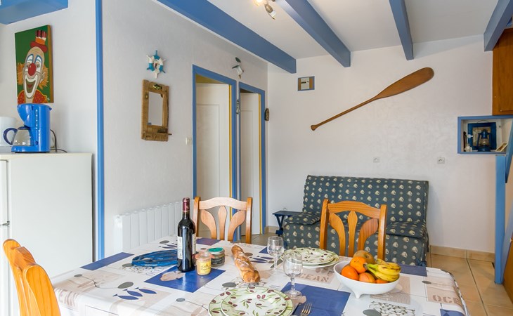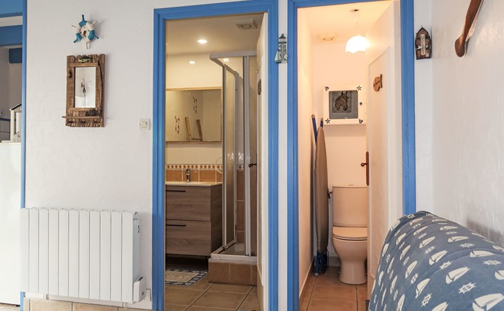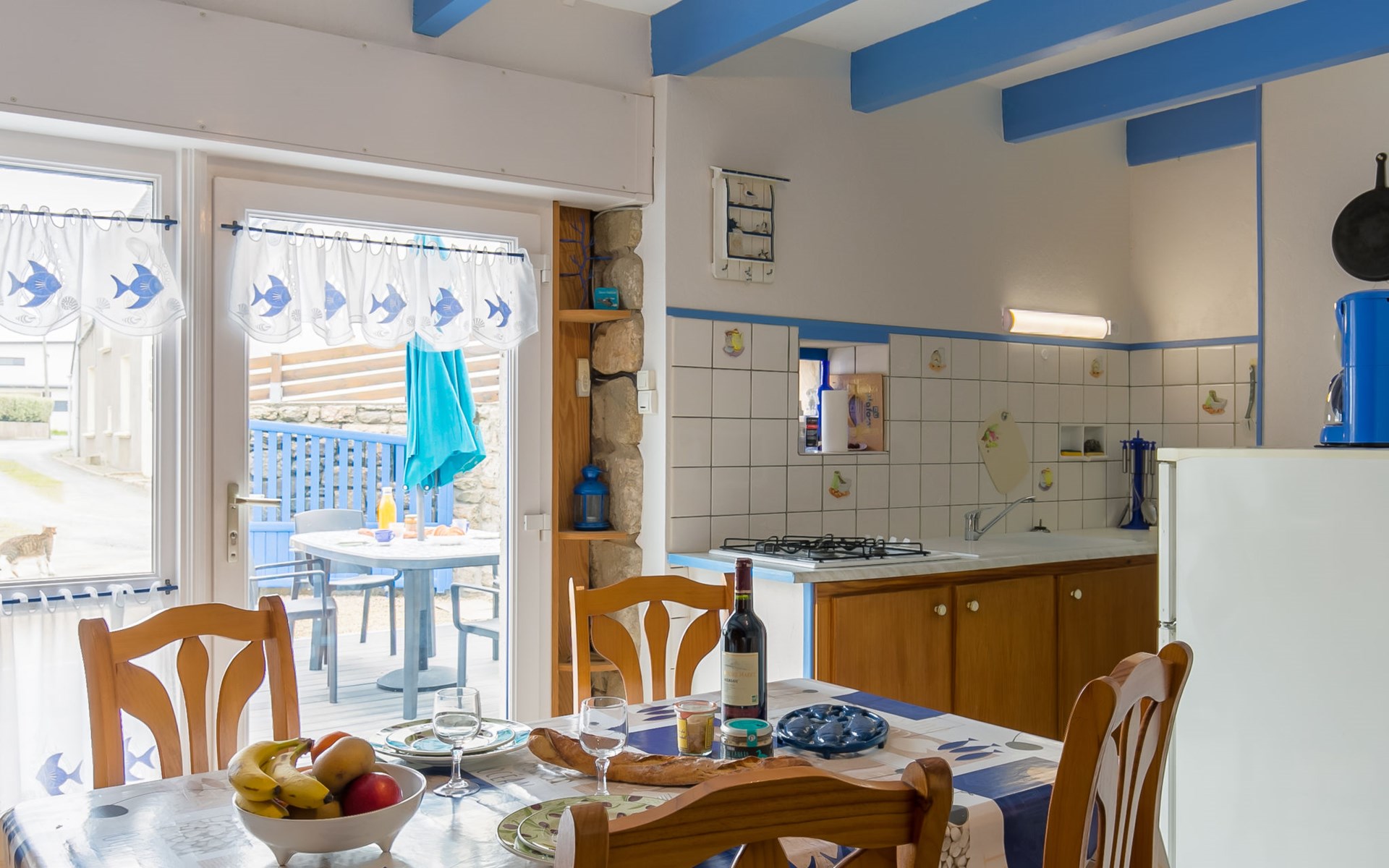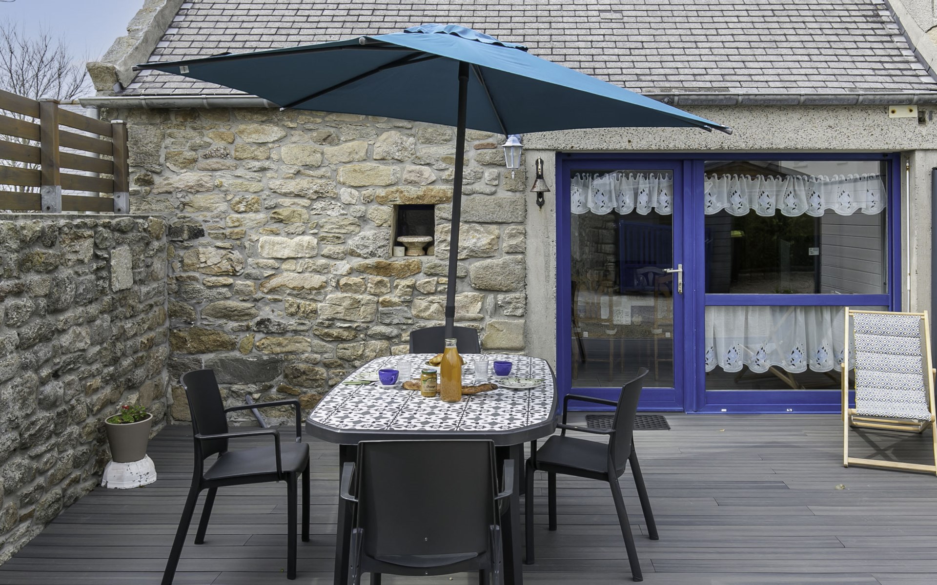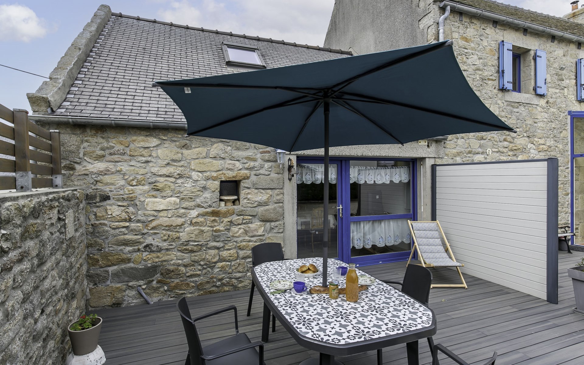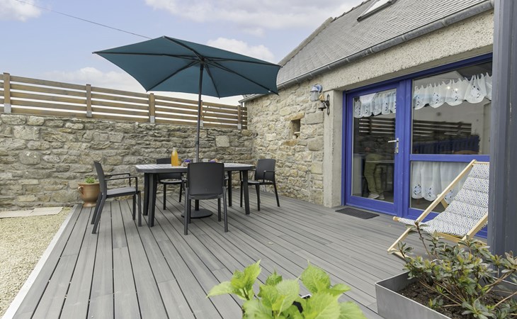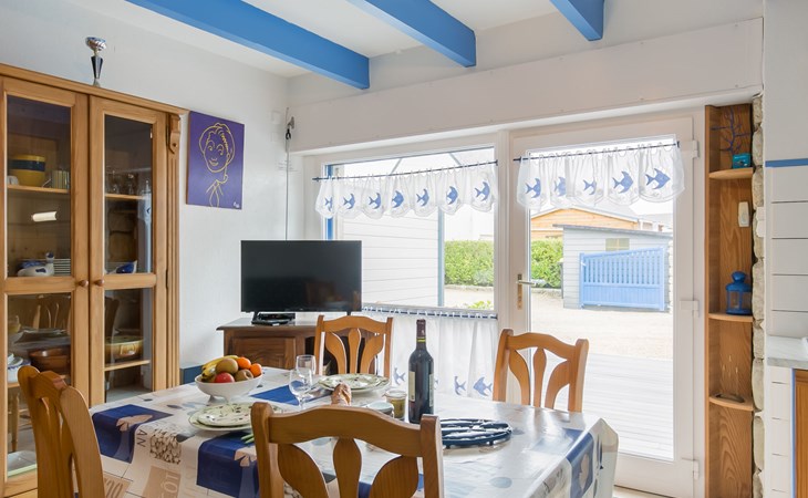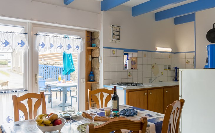 Small terraced house "Ty Kerveal", semi-detached. In the district of Kerveal 1 km from the centre of Santec, 5 km from the centre of Saint Pol-de-Léon, 23 km from the centre of Morlaix, 250 m from the sea, 250 m from the beach. For shared use: property 1'000 m2, courtyard, parking on the premises. Shop 1 km, supermarket 5 km, bakery 1 km, bus stop "Mairie" 850 m, sandy beach "Plage du Staol" 250 m, indoor swimming pool 5 km, thermal baths "Thalasso Roscoff" 6 km. Sports harbour 9 km, golf course (9 hole) 17 km, surf school 1.7 km, sailing school 6.7 km. Nearby attractions: Roscoff 6 km, Jardin Exotique Roscoff 8 km, St.Pol-de-Léon 6 km, Morlaix 26 km, Huelgoat 60 km, Oceanopolis Brest 65 km. Hiking paths: GR34, sentier des douaniers 250 m. Owner lives in separate semi-detached house.