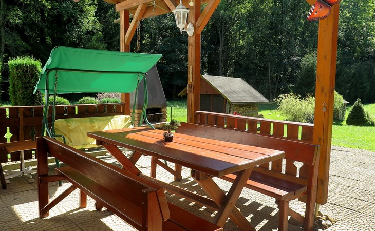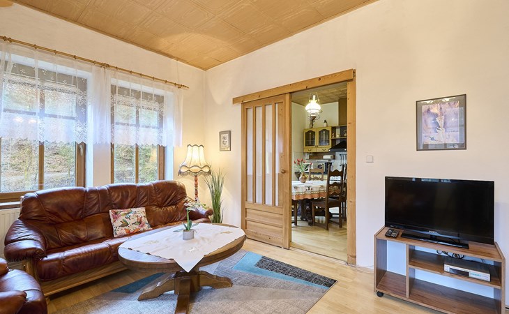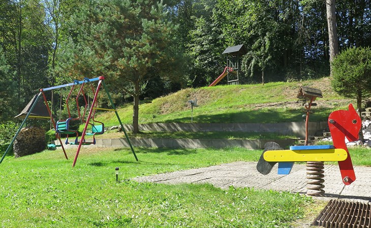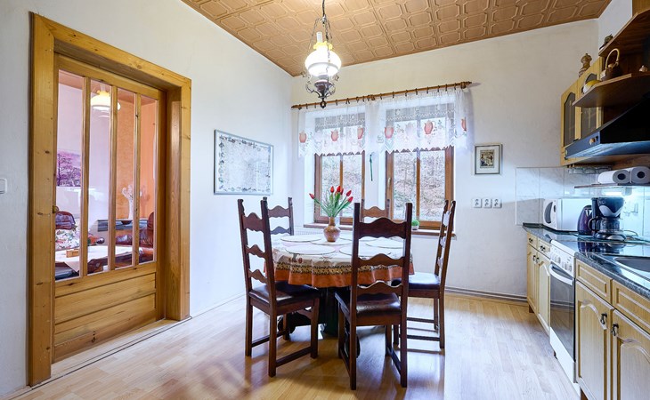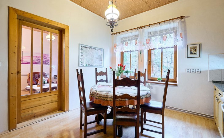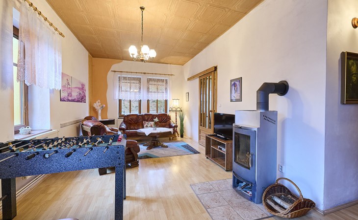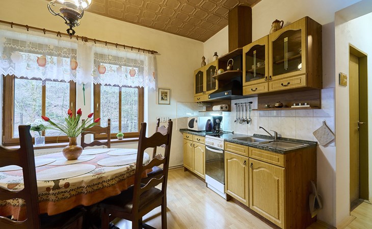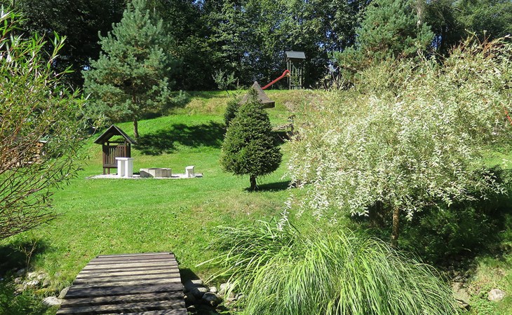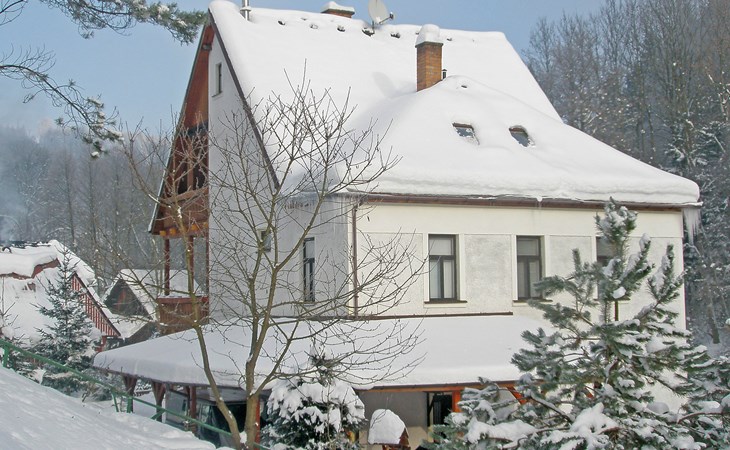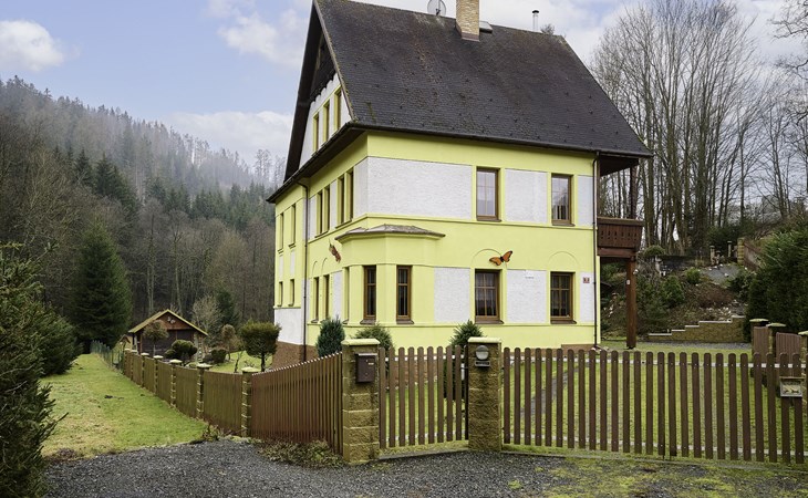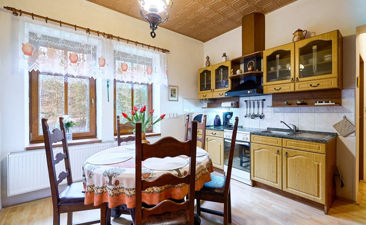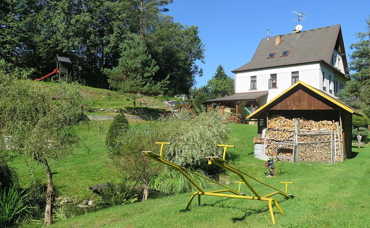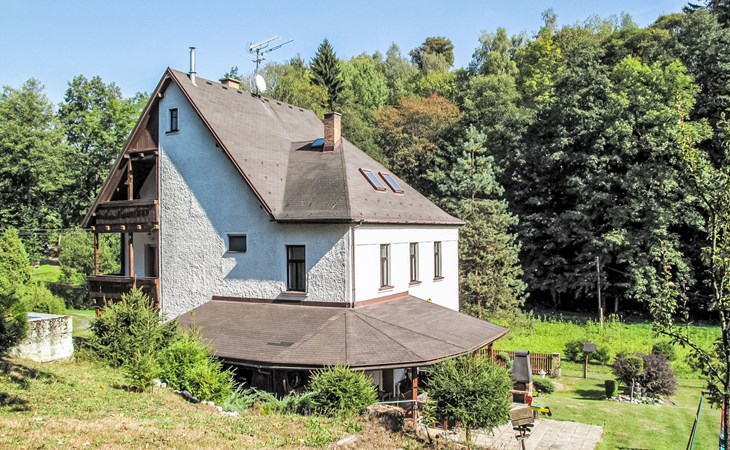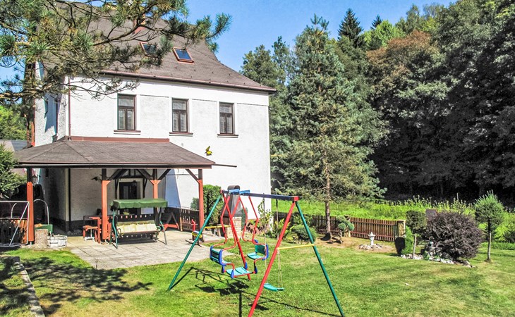 Zlatá Olešnice, 16 km from Tanvald: The former mill with it's own power station is a family villa nowadays. It is situated on the Zlatnik stream, a romantic position beautiful, historical single-family house "Zlata Olesnice", 2 storeys, renovated in 2004. Below Zlatá Olešnice, on the outskirts, in a secluded, quiet, sunny position, 50 m from the edge of the forest, 20 m from the stream, in a cul-de-sac, in the countryside. Private: property 4'000 m2, garden 1'000 m2 (fenced) with lawn and trees, pond. Patio (20 m2), terrace (30 m2), garden furniture, barbecue, fireplace, children's playground (slide, swing). In the house: storage room for skis, central heating system, washing machine. Motor access to the house. Roofed, parking at the house. Grocery, restaurant, bus stop 300 m, outdoor swimming pool 800 m, indoor swimming pool 20 km. Ski lift 1.5 km, skisport facilities 18 km, slopes 5 km, ski school 18 km, children's ski school 5 km, cross country ski track 50 m. Covered parking. Ski storage boxes available. Ideal for families with children.
