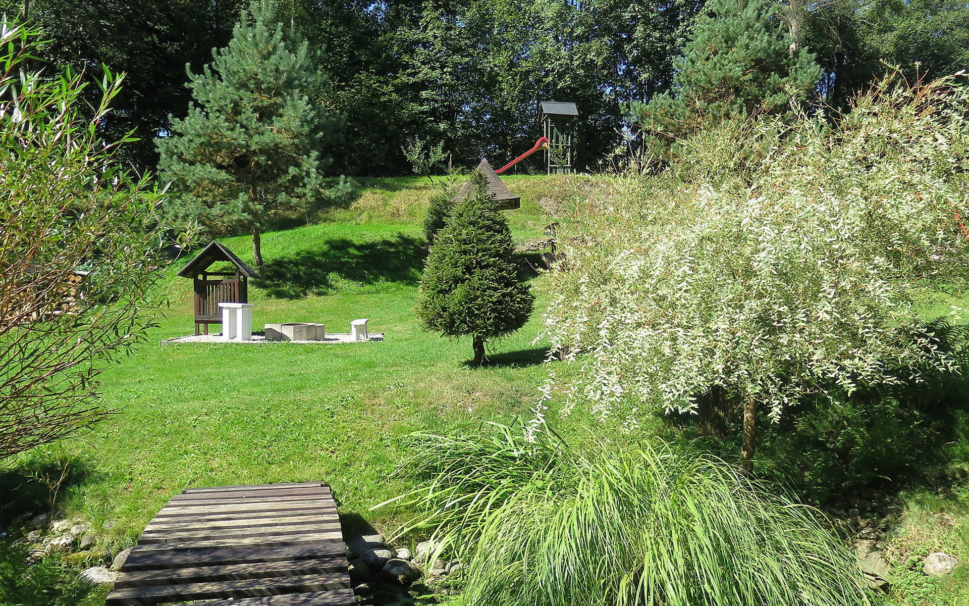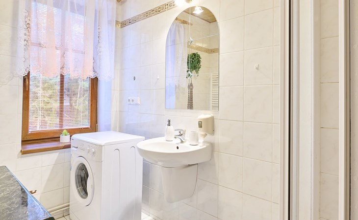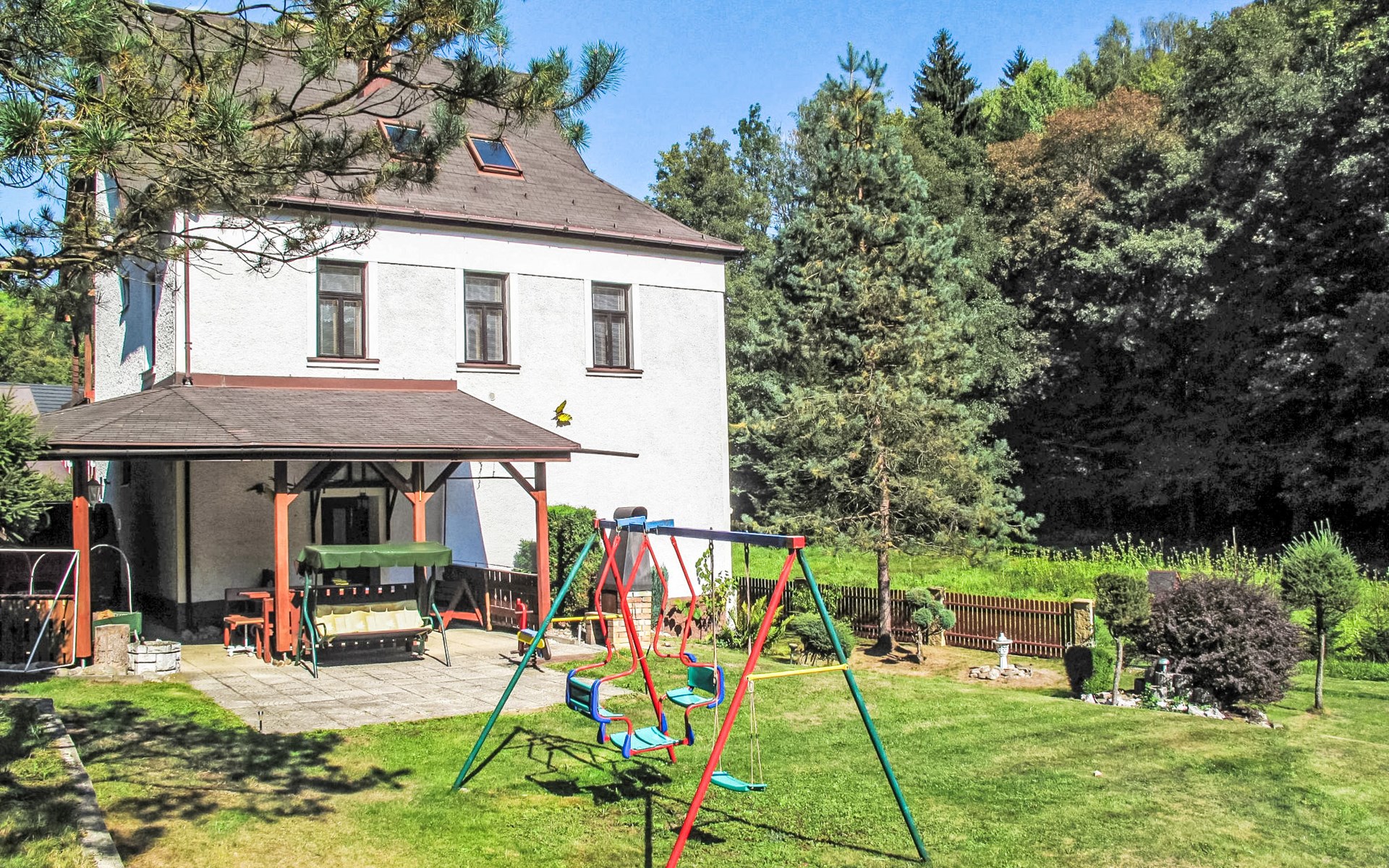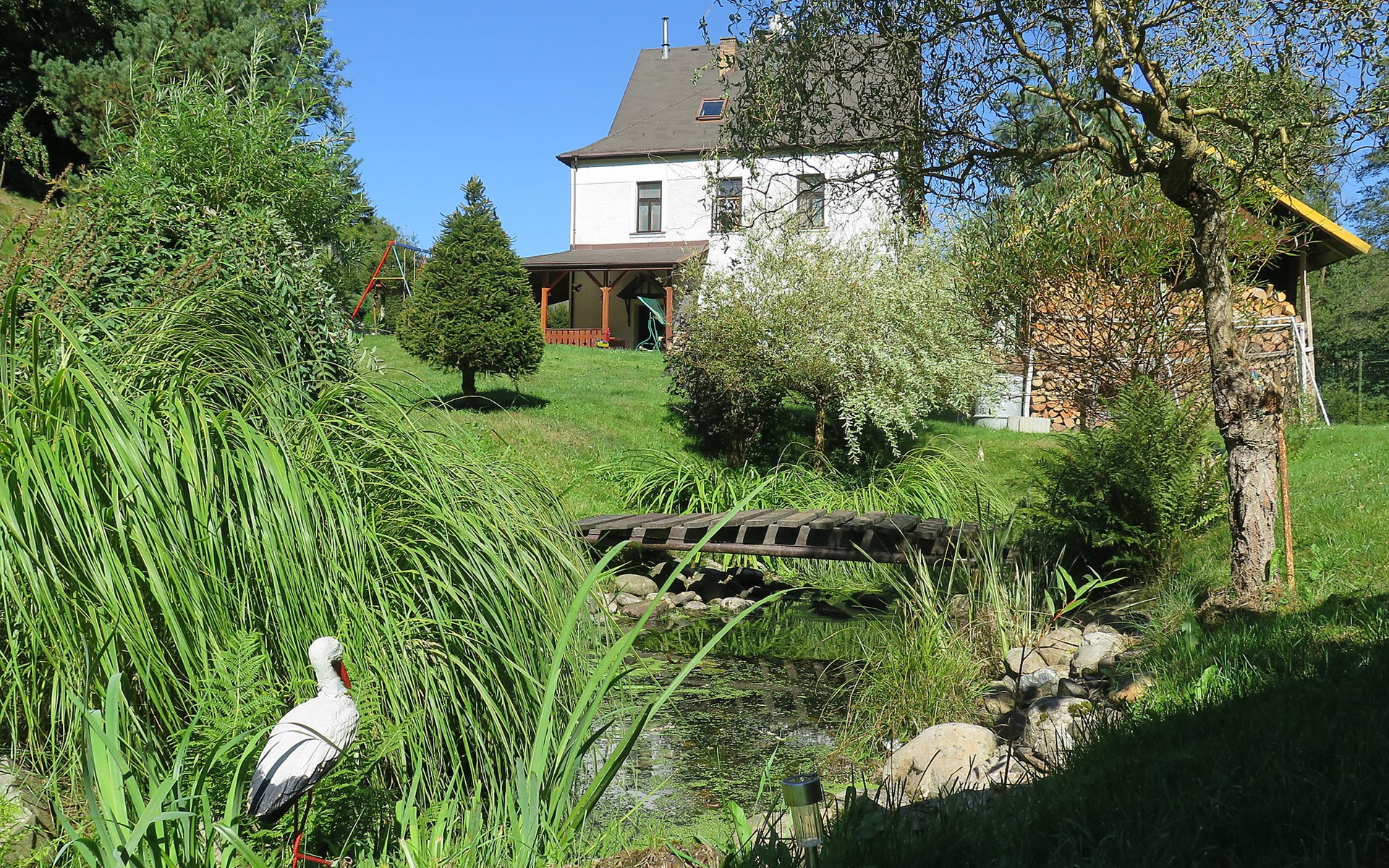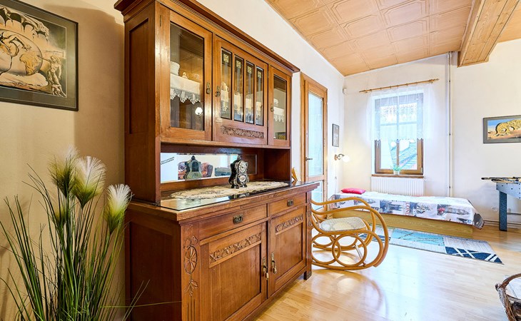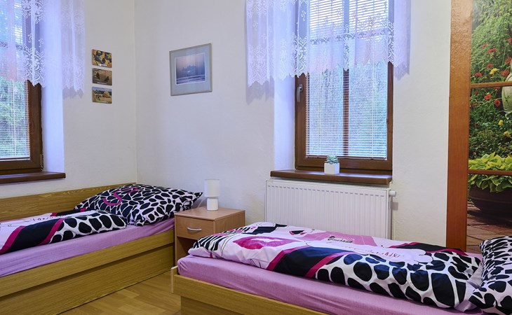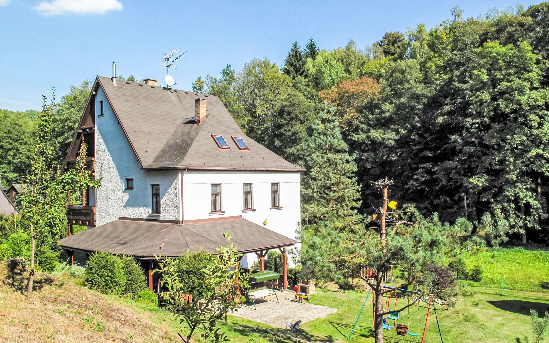 Zlatá Olešnice, 16 km from Tanvald: The former mill with it's own power station is a family villa nowadays. It is situated on the Zlatnik stream, a romantic position beautiful, historical single-family house "Zlata Olesnice", 2 storeys, renovated in 2004. Below Zlatá Olešnice, on the outskirts, in a secluded, quiet, sunny position, 50 m from the edge of the forest, 20 m from the stream, in a cul-de-sac, in the countryside. Private: property 4'000 m2, garden 1'000 m2 (fenced) with lawn and trees, pond. Patio (20 m2), terrace (30 m2), garden furniture, barbecue, fireplace, children's playground (slide, swing). In the house: storage room for skis, central heating system, washing machine. Motor access to the house. Roofed, parking at the house. Grocery, restaurant, bus stop 300 m, outdoor swimming pool 800 m, indoor swimming pool 20 km. Ski lift 1.5 km, skisport facilities 18 km, slopes 5 km, ski school 18 km, children's ski school 5 km, cross country ski track 50 m. Covered parking. Ski storage boxes available. Ideal for families with children.