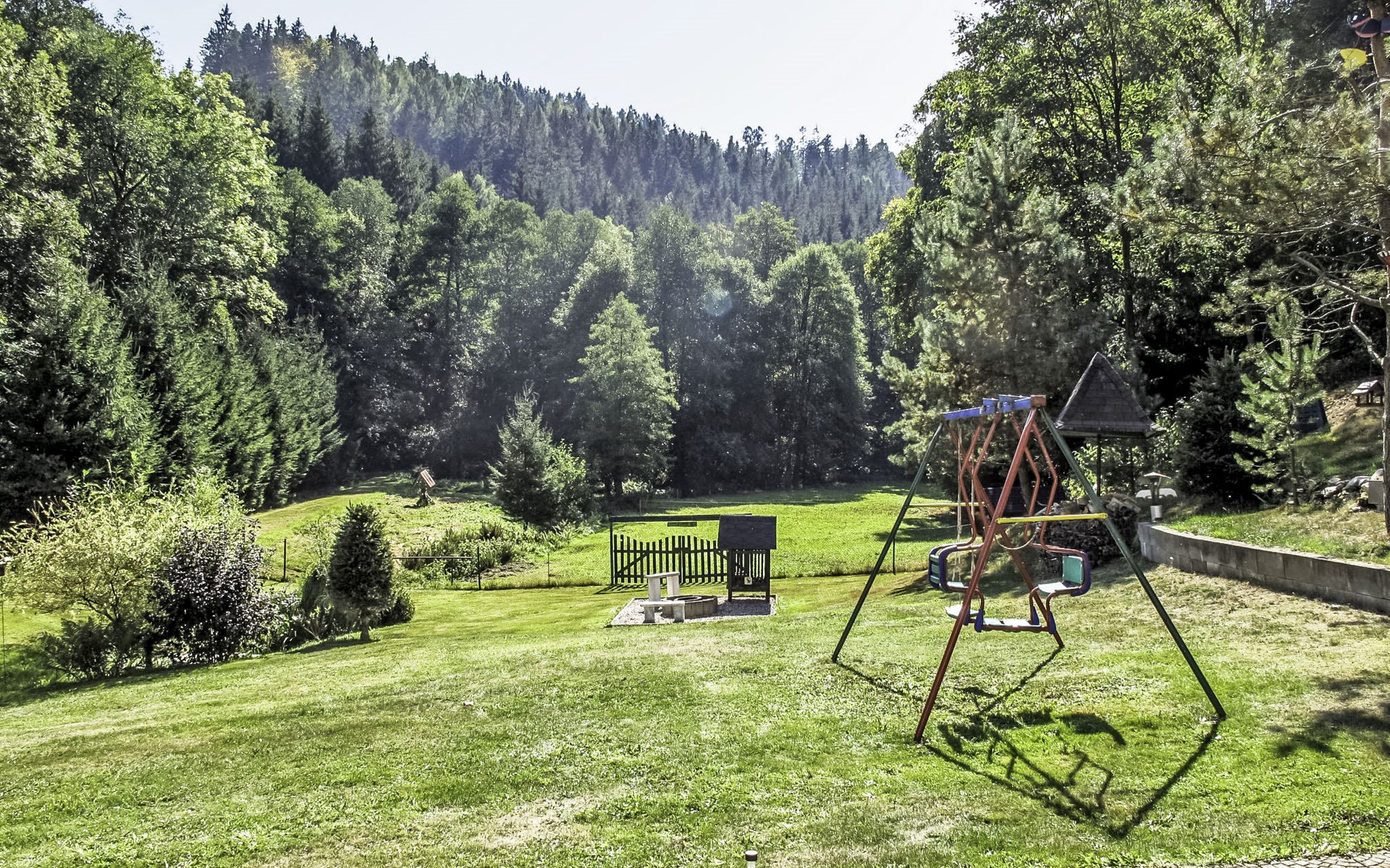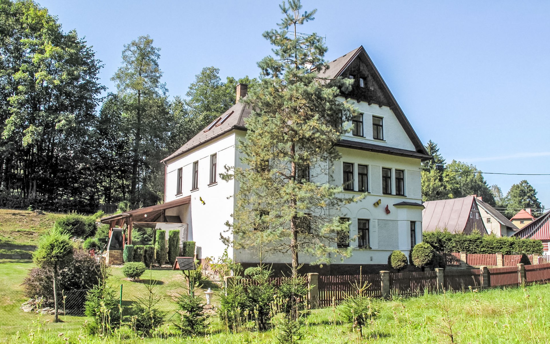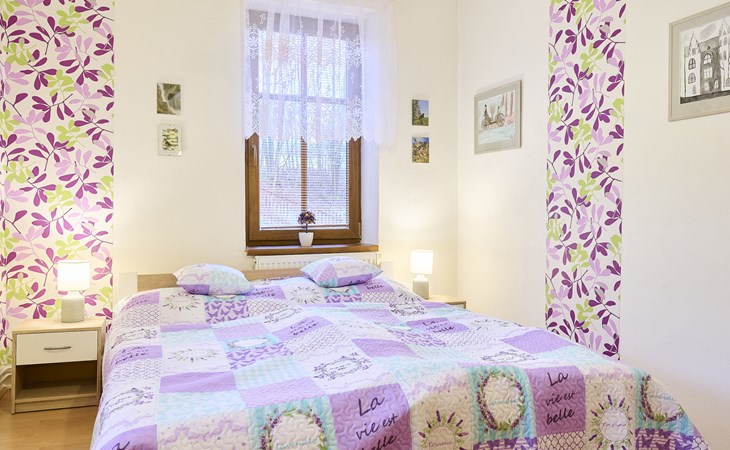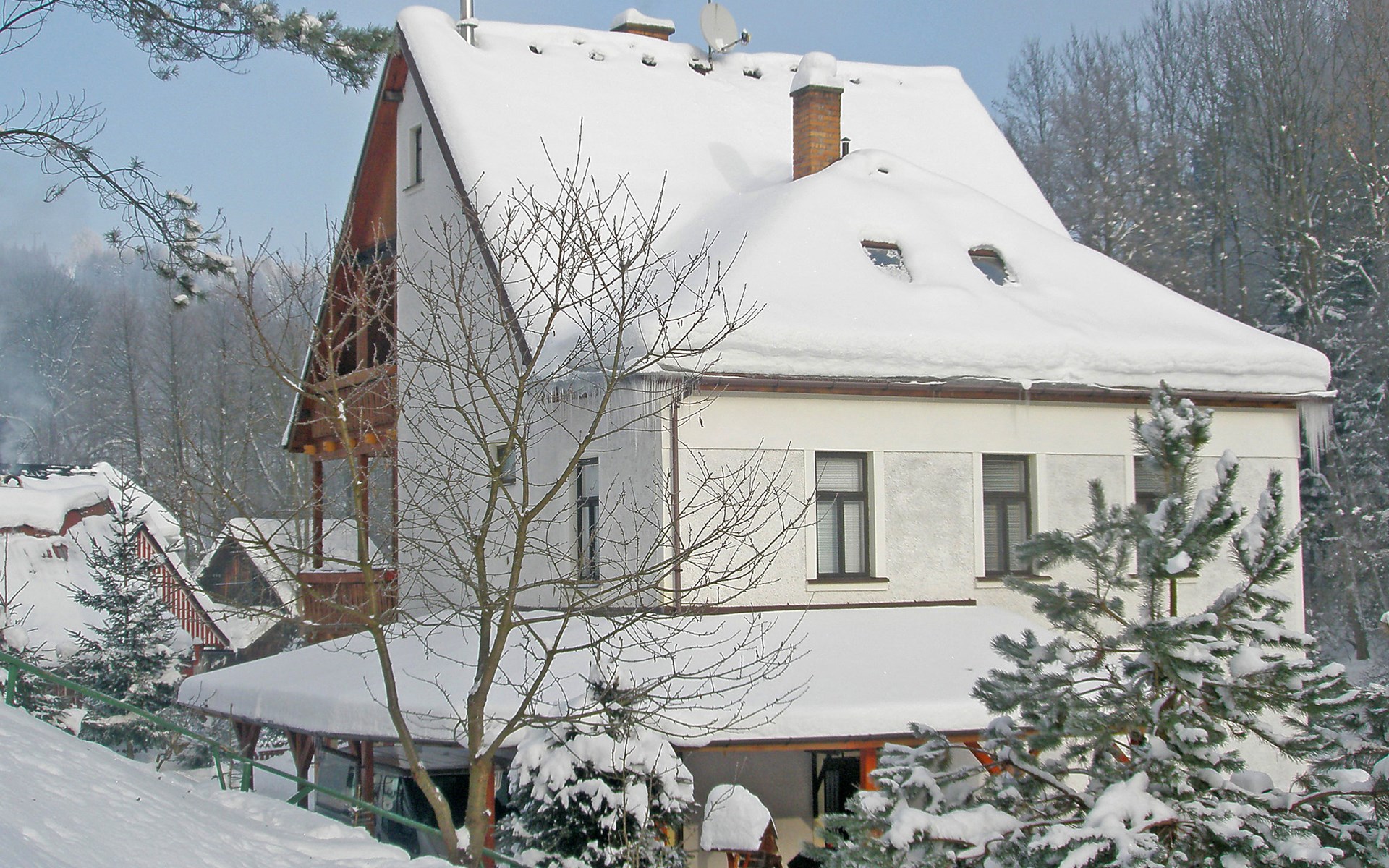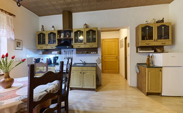 Zlatá Olešnice, 16 km from Tanvald: The former mill with it's own power station is a family villa nowadays. It is situated on the Zlatnik stream, a romantic position beautiful, historical single-family house "Zlata Olesnice", 2 storeys, renovated in 2004. Below Zlatá Olešnice, on the outskirts, in a secluded, quiet, sunny position, 50 m from the edge of the forest, 20 m from the stream, in a cul-de-sac, in the countryside. Private: property 4'000 m2, garden 1'000 m2 (fenced) with lawn and trees, pond. Patio (20 m2), terrace (30 m2), garden furniture, barbecue, fireplace, children's playground (slide, swing). In the house: storage room for skis, central heating system, washing machine. Motor access to the house. Roofed, parking at the house. Grocery, restaurant, bus stop 300 m, outdoor swimming pool 800 m, indoor swimming pool 20 km. Ski lift 1.5 km, skisport facilities 18 km, slopes 5 km, ski school 18 km, children's ski school 5 km, cross country ski track 50 m. Covered parking. Ski storage boxes available. Ideal for families with children.