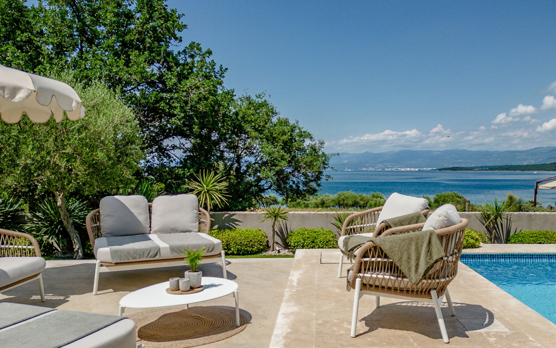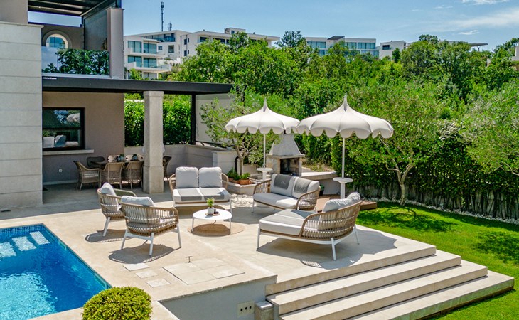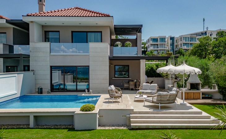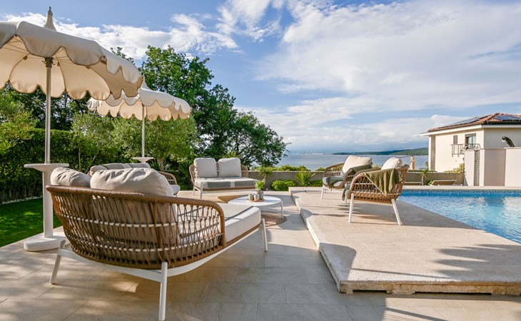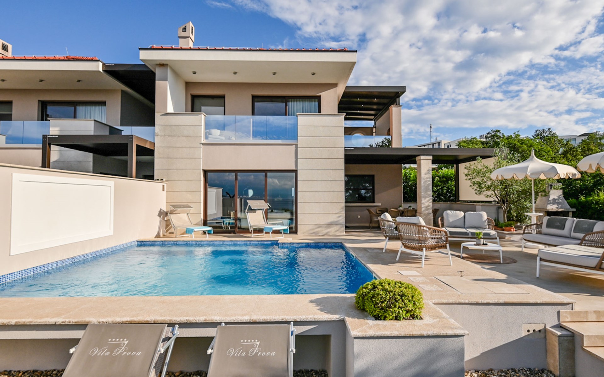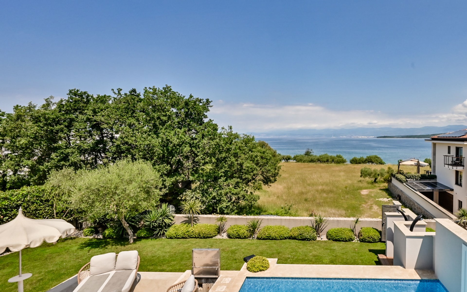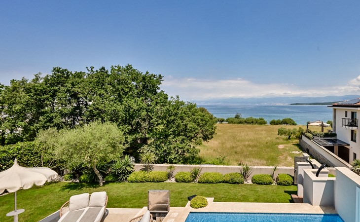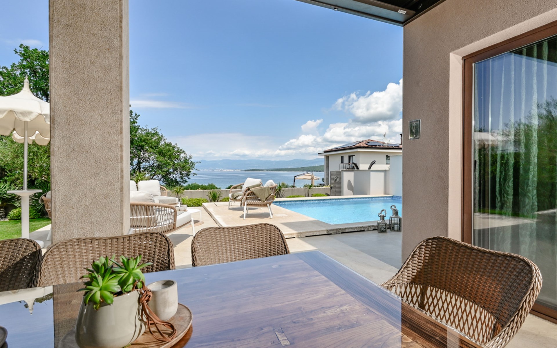Zidarići 3 km from Malinska: Beautiful terraced house "Villa Prestige Deluxe", 2 storeys. 2.6 km from the centre of Malinska, 14 km from the centre of Krk, 150 m from the sea, 150 m from the beach. For shared use: indoor pool angular heated (6 x 3 m, depth 140 cm, seasonal availability: 01.Jan. - 01.May. and 01.Oct. - 31.Dec.) with internal staircase and salt-electrolysis pool-cleaning system. Pool maintenance by the owner/gardener. Private: property 400 m2 (fenced) with wildlife garden and trees, beautiful garden to relax, swimming pool angular (6 x 5 m, depth 140 cm, seasonal availability: 01.May. - 01.Oct.) with internal staircase and salt-electrolysis pool-cleaning system. Outdoor shower, terrace (100 m2), garden furniture, barbecue, pool maintenance by the owner/gardener. In the house: internet access, sauna, fitness room, relaxation room, air conditioning, washing machine. Parking (for 2 cars) at the house on the premises. Shop 1 km, supermarket 4 km, restaurant 200 m, bus stop 1.7 km, ferry 15 km, shingle beach 150 m. Marina 15 km, tennis 8 km. Please note: airfield 12 km from the property. Sauna, fitness room, relaxation room for shared use. The indoor pool is heated only during the months outside the summer season.