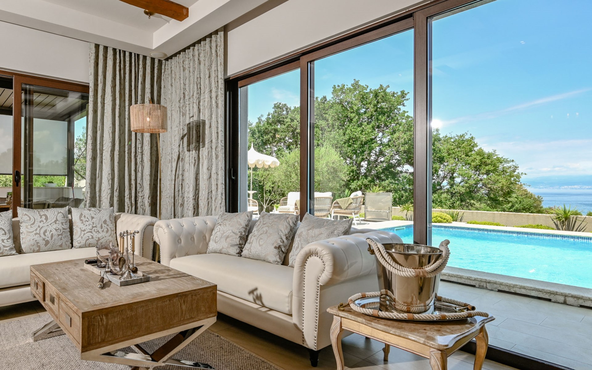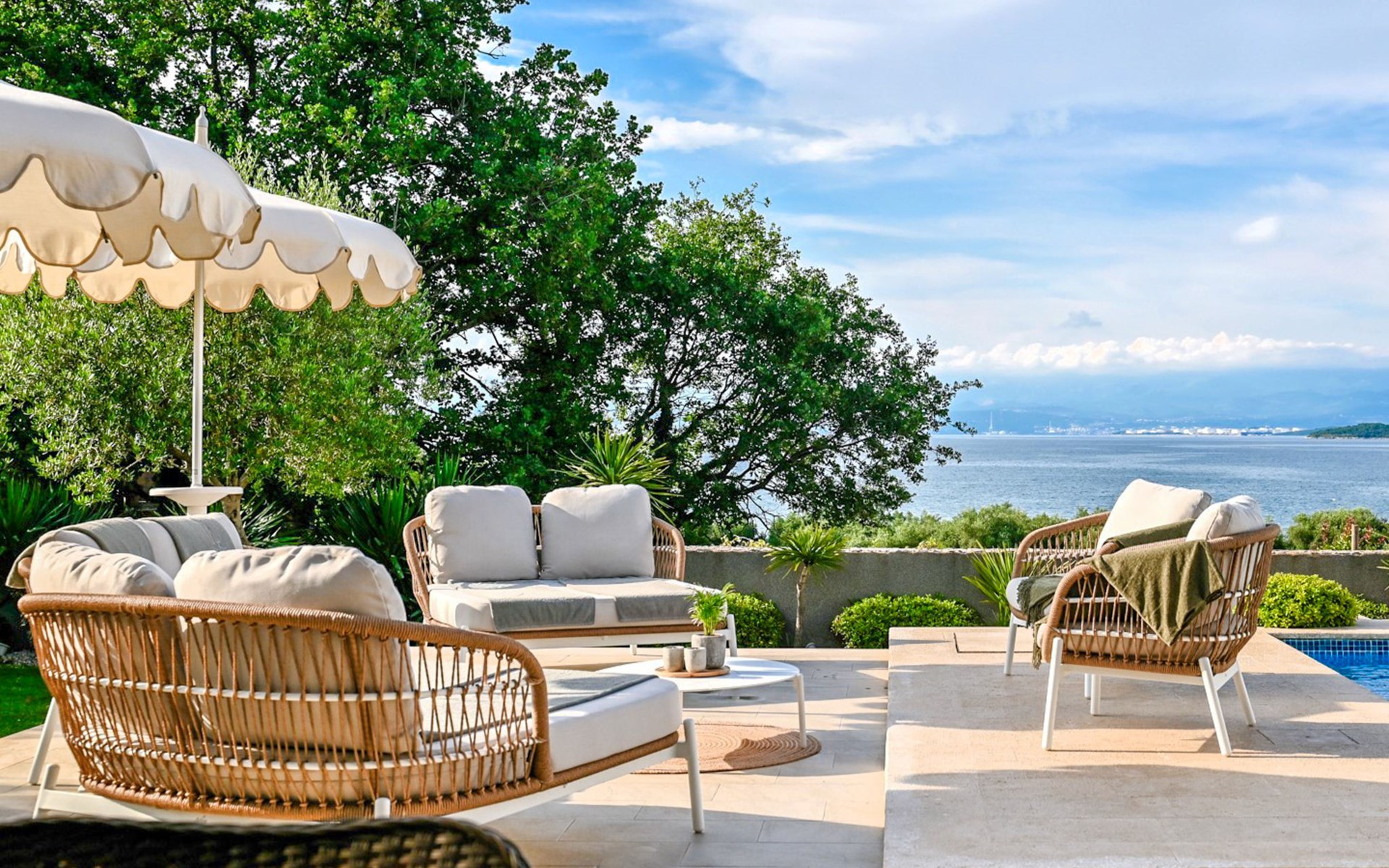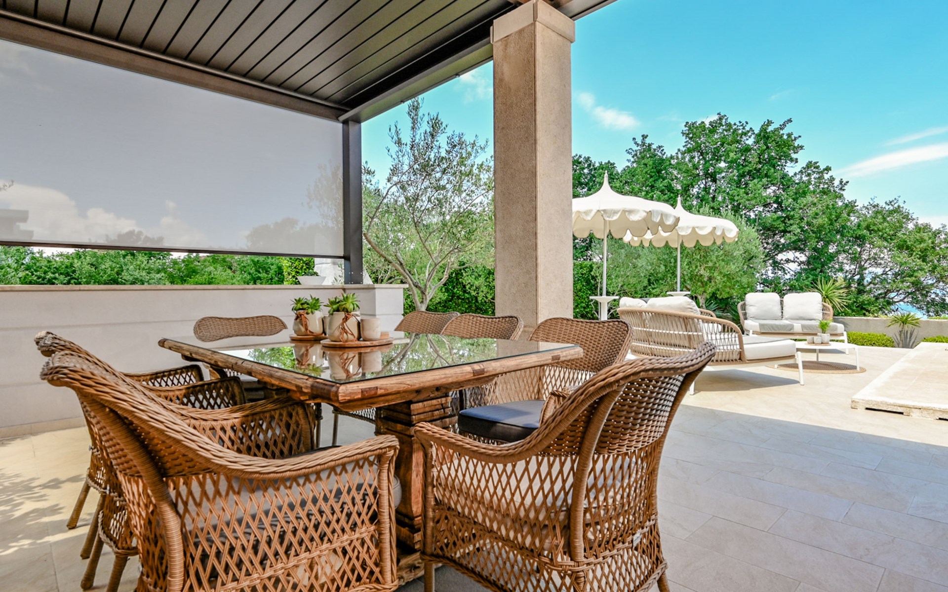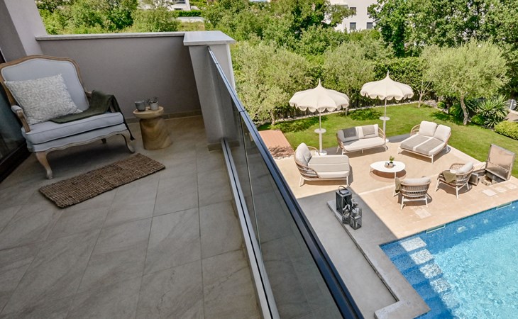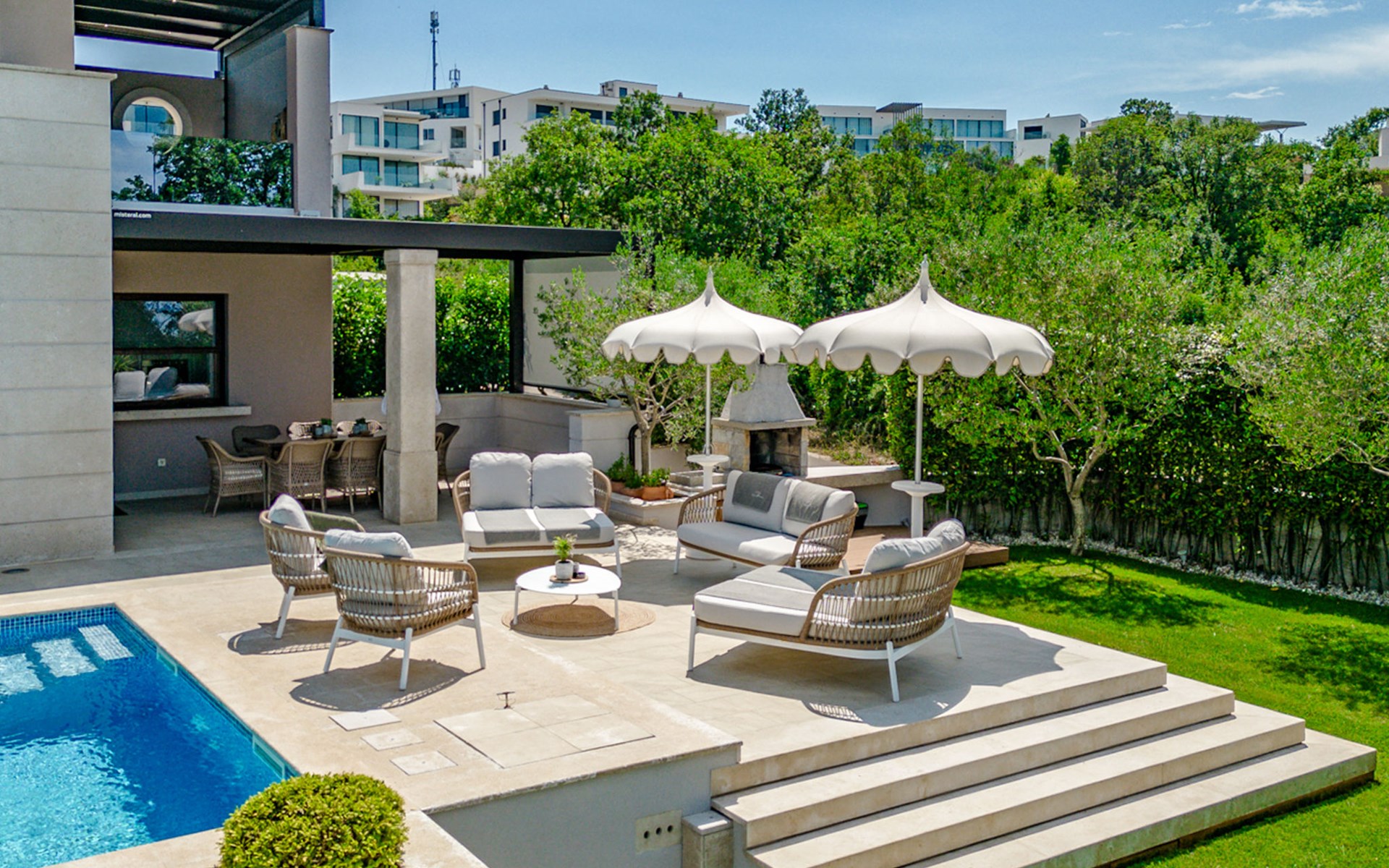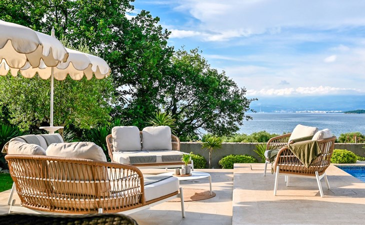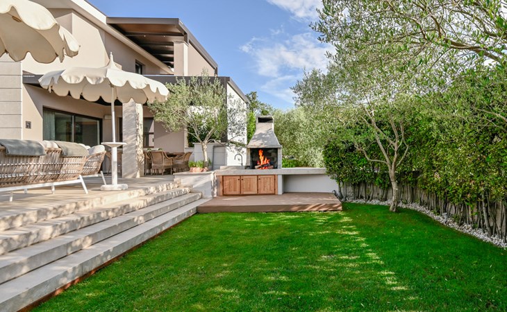Zidarići 3 km from Malinska: Beautiful terraced house "Villa Prestige Deluxe", 2 storeys. 2.6 km from the centre of Malinska, 14 km from the centre of Krk, 150 m from the sea, 150 m from the beach. For shared use: indoor pool angular heated (6 x 3 m, depth 140 cm, seasonal availability: 01.Jan. - 01.May. and 01.Oct. - 31.Dec.) with internal staircase and salt-electrolysis pool-cleaning system. Pool maintenance by the owner/gardener. Private: property 400 m2 (fenced) with wildlife garden and trees, beautiful garden to relax, swimming pool angular (6 x 5 m, depth 140 cm, seasonal availability: 01.May. - 01.Oct.) with internal staircase and salt-electrolysis pool-cleaning system. Outdoor shower, terrace (100 m2), garden furniture, barbecue, pool maintenance by the owner/gardener. In the house: internet access, sauna, fitness room, relaxation room, air conditioning, washing machine. Parking (for 2 cars) at the house on the premises. Shop 1 km, supermarket 4 km, restaurant 200 m, bus stop 1.7 km, ferry 15 km, shingle beach 150 m. Marina 15 km, tennis 8 km. Please note: airfield 12 km from the property. Sauna, fitness room, relaxation room for shared use. The indoor pool is heated only during the months outside the summer season.