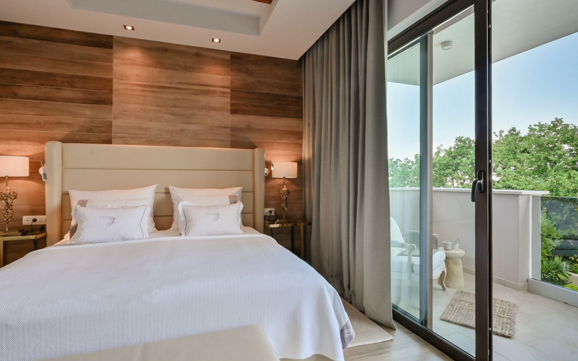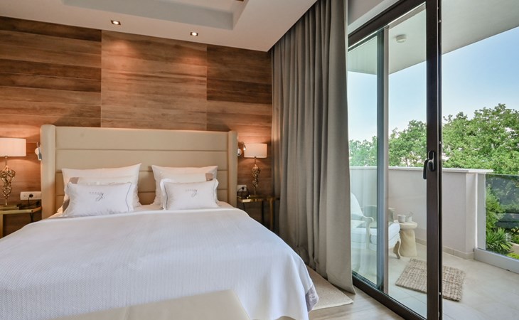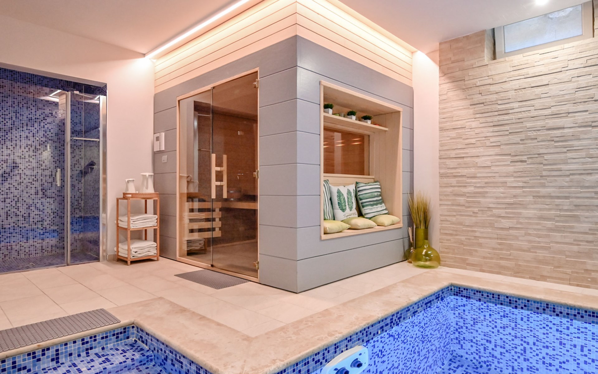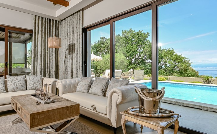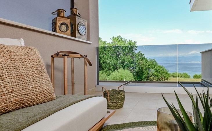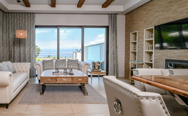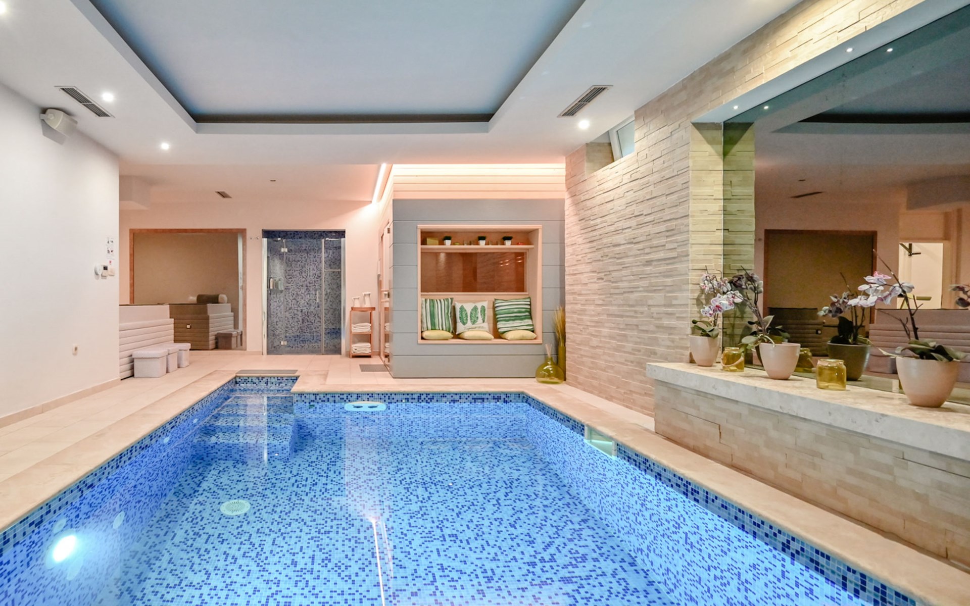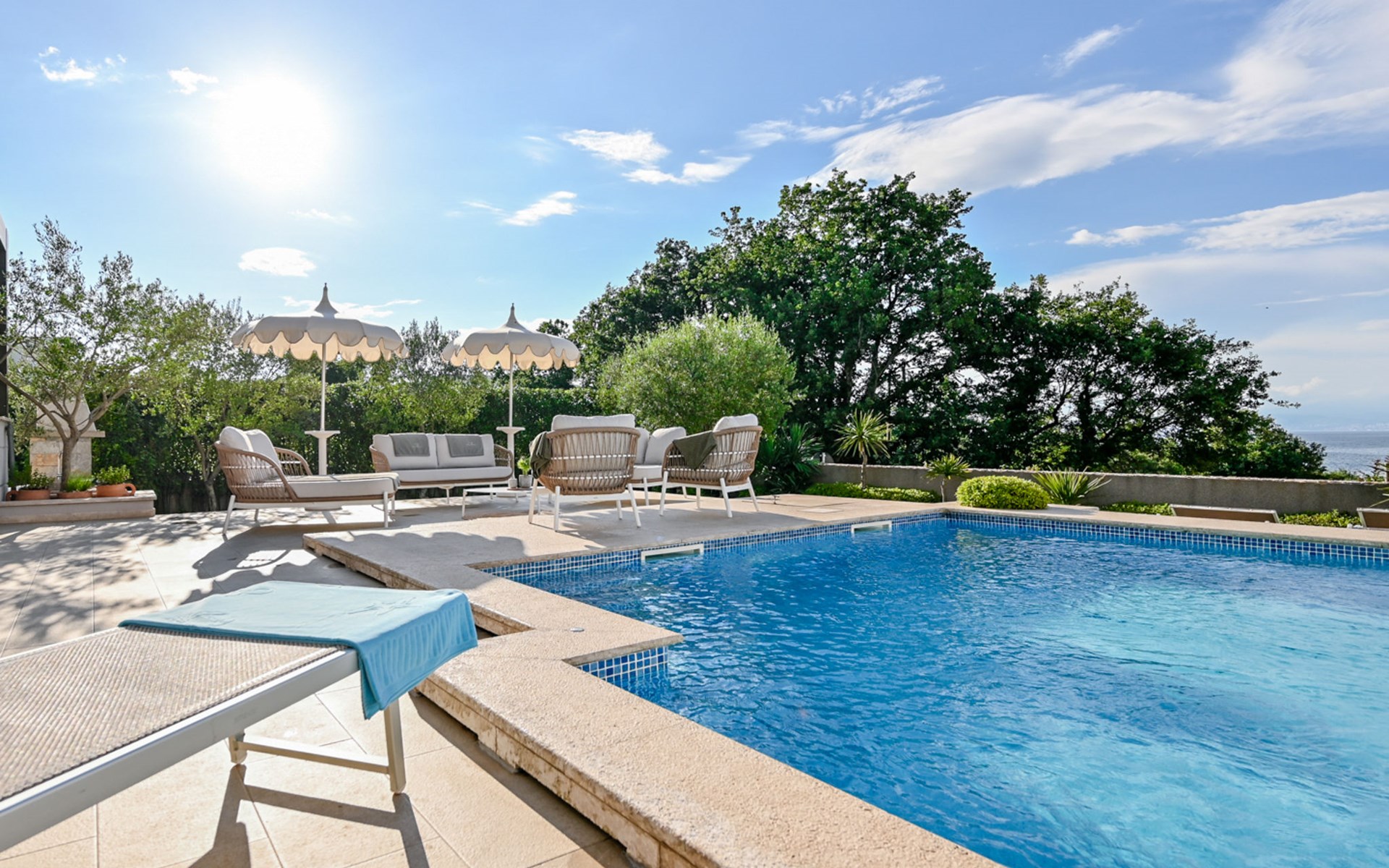 Zidarići 3 km from Malinska: Beautiful terraced house "Villa Prestige Deluxe", 2 storeys. 2.6 km from the centre of Malinska, 14 km from the centre of Krk, 150 m from the sea, 150 m from the beach. For shared use: indoor pool angular heated (6 x 3 m, depth 140 cm, seasonal availability: 01.Jan. - 01.May. and 01.Oct. - 31.Dec.) with internal staircase and salt-electrolysis pool-cleaning system. Pool maintenance by the owner/gardener. Private: property 400 m2 (fenced) with wildlife garden and trees, beautiful garden to relax, swimming pool angular (6 x 5 m, depth 140 cm, seasonal availability: 01.May. - 01.Oct.) with internal staircase and salt-electrolysis pool-cleaning system. Outdoor shower, terrace (100 m2), garden furniture, barbecue, pool maintenance by the owner/gardener. In the house: internet access, sauna, fitness room, relaxation room, air conditioning, washing machine. Parking (for 2 cars) at the house on the premises. Shop 1 km, supermarket 4 km, restaurant 200 m, bus stop 1.7 km, ferry 15 km, shingle beach 150 m. Marina 15 km, tennis 8 km. Please note: airfield 12 km from the property. Sauna, fitness room, relaxation room for shared use. The indoor pool is heated only during the months outside the summer season.