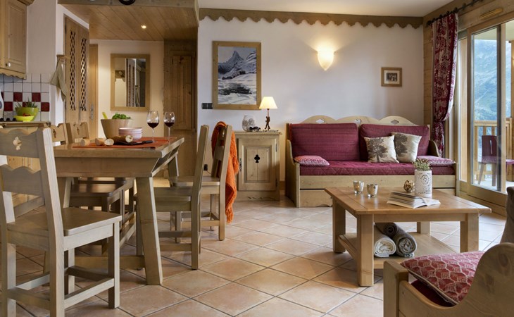 Beautiful, rustic, comfortable residence "CGH Résidence & Spa Le Cœur d'Or". 40 apartments in the residence. 800 m from the centre of Bourg St. Maurice, 55 km from the centre of Albertville, 15 km from the centre of Les Arcs, 15 km from the skiing area. For shared use: indoor pool heated (12 x 6 m, seasonal availability: 01.Jan. - 31.Dec.). In the complex: reception, lounge, WiFi, sauna, fitness room, massage (extra). Steam room, lift, storage room for skis, ski boot dryer. Bread roll service. Storeroom available. Parking, communal covered parking (extra). Parking space or garage only for small to medium-sized cars. Dimension: height 200 cm. Supermarket 100 m, shopping centre 100 m, restaurant, railway station "Bourg St. Maurice" 750 m. Golf course (18 hole) 10 km, skisport facilities 15 km. Well-known ski regions can easily be reached: Paradiski (Les Arcs) 15 km. Please note: baby equipment on request (included). The photograph shows a typical example. The holiday properties may differ in living space, floorplan, equipment and furnishing.