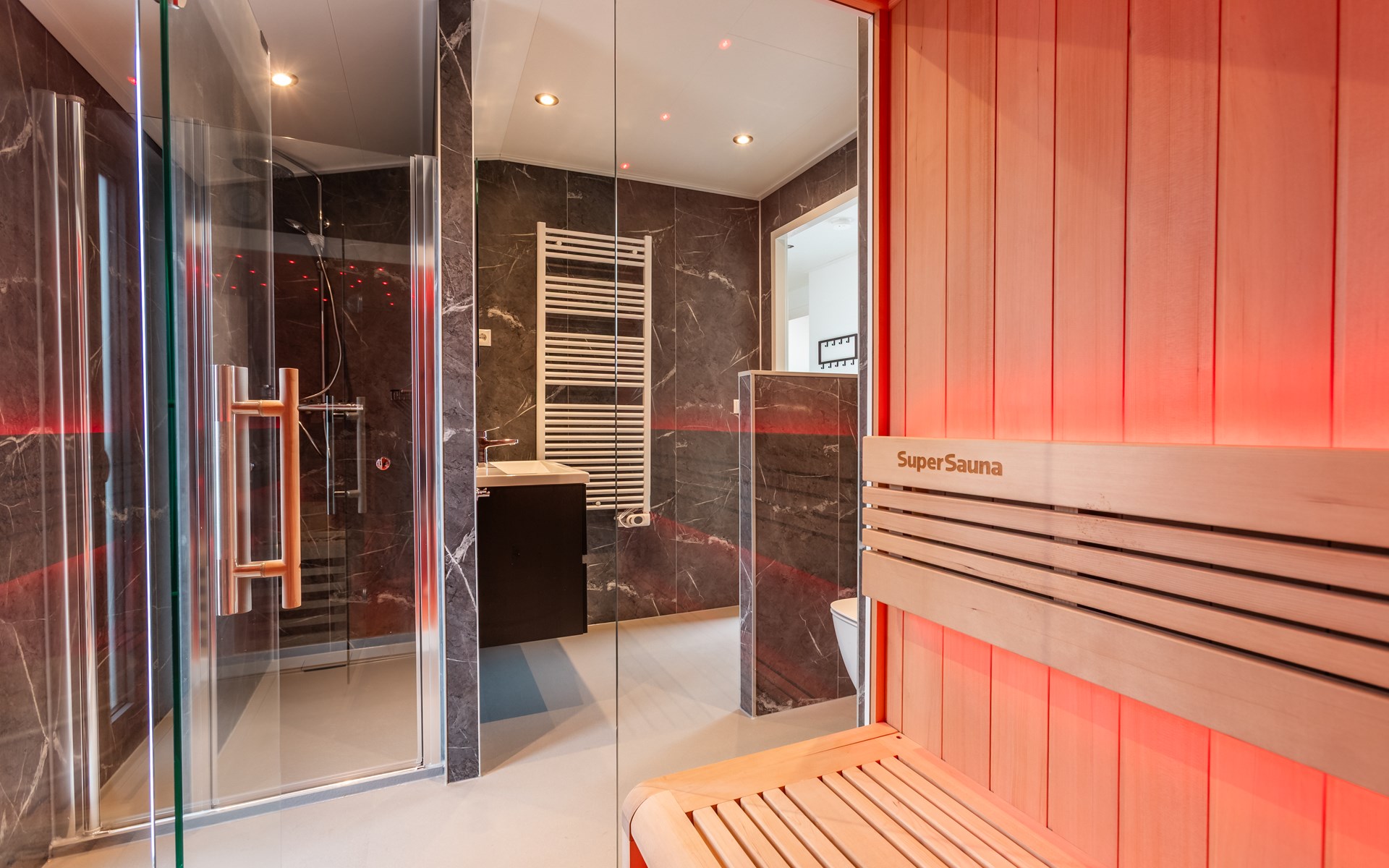 The home features three bedrooms, including a master bedroom with an en-suite bathroom equipped with a walk-in shower. Additionally, there is a second bathroom with a double shower and a private sauna, perfect for unwinding. For extra convenience, there are also two separate toilets.