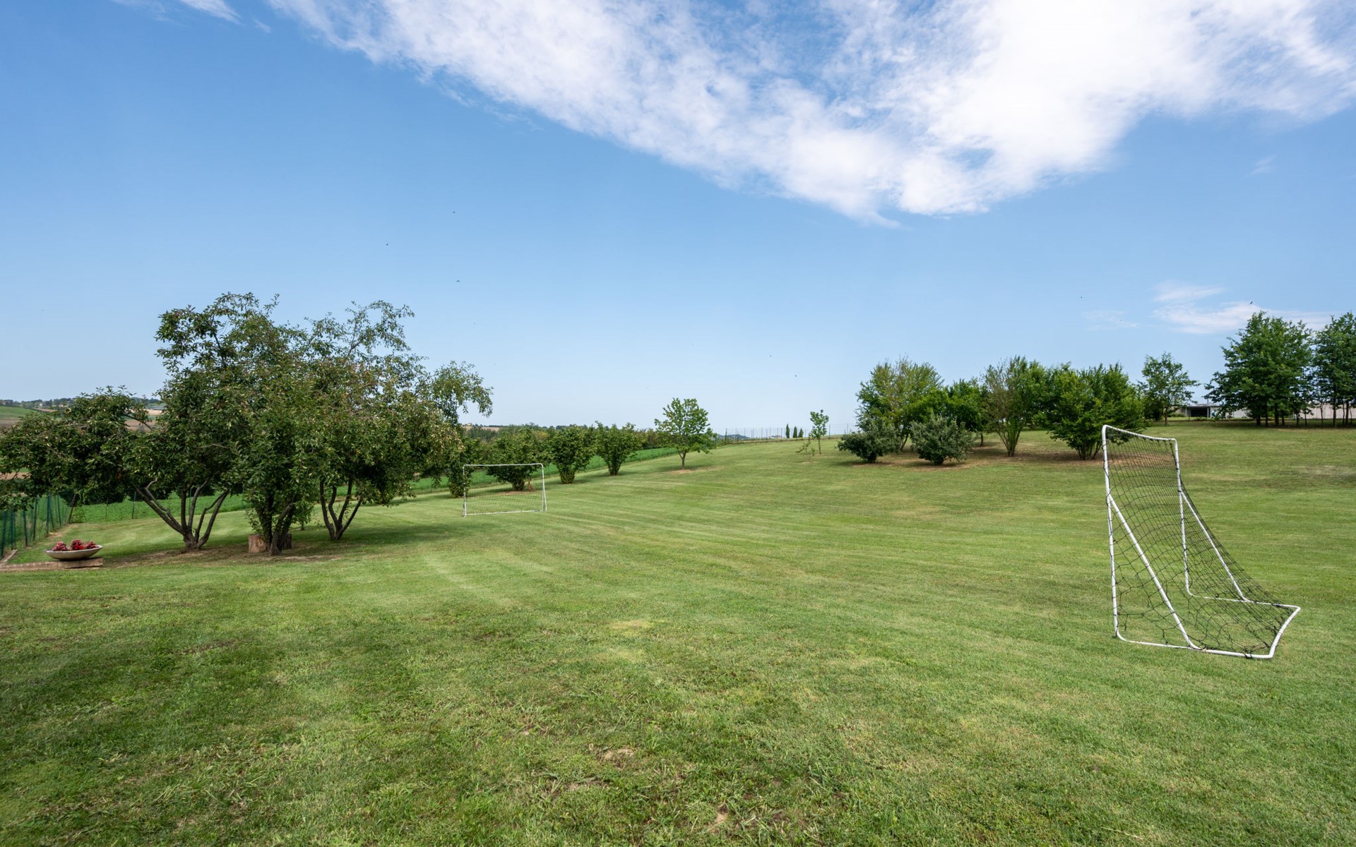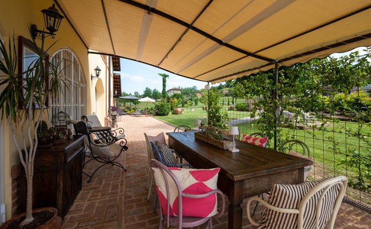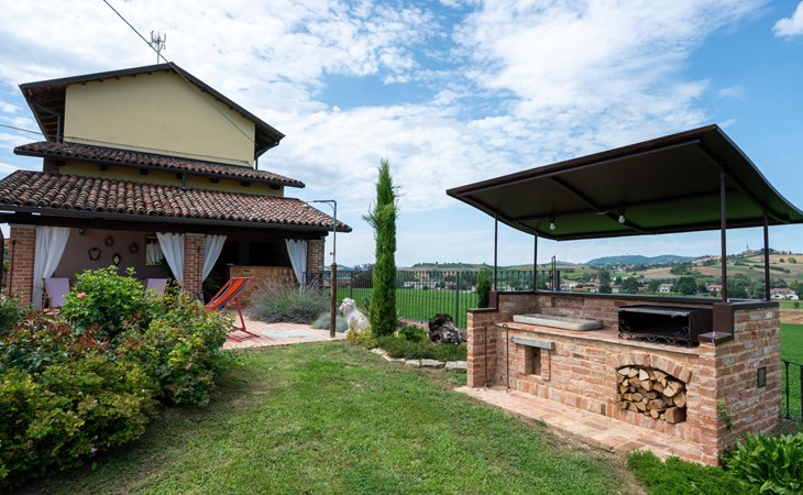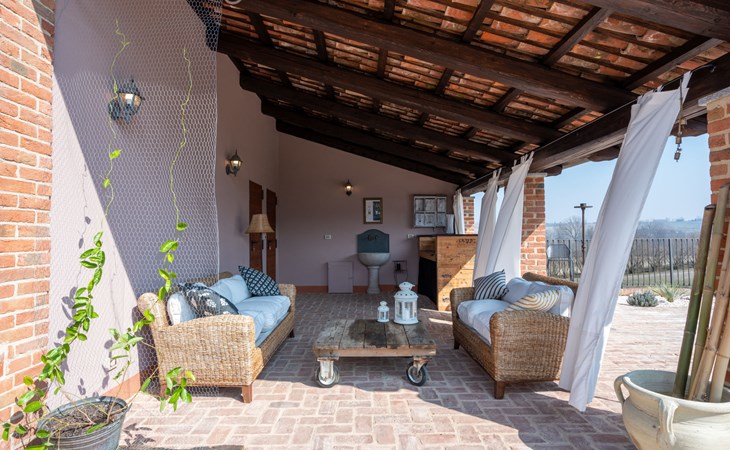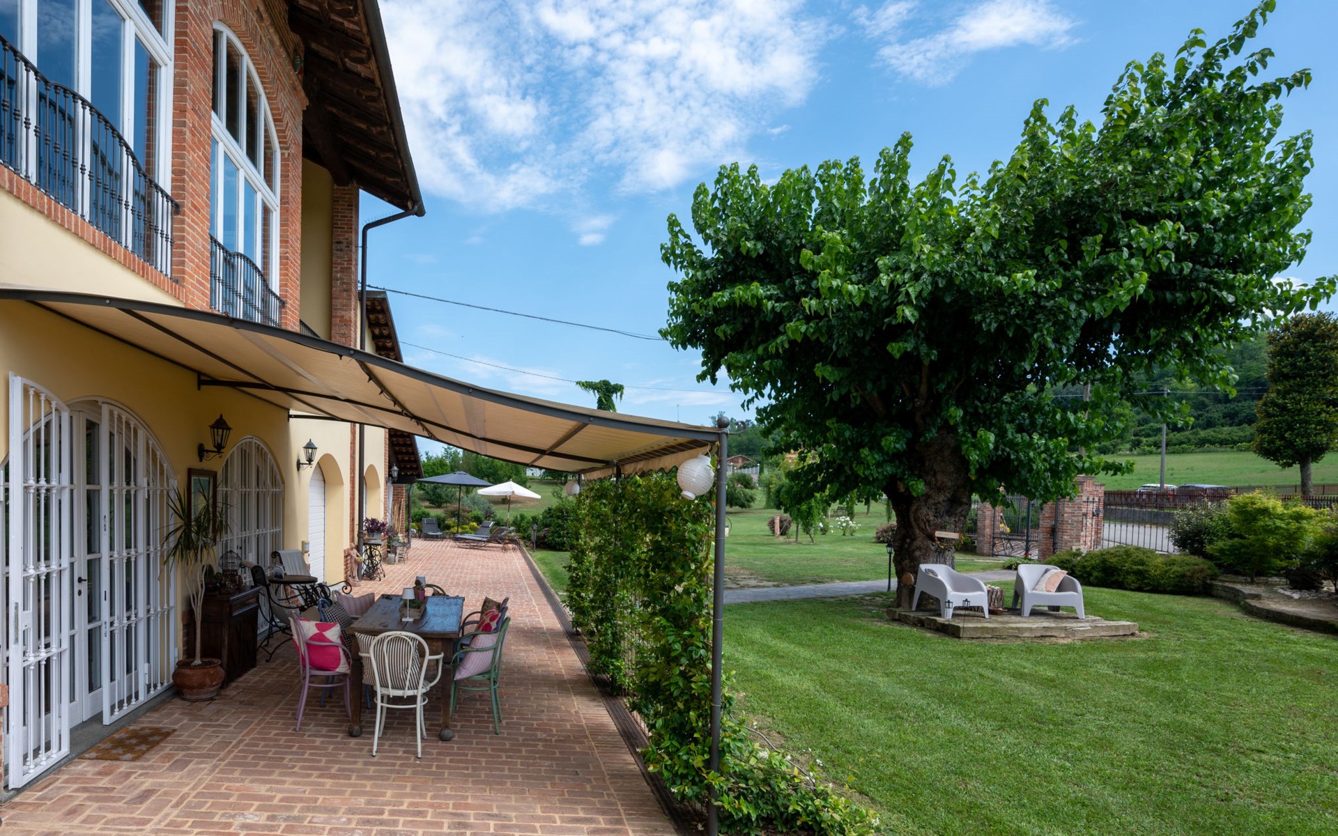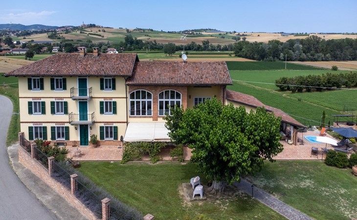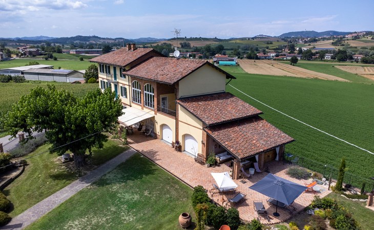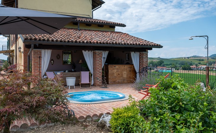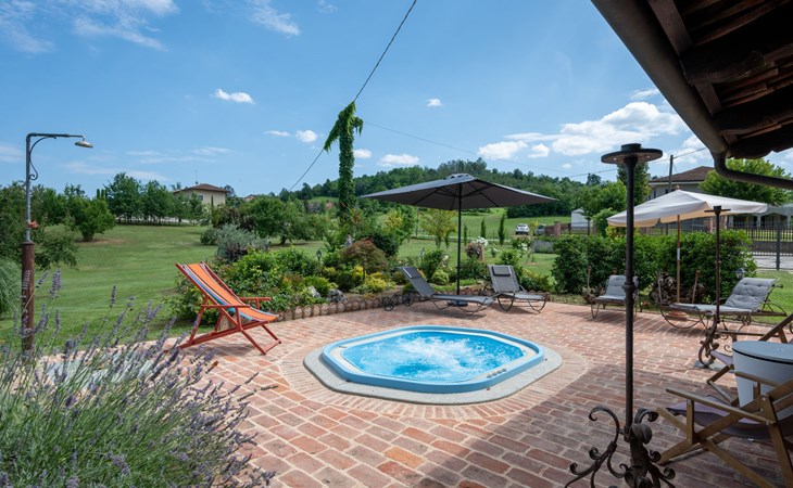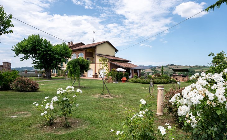 Large cottage "La Bell'aria", detached. On the outskirts, 1 km from the centre of Frinco, in an elevated position. Private: property 4'500 m2 (fenced) with wildlife garden and trees, natural garden, meadow. Outdoor shower, hot tub, table tennis, badminton, patio, pergola (20 m2), terrace, garden furniture, barbecue house, parking (for 3 cars) at the house on the premises. Bus stop 1 km. Nearby attractions: Asti 15 km, Casale Monferrato 37 km, Alba 45 km, La Morra 55 km, Barolo 52 km, Torino 76 km. Please note: car recommended. The tub is open from 30.04. to 15.09. The pool of the Bistro (20 x4 m, 01.06.-15.09.) located at a distance of ca. 100 m, can be used by our guests for a fee of: EUR 15 per person/day.