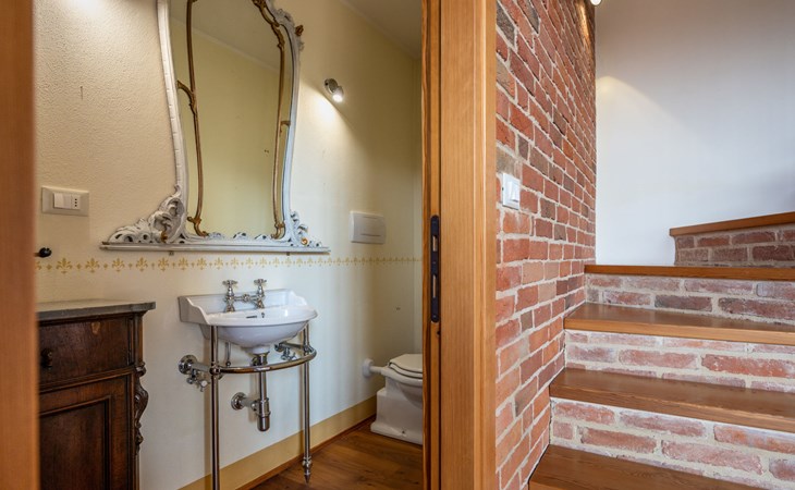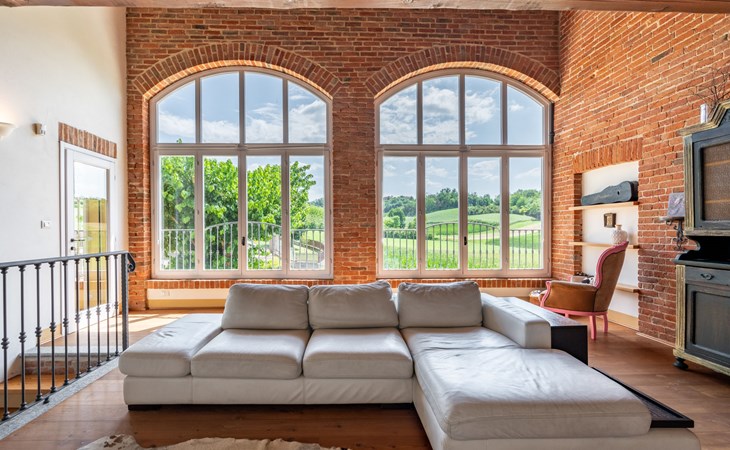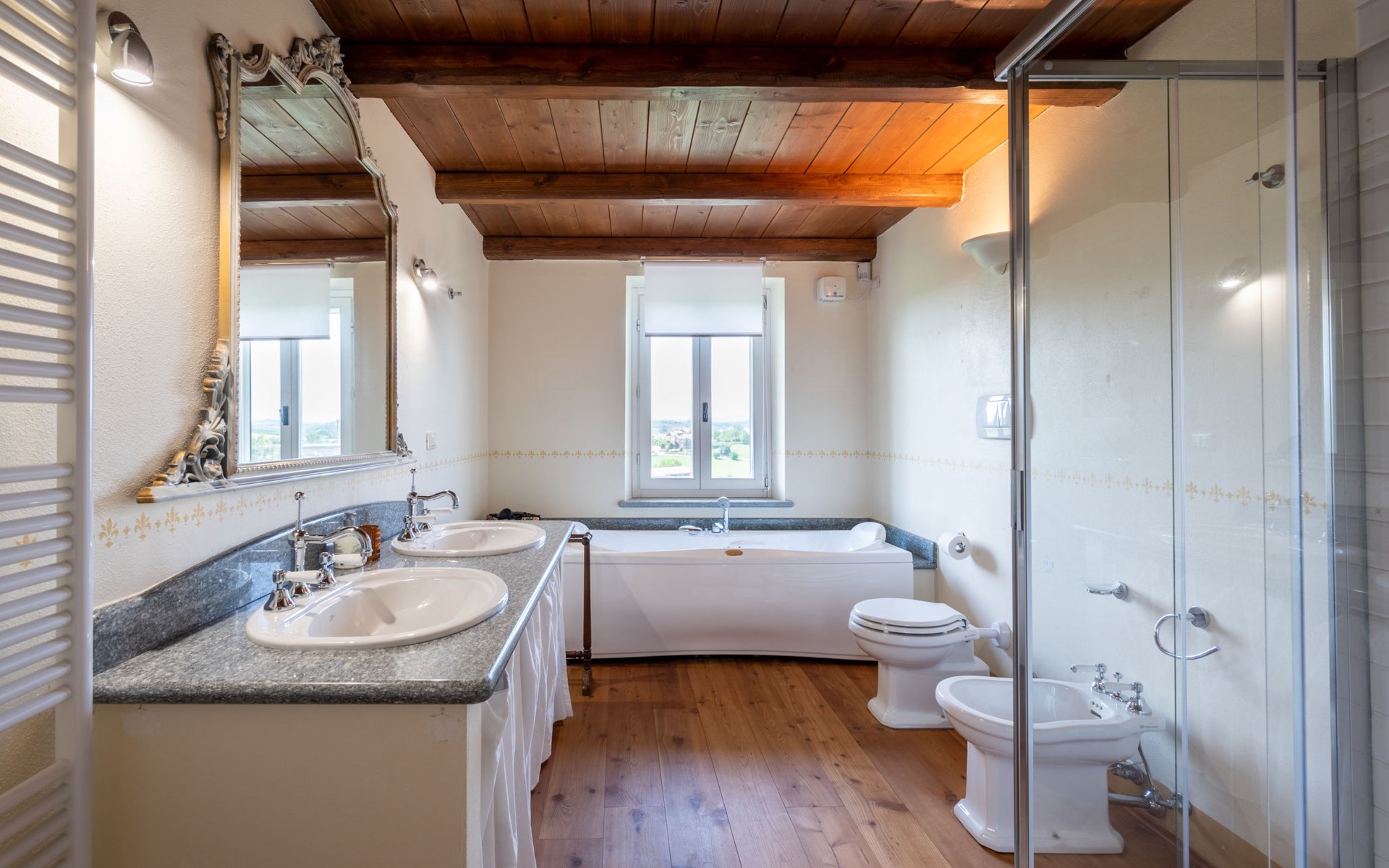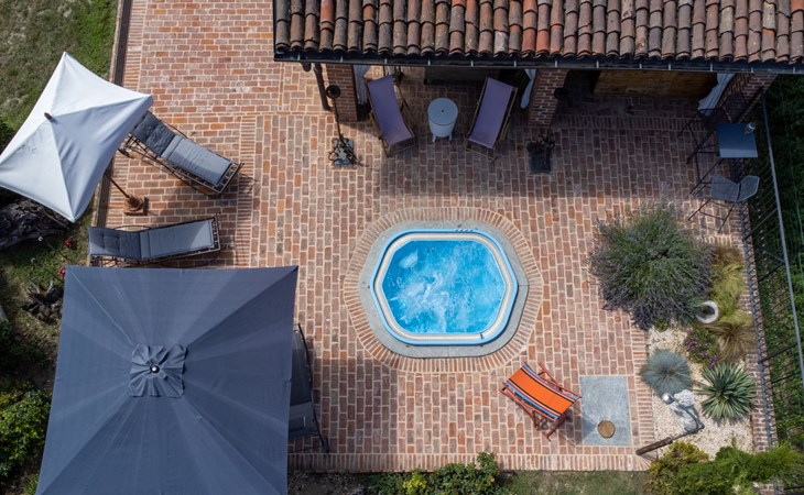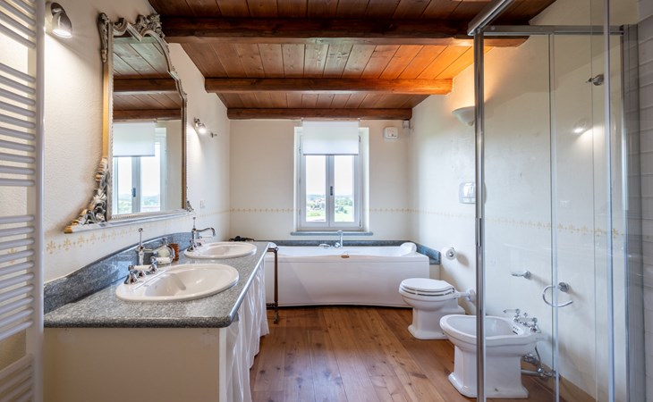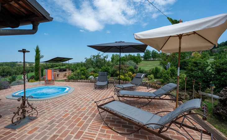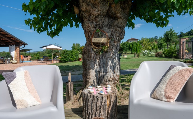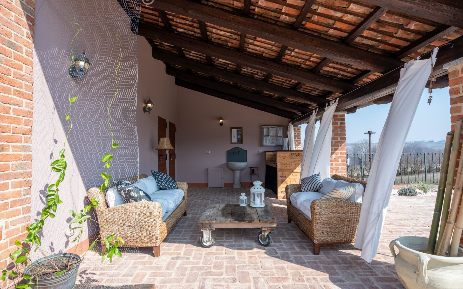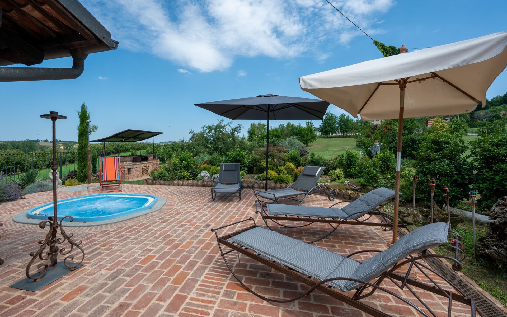 Large cottage "La Bell'aria", detached. On the outskirts, 1 km from the centre of Frinco, in an elevated position. Private: property 4'500 m2 (fenced) with wildlife garden and trees, natural garden, meadow. Outdoor shower, hot tub, table tennis, badminton, patio, pergola (20 m2), terrace, garden furniture, barbecue house, parking (for 3 cars) at the house on the premises. Bus stop 1 km. Nearby attractions: Asti 15 km, Casale Monferrato 37 km, Alba 45 km, La Morra 55 km, Barolo 52 km, Torino 76 km. Please note: car recommended. The tub is open from 30.04. to 15.09. The pool of the Bistro (20 x4 m, 01.06.-15.09.) located at a distance of ca. 100 m, can be used by our guests for a fee of: EUR 15 per person/day.