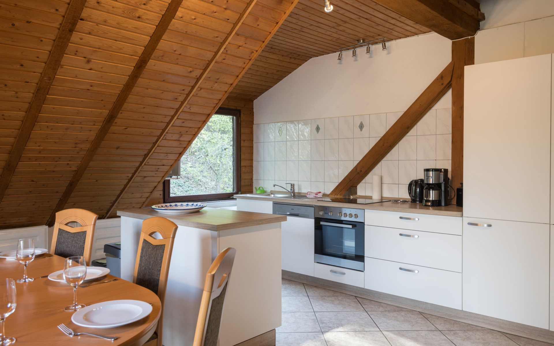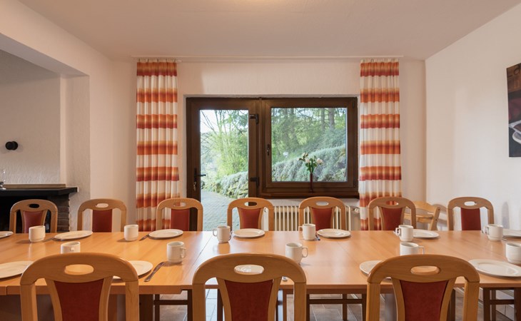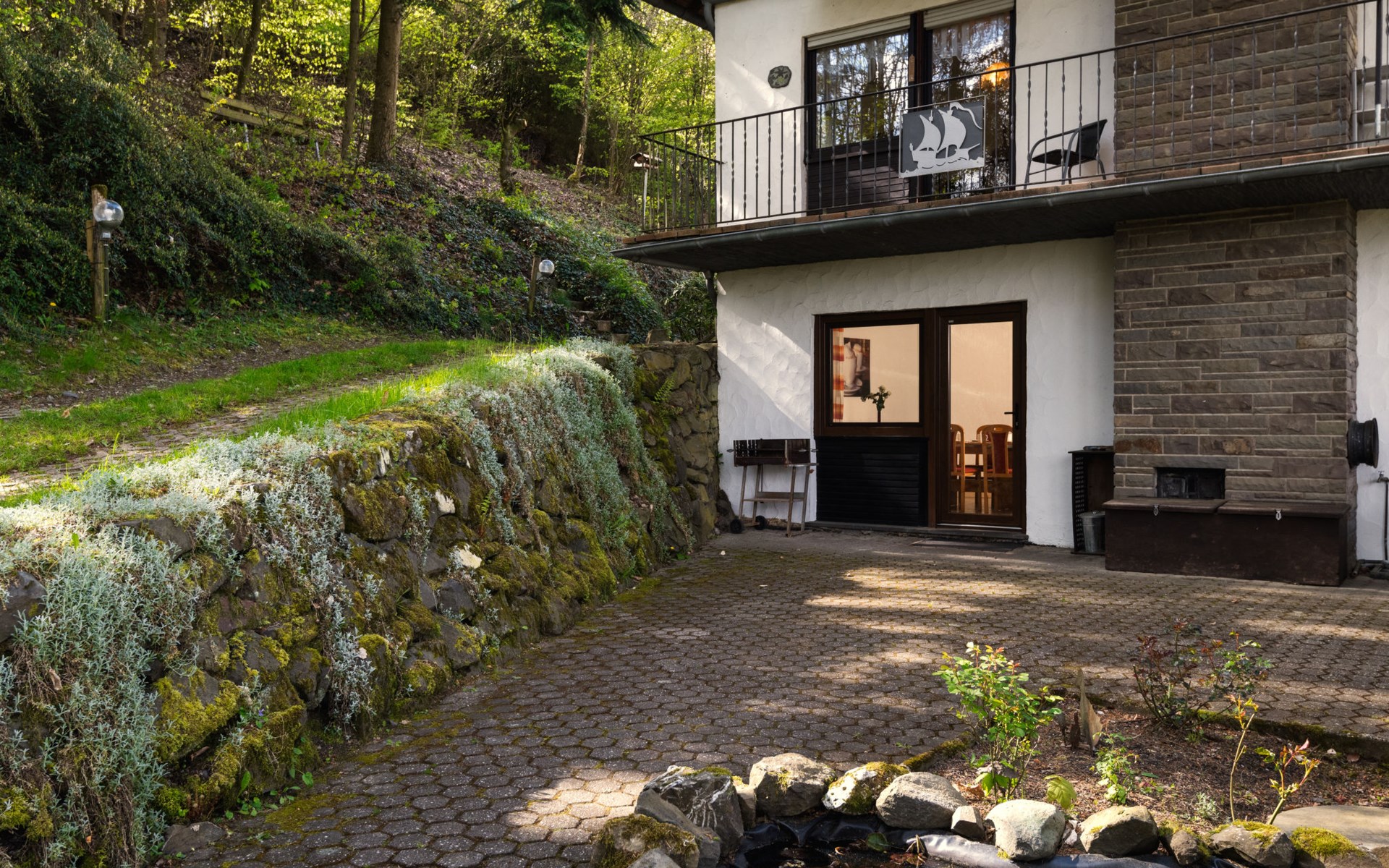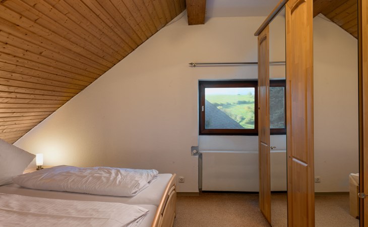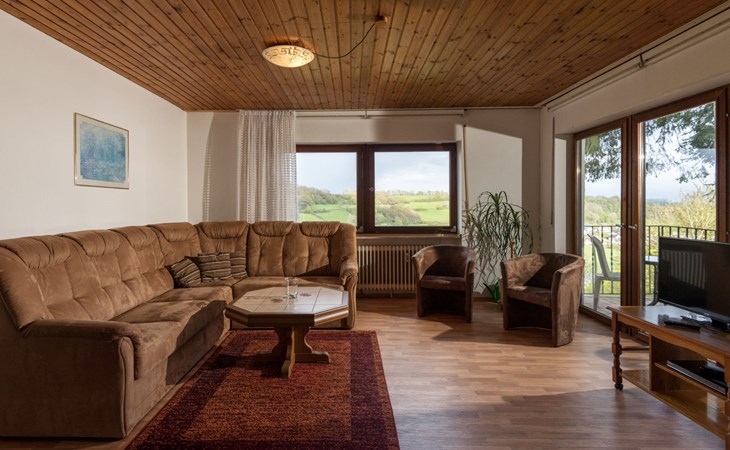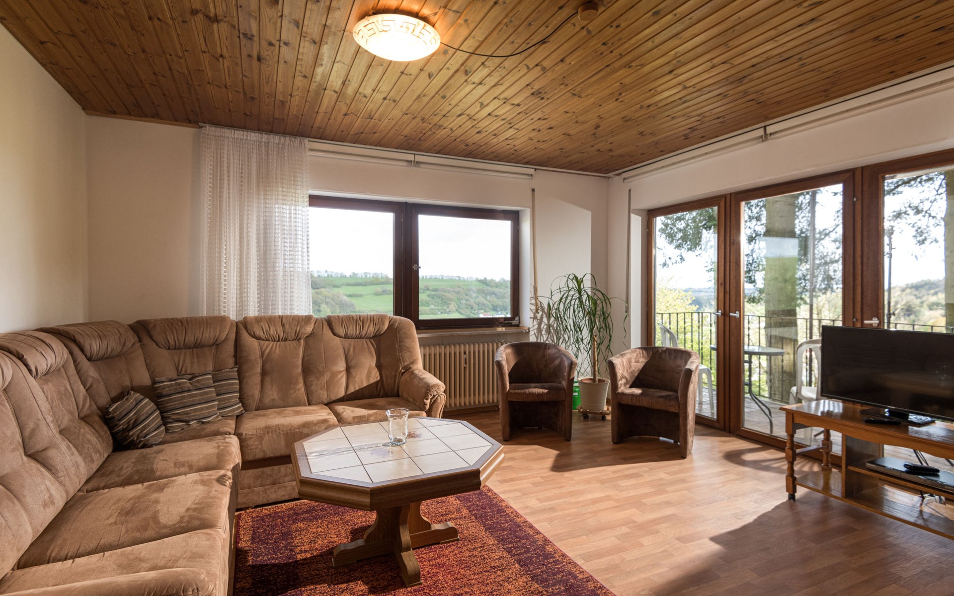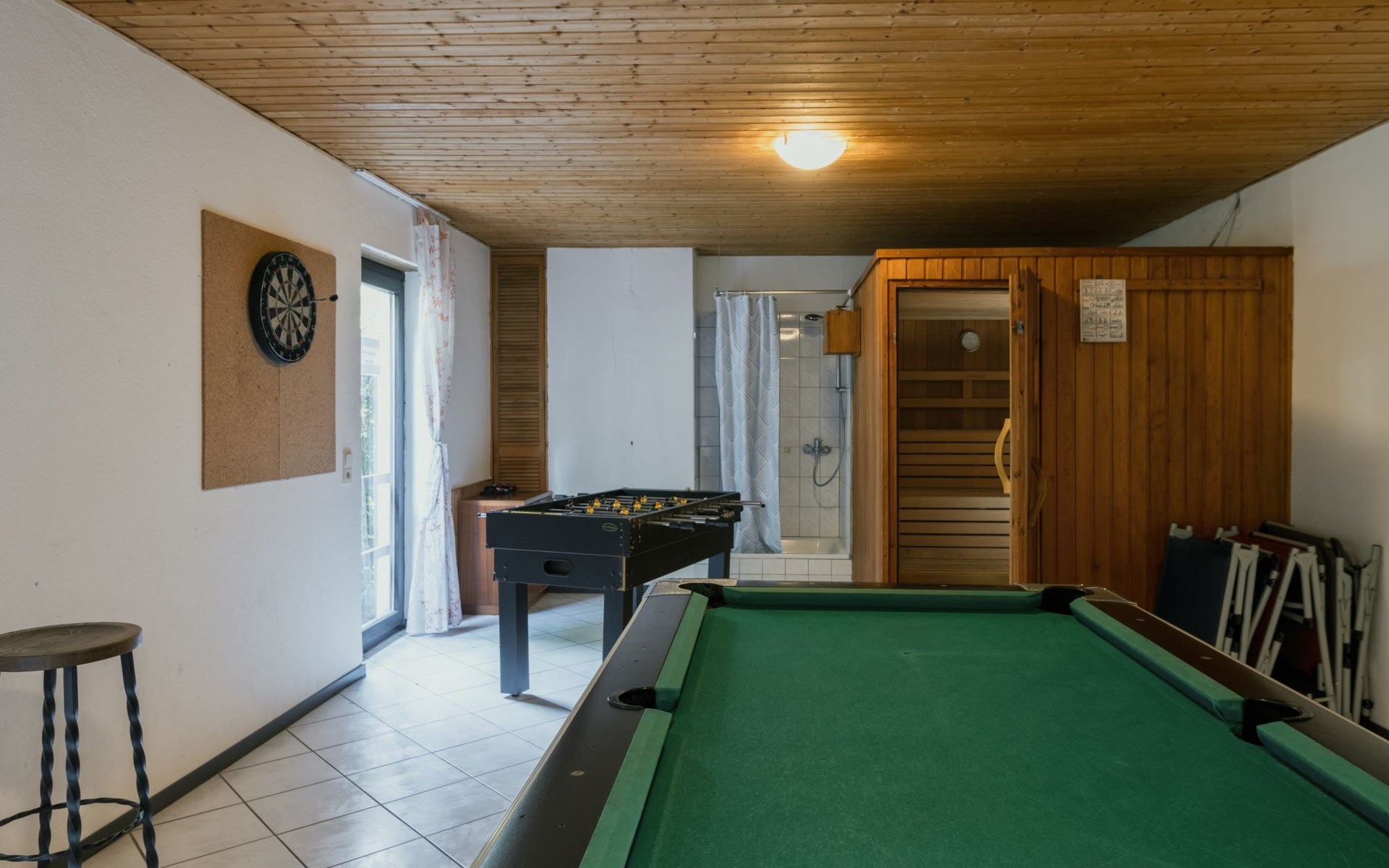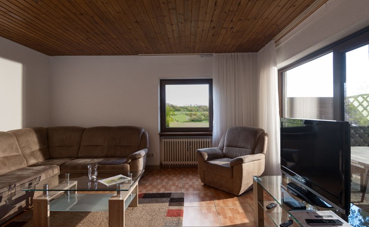 3-family house "Eifelnatur (Haus 1)", surrounded by trees and fields. On the outskirts, 300 m from the centre, in a quiet, elevated position on a slope, 10 m from the edge of the forest, 8 km from the lake, in a cul-de-sac, in the countryside. For shared use: property 1'000 m2, well-kept garden 450 m2 with lawn 300 m2, flowers, pond. Table tennis, children's playground (slide, swing, sandbox). In the house: sauna (extra). Billiard table, table football, storage room for bicycles, central heating system, washing machine (for shared use, extra). Linen change weekly. Towel change weekly. Bread roll service and beverage service possible on request (extra). Stepped path (25 steps) to the house. Grocery 5.3 km, supermarket 5.3 km, shopping centre 5 km, restaurant 150 m, bar 3.3 km, bakery 5.3 km, café 3.3 km, bicycle rental 10 km, bus stop "Daun" 10 km, railway station "Gerolstein" 23 km, outdoor swimming pool 7.6 km, indoor swimming pool 10 km, bathing lake 7.6 km. Golf course (18 hole) 15 km, tennis 3.5 km, minigolf 7.8 km, riding stable 10 km, walking paths from the house 50 m. Nearby attractions: Vulkanmaare, Vulkanmuseum, Kreuzweg, Strohner Märchen, Wildpark Daun, Adler- und Wolfspark Kasselburg. Well-known lakes can easily be reached: Pulvermaar 1.5 km. Please note: car recommended. The owner does not accept any youth groups. Loading and unloading of baggage is possible at the holiday house. Neighbourhood highly sensitive to noise. Quietness and good behaviour expected. Self-service bar with drinks and food in the house (extra). It is also accessible to guests from the other two houses. The leisure room / sauna is located in the neighboring house and is for all guests.