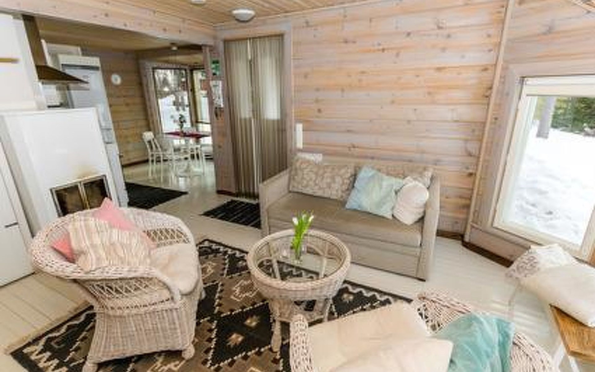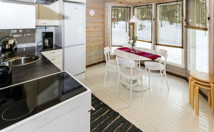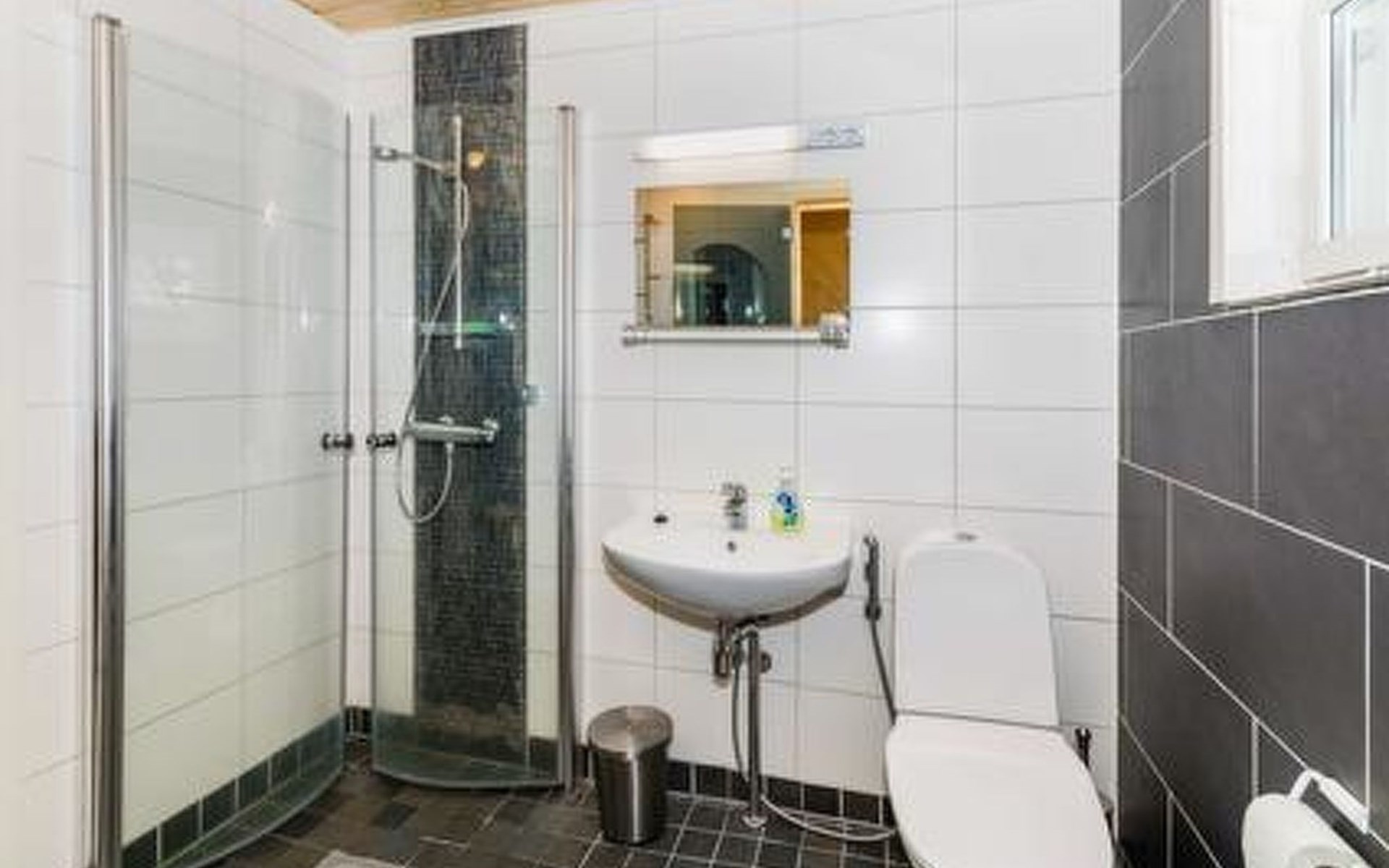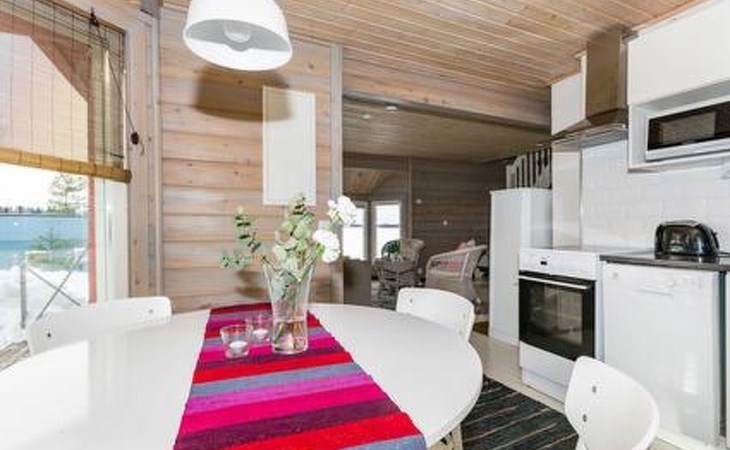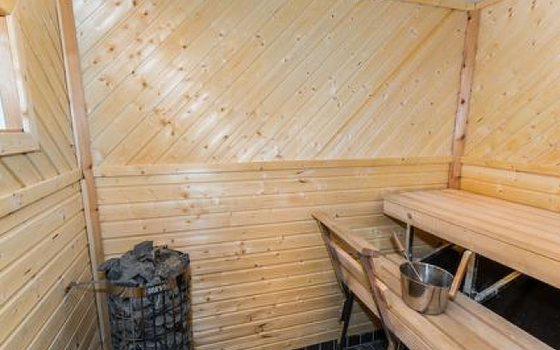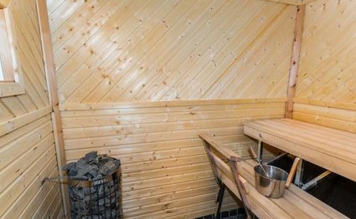 Downstairs kitchen, living room with couch (120 cm), combined toilet/washroom and sauna.