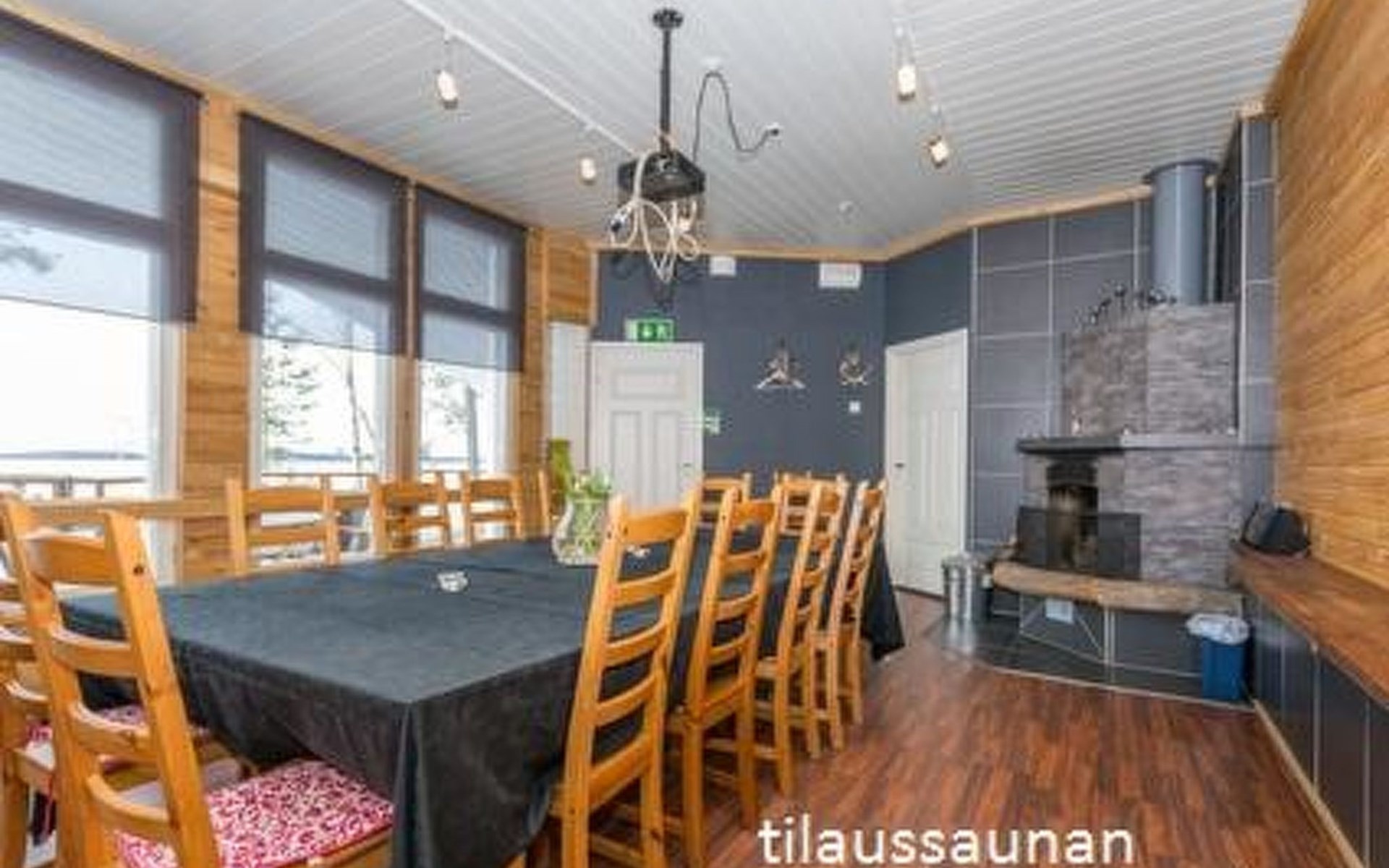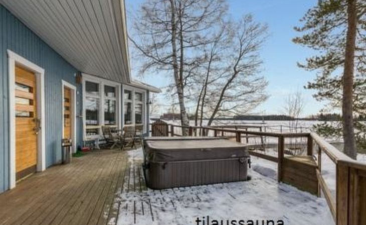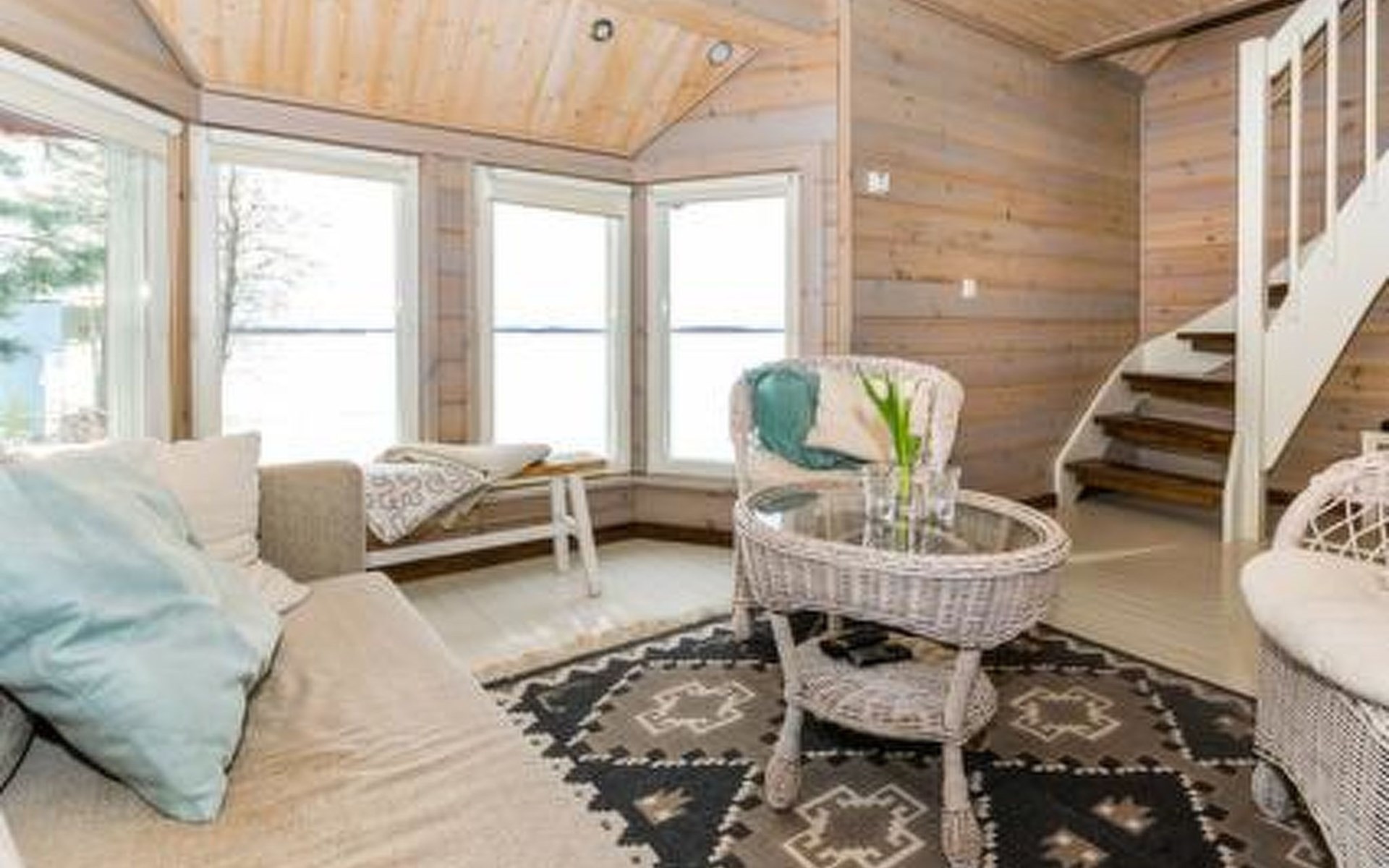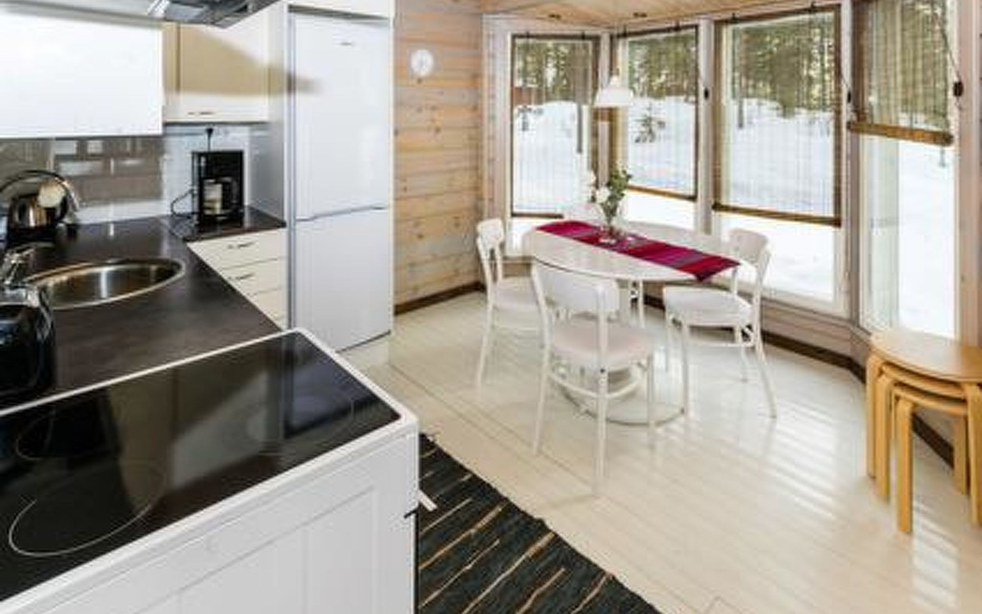 Downstairs kitchen, living room with couch (120 cm), combined toilet/washroom and sauna.