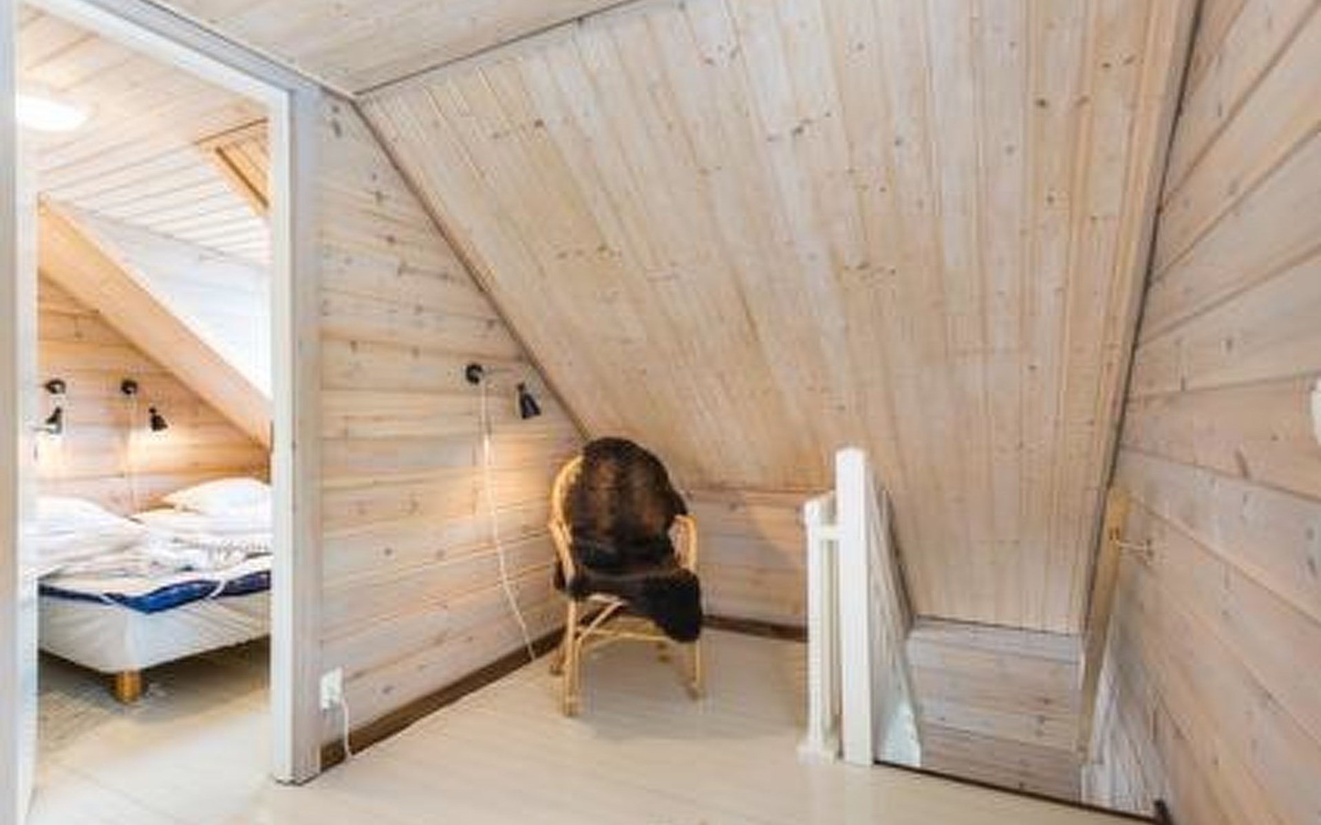Upstairs bedroom with double bed (from bedroom access to a small balcony). Lobby area with convertible sofa bed (140 cm wide).