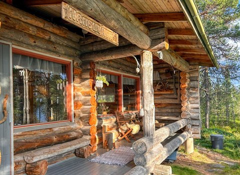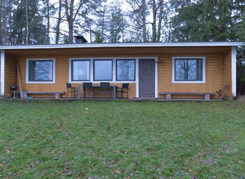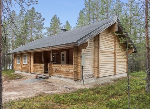 Log terraced house with three apartments, built in 1990, living room/kitchen, 2 bedrooms: 2 beds in each one (width 120 cm), sleeping loft with 4 beds, washroom, sauna (elec. stove), open porch.