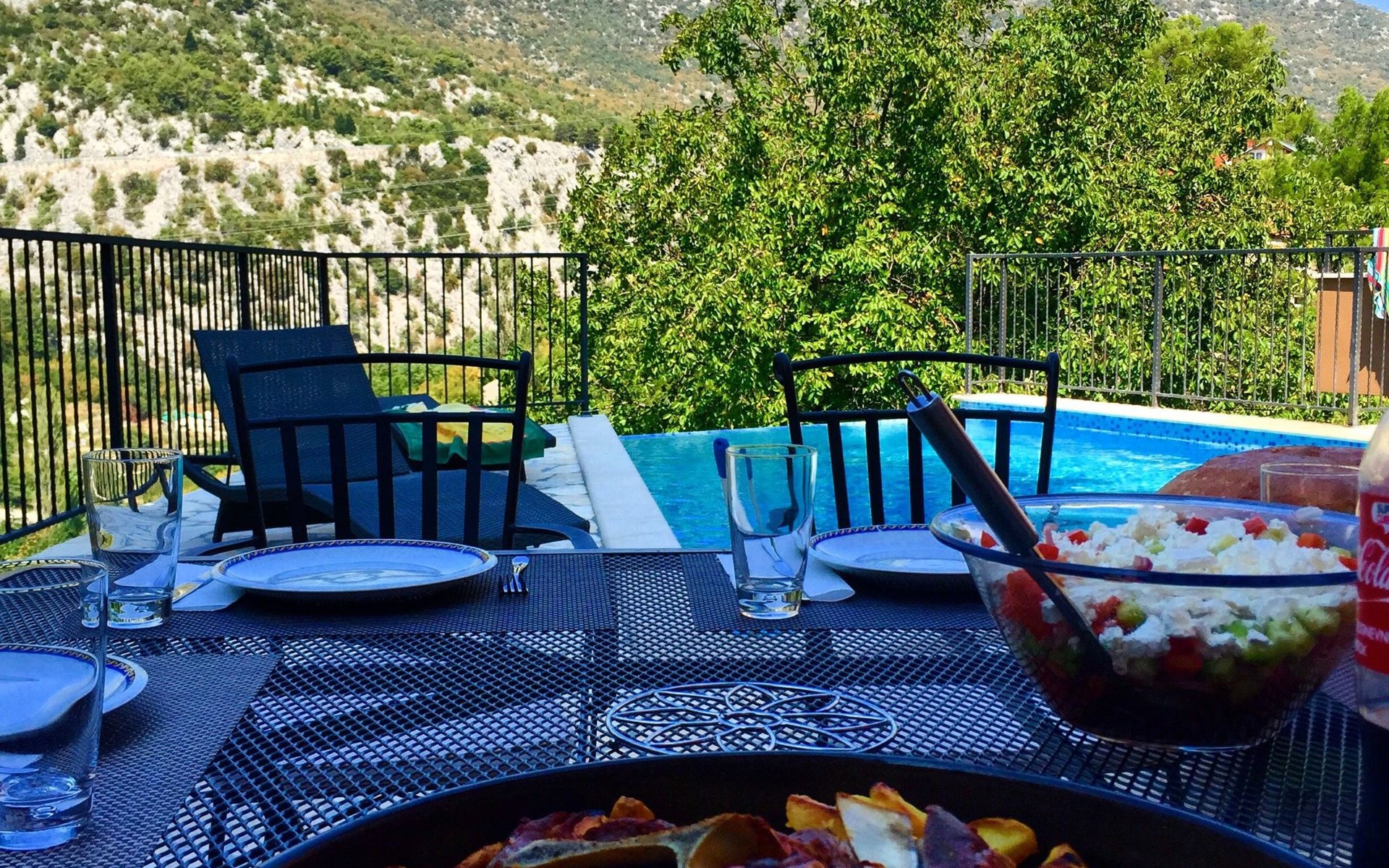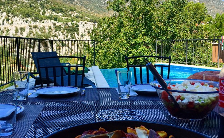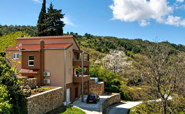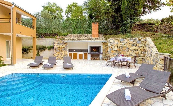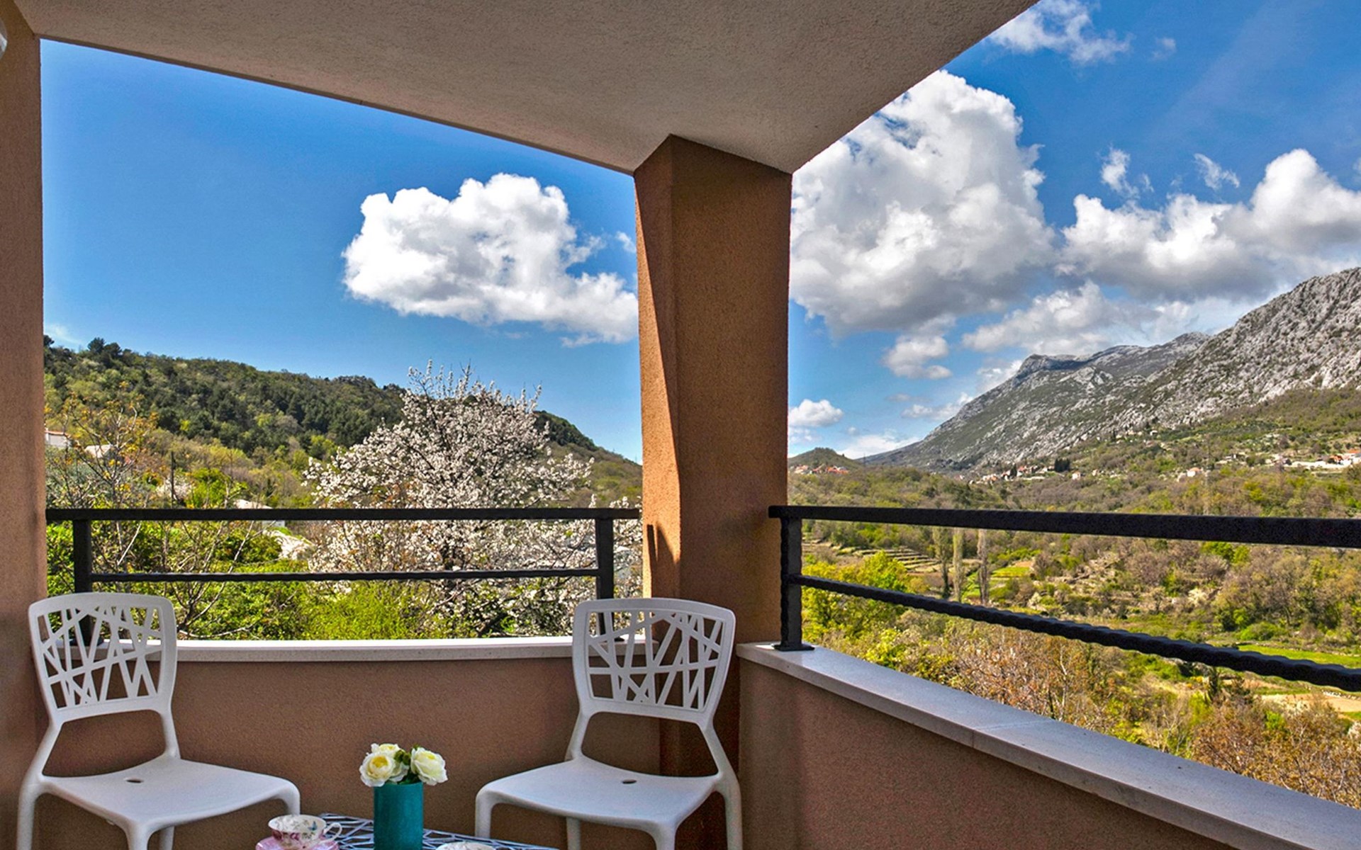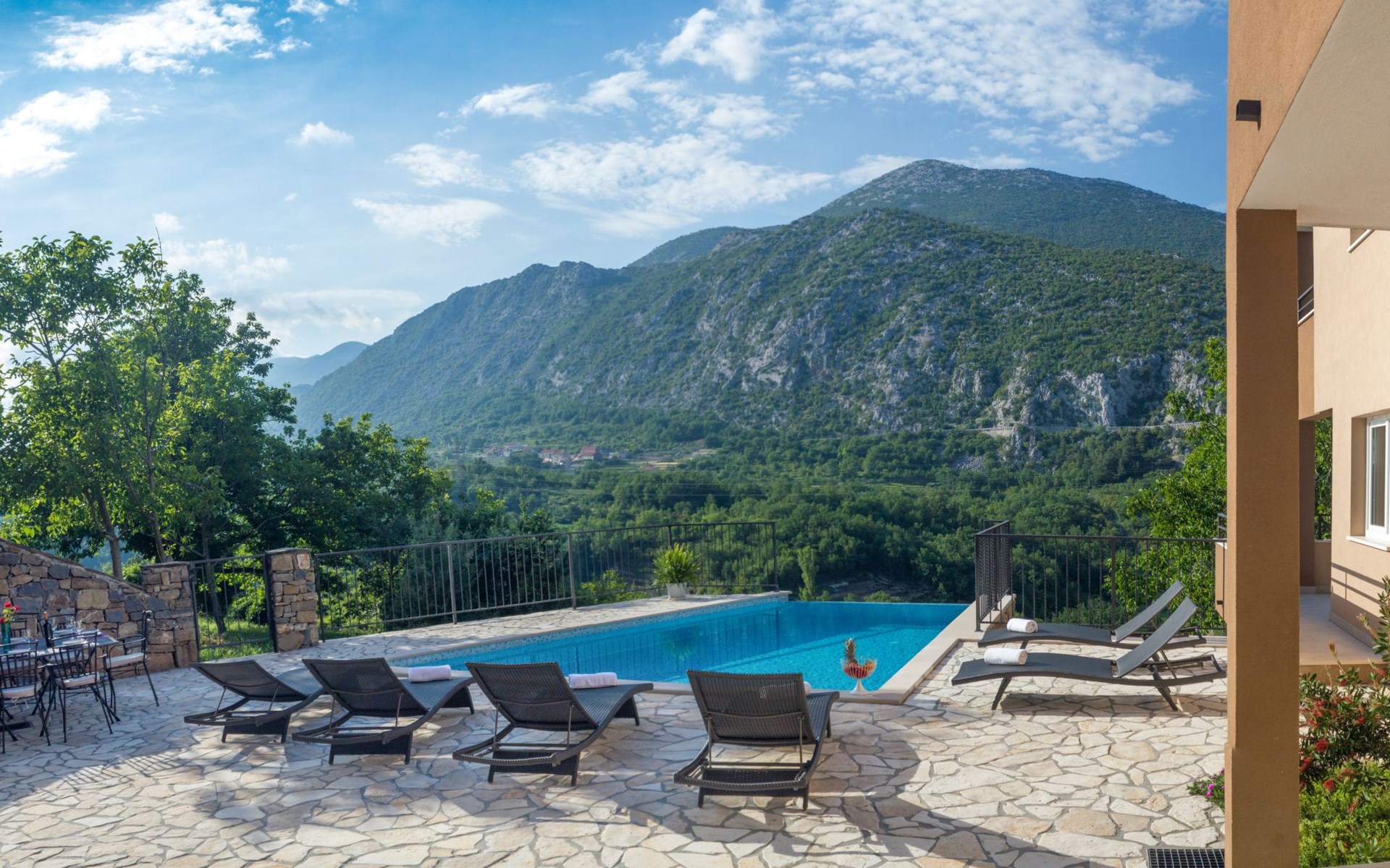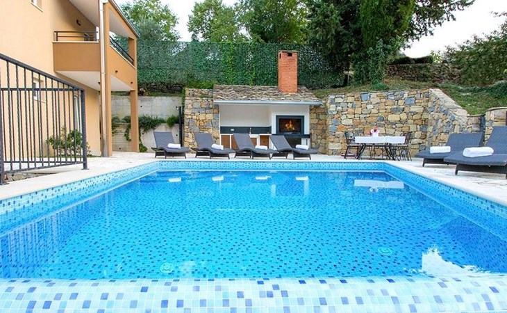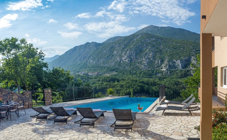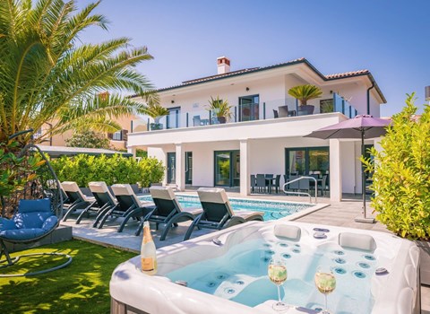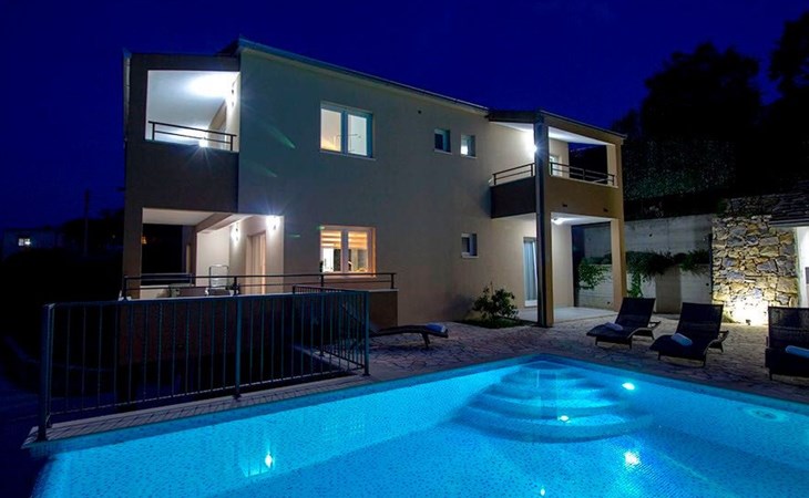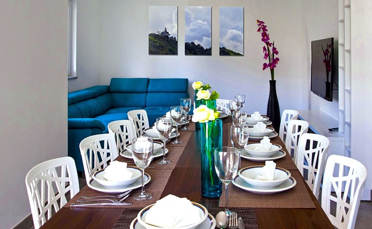 The three-storey 250m² holiday house was renovated recently in 2014. It is fully air-conditioned and can accommodate ten people. Wireless Internet access is available throughout the house. The hallways and stairs are wide and airy and are illuminated with modern spotlights. The chic main entrance leads to the modern first floor, with a spacious living room with a comfortable sofa and a big TV (satellite channels, DVD player), a dining table for up to twelve people and an open, modern kitchen. It is fully-equipped and looks out at the pool. New crockery and cooking utensils are provides, as well as a dishwasher and a big fridge. The blue sofa sets a cheerful colour accent in the otherwise white décor in a Scandinavian style. On this floor there are also two bedrooms with double beds, with luxurious bathrooms with washbasins with a cupboard underneath and a bath. One bathroom also has a washing machine. Each room has generous cupboard space and comfortable beds. You can enjoy a wonderful view from the rooms of the main garden and the pool, the garden at a higher level and the Mosor mountains and surrounding landscape with a stream and trees. All the rooms have quality furnishing. The bathrooms also have quality fittings and Italian tiles. The second floor comprises two further bedrooms, with a double bed and two single beds and an en-suite bathroom. The single beds can also be joined together as a double bed. There are two additional beds in a guest bedroom that also has space for a junior bed. The separate wellness area with under-floor heating on the second floor boasts a whirlpool for four people and a separate shower, bath and deckchairs. This luxurious bonus makes the house attractive even outside of the summer season. You can enjoy the view of the Mosor mountains whilst relaxing in the whirlpool. The ground floor has not only a secure garage, but also a cellar and a games room with a table tennis table.