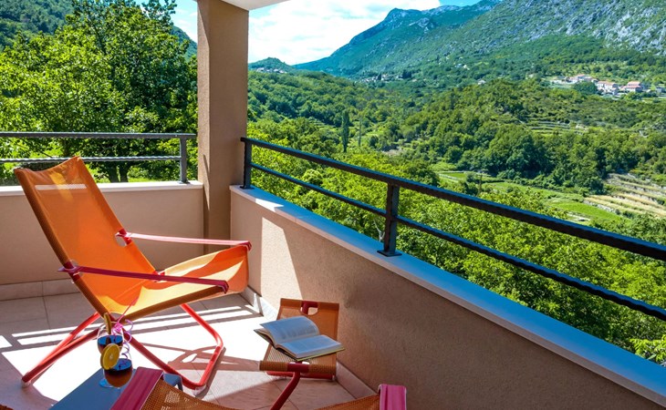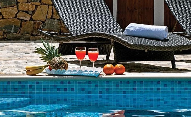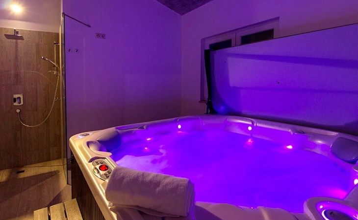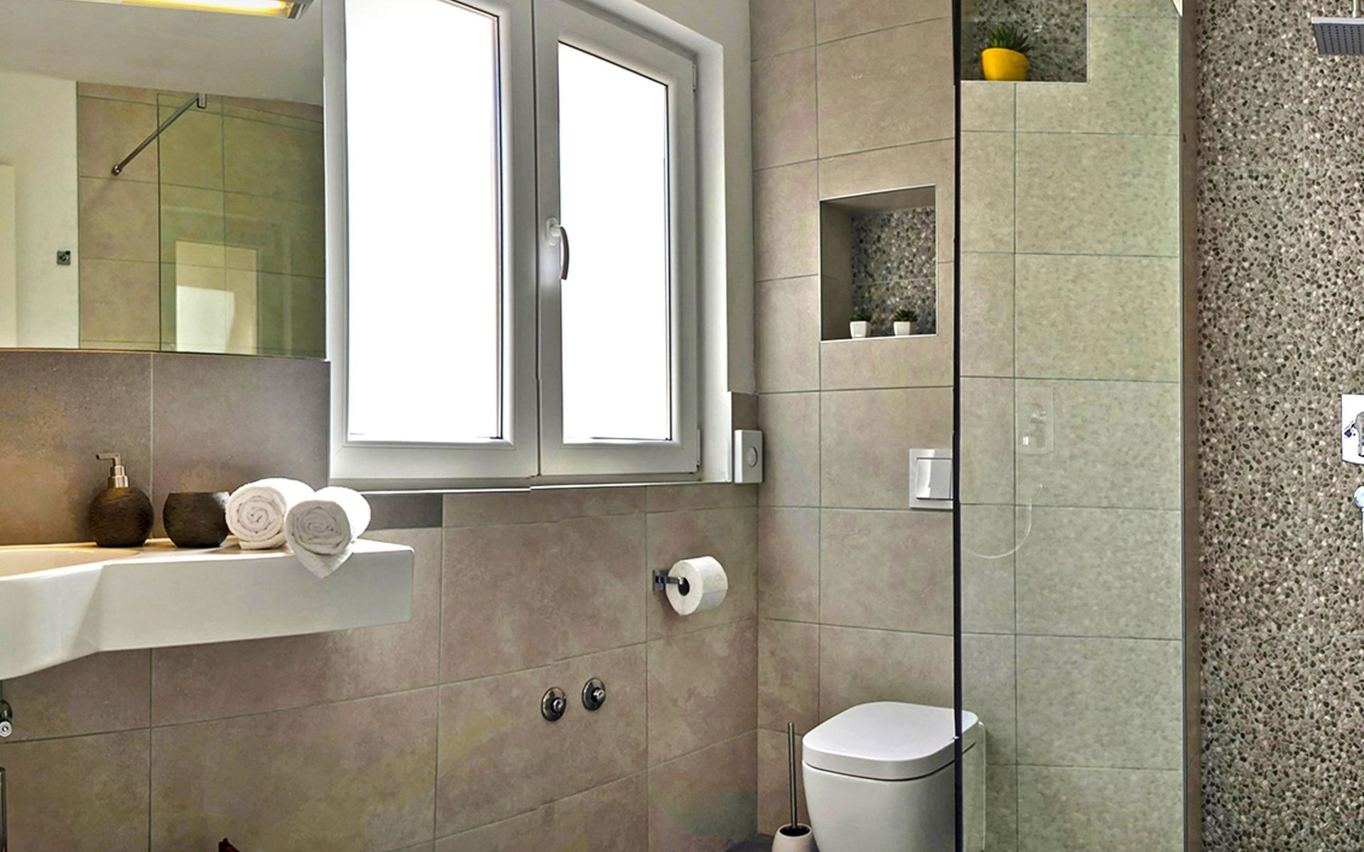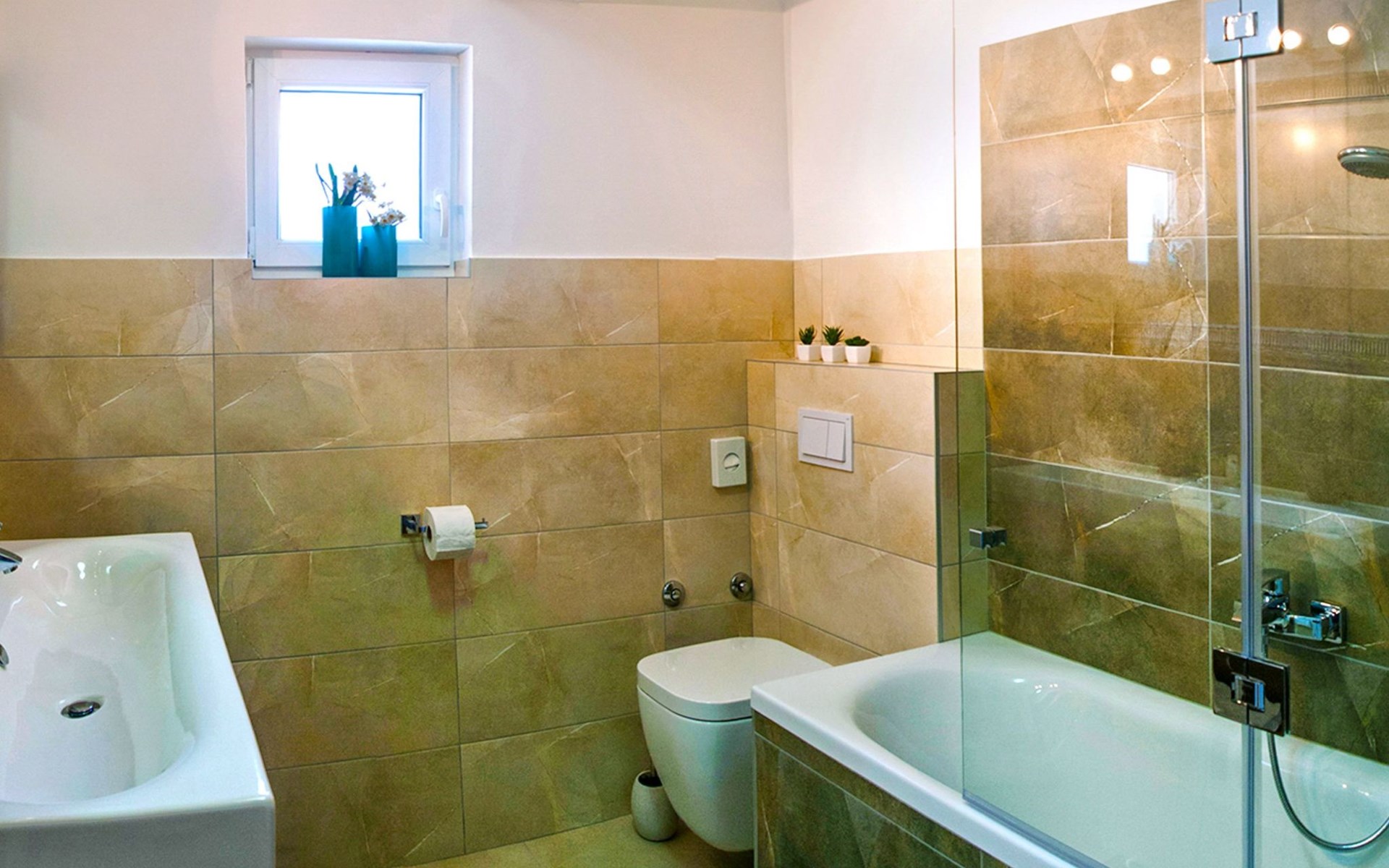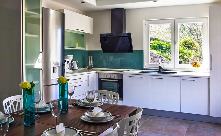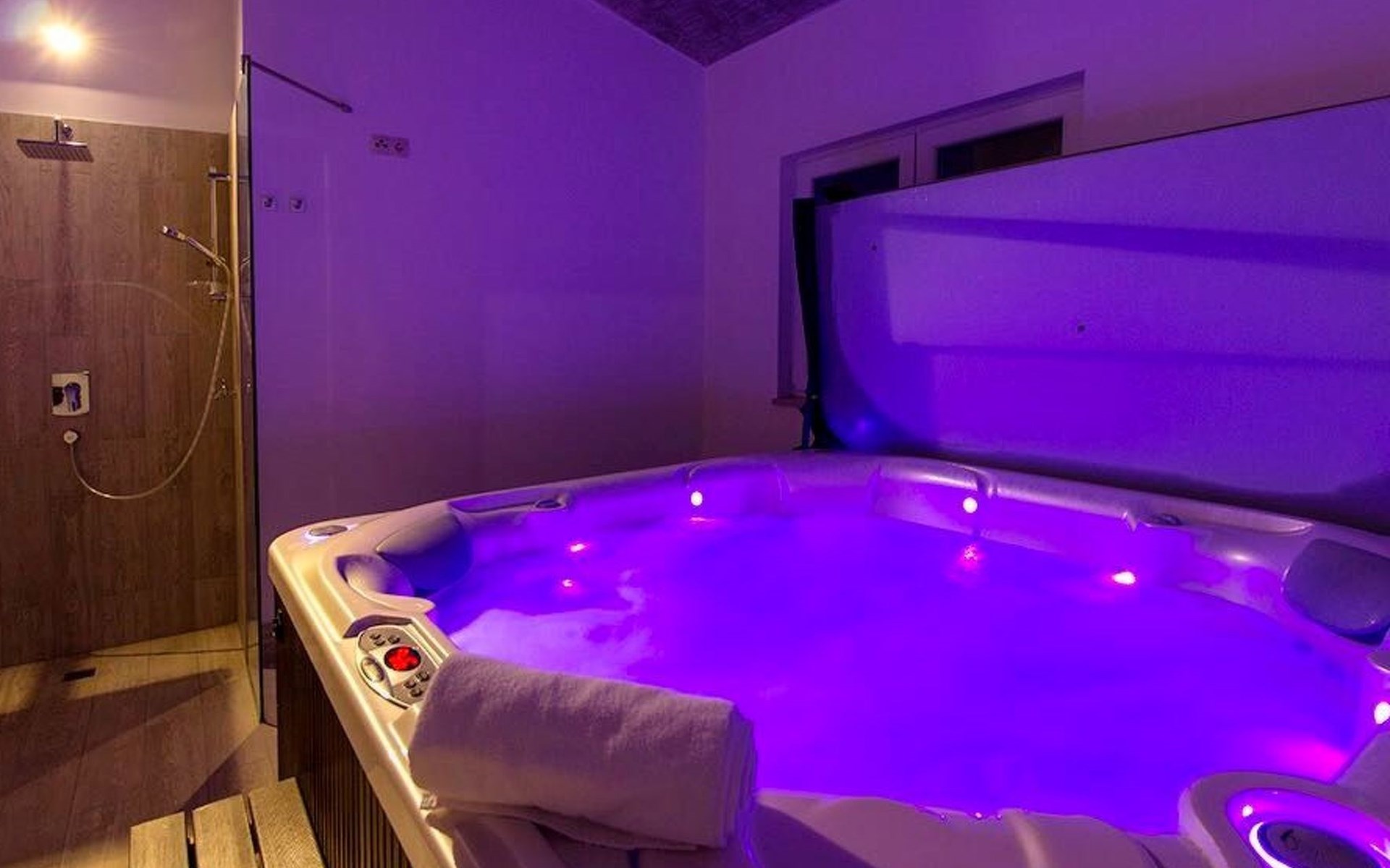 The three-storey 250m² holiday house was renovated recently in 2014. It is fully air-conditioned and can accommodate ten people. Wireless Internet access is available throughout the house. The hallways and stairs are wide and airy and are illuminated with modern spotlights. The chic main entrance leads to the modern first floor, with a spacious living room with a comfortable sofa and a big TV (satellite channels, DVD player), a dining table for up to twelve people and an open, modern kitchen. It is fully-equipped and looks out at the pool. New crockery and cooking utensils are provides, as well as a dishwasher and a big fridge. The blue sofa sets a cheerful colour accent in the otherwise white décor in a Scandinavian style. On this floor there are also two bedrooms with double beds, with luxurious bathrooms with washbasins with a cupboard underneath and a bath. One bathroom also has a washing machine. Each room has generous cupboard space and comfortable beds. You can enjoy a wonderful view from the rooms of the main garden and the pool, the garden at a higher level and the Mosor mountains and surrounding landscape with a stream and trees. All the rooms have quality furnishing. The bathrooms also have quality fittings and Italian tiles. The second floor comprises two further bedrooms, with a double bed and two single beds and an en-suite bathroom. The single beds can also be joined together as a double bed. There are two additional beds in a guest bedroom that also has space for a junior bed. The separate wellness area with under-floor heating on the second floor boasts a whirlpool for four people and a separate shower, bath and deckchairs. This luxurious bonus makes the house attractive even outside of the summer season. You can enjoy the view of the Mosor mountains whilst relaxing in the whirlpool. The ground floor has not only a secure garage, but also a cellar and a games room with a table tennis table.