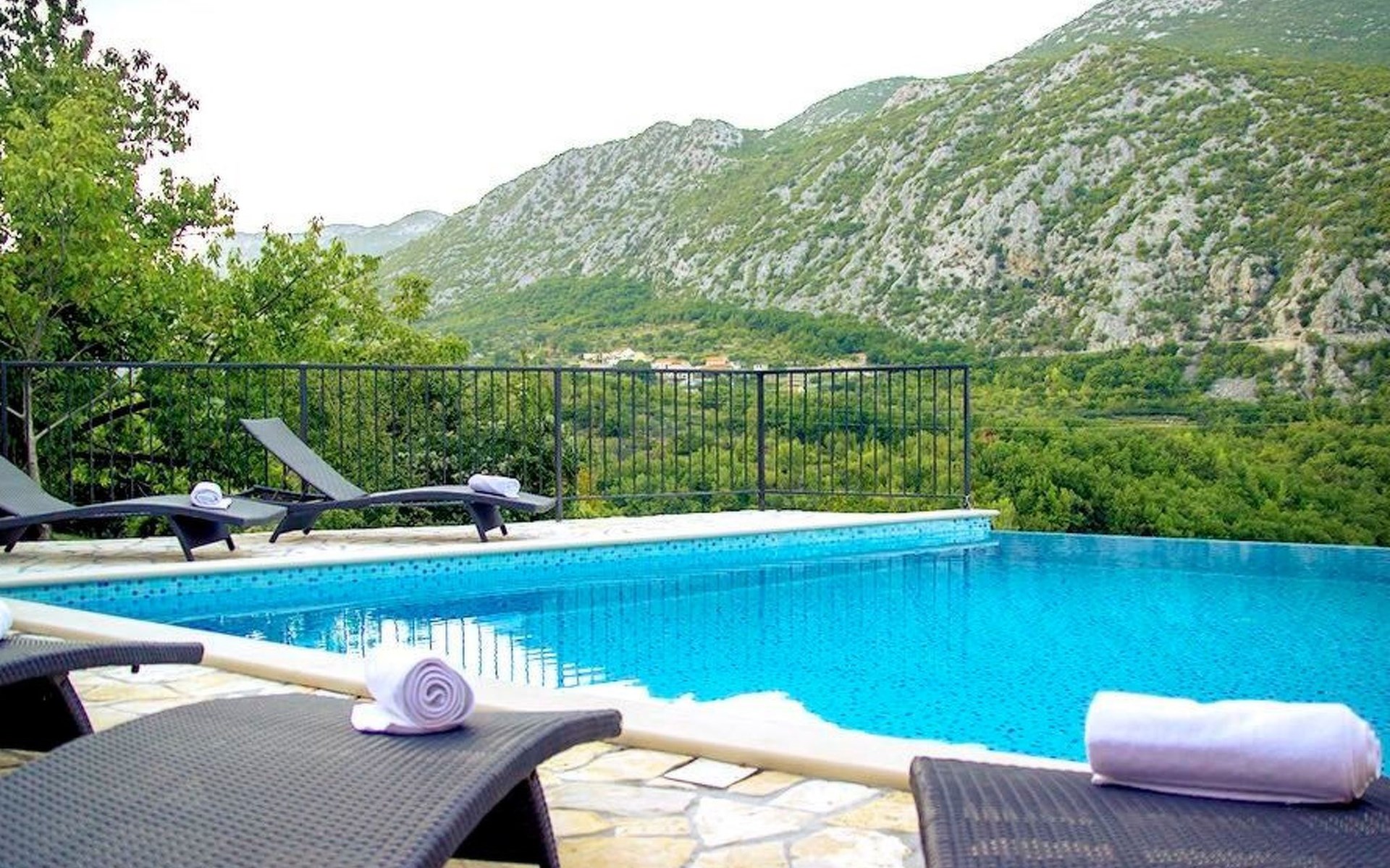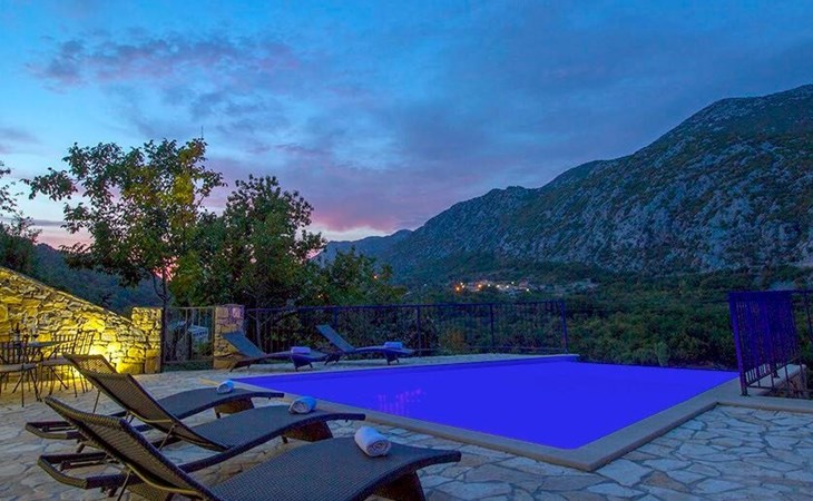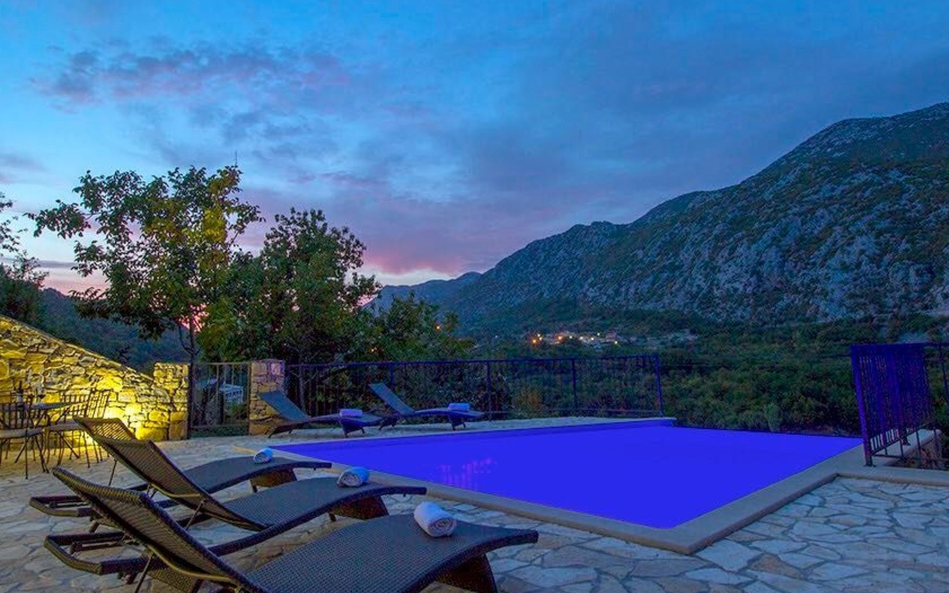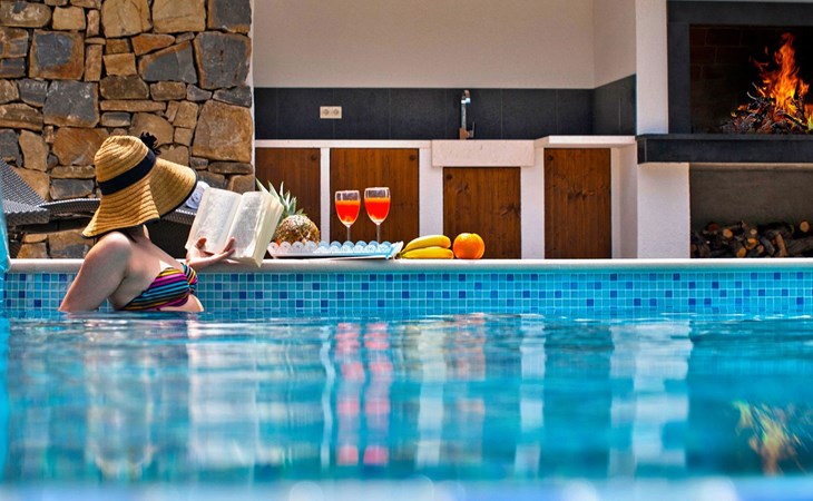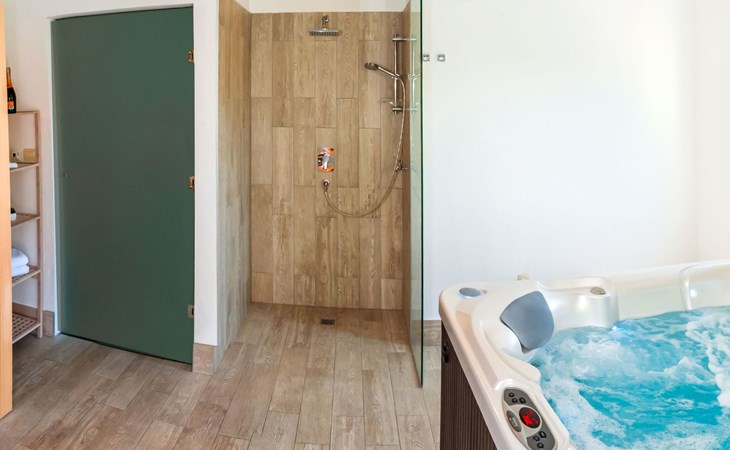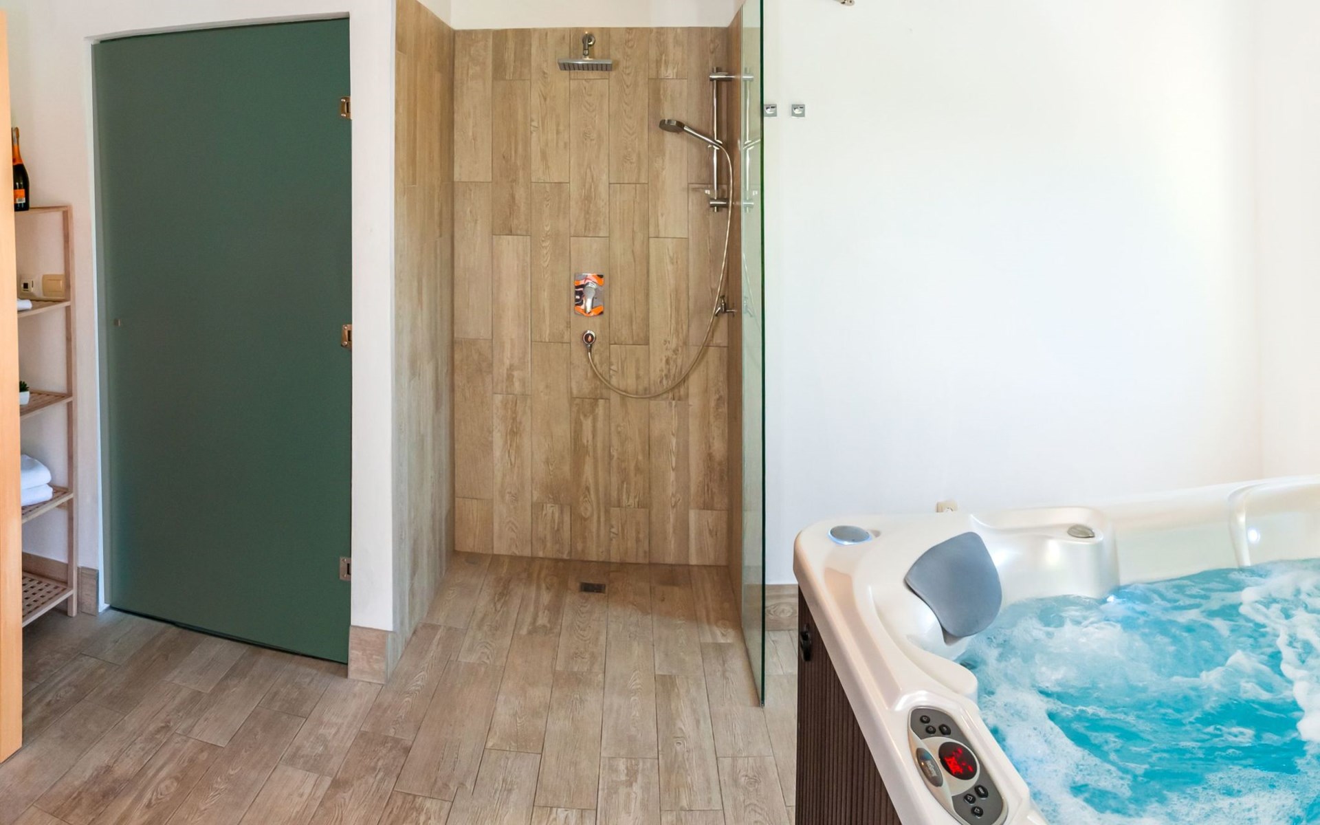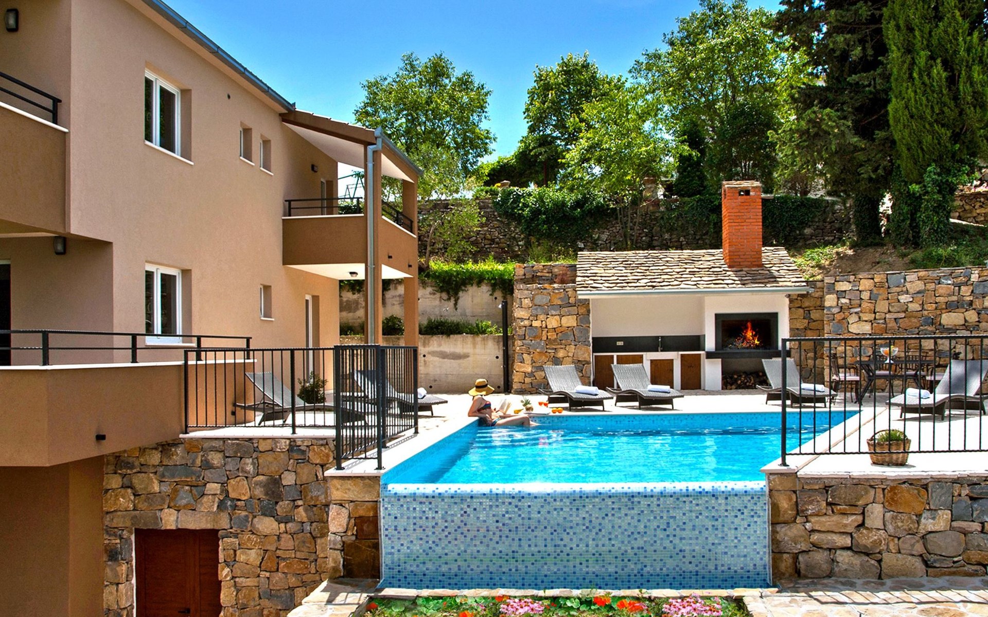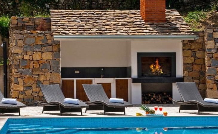 Every floor has two big balconies with an endless view. The wicker armchairs in the side balcony area provide a shady little place to relax. The great 30m² Infinity pool is surrounded by a 680m² plot of land. There are six deckchairs and an outdoor seating area with a grill and a fully-equipped outdoor kitchen on the 100m² pool terrace. The traditional stone architecture outside is warm and has an appealing design, complementing the modern architecture of the house. You can sunbathe on the comfortable loungers, have a nap on the roofed balcony and enjoy evenings with a view of the illuminated pool.