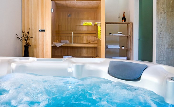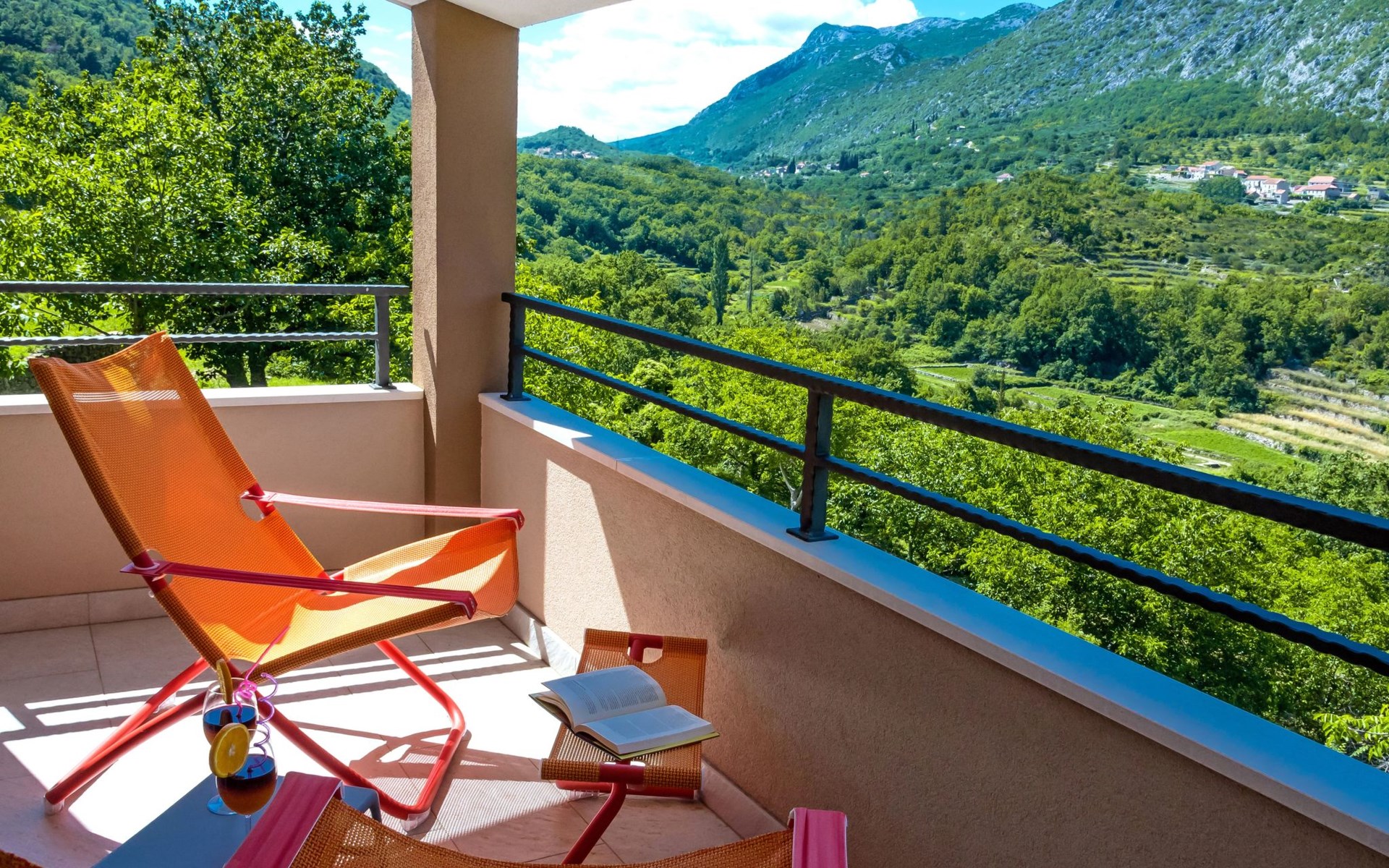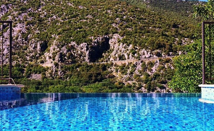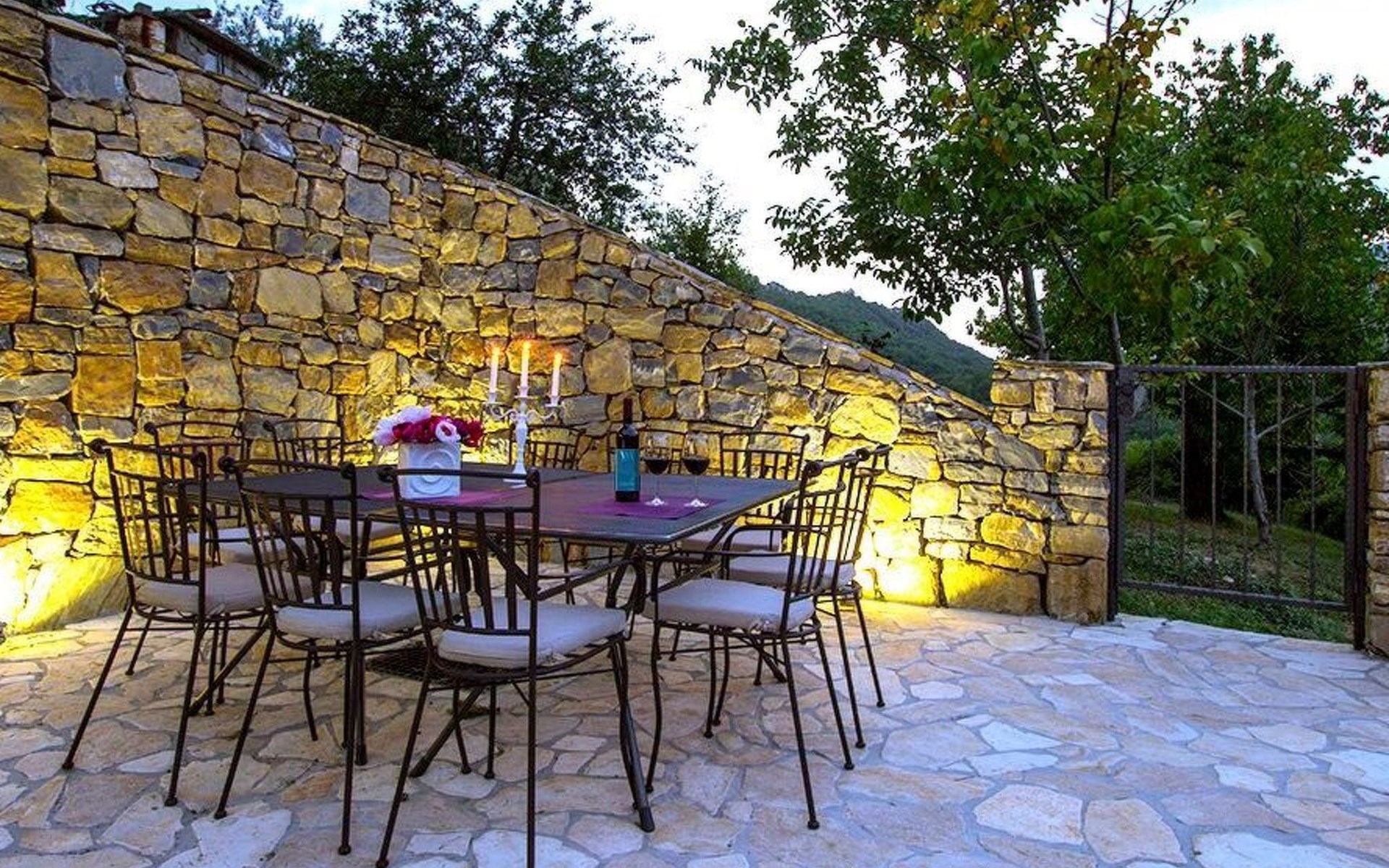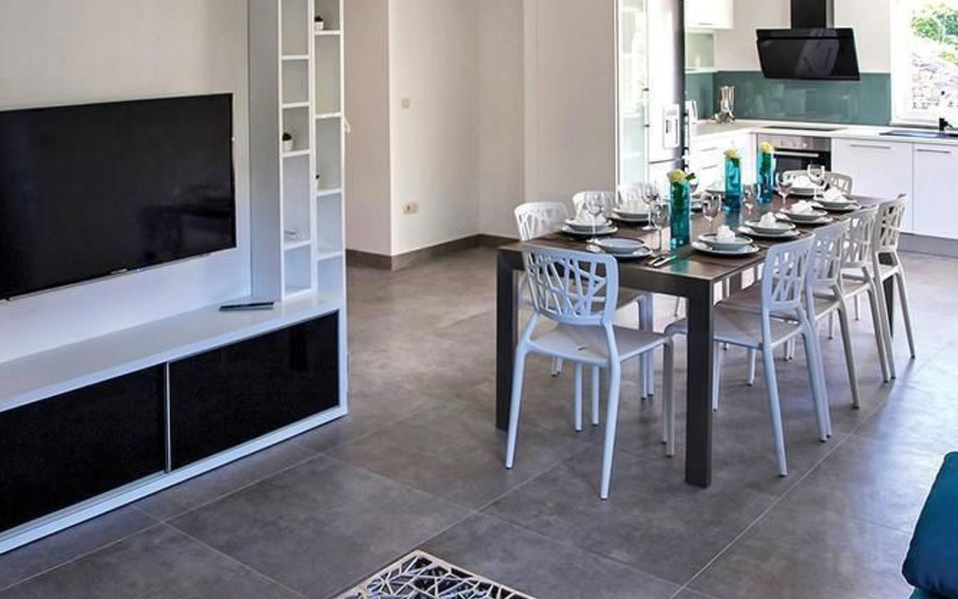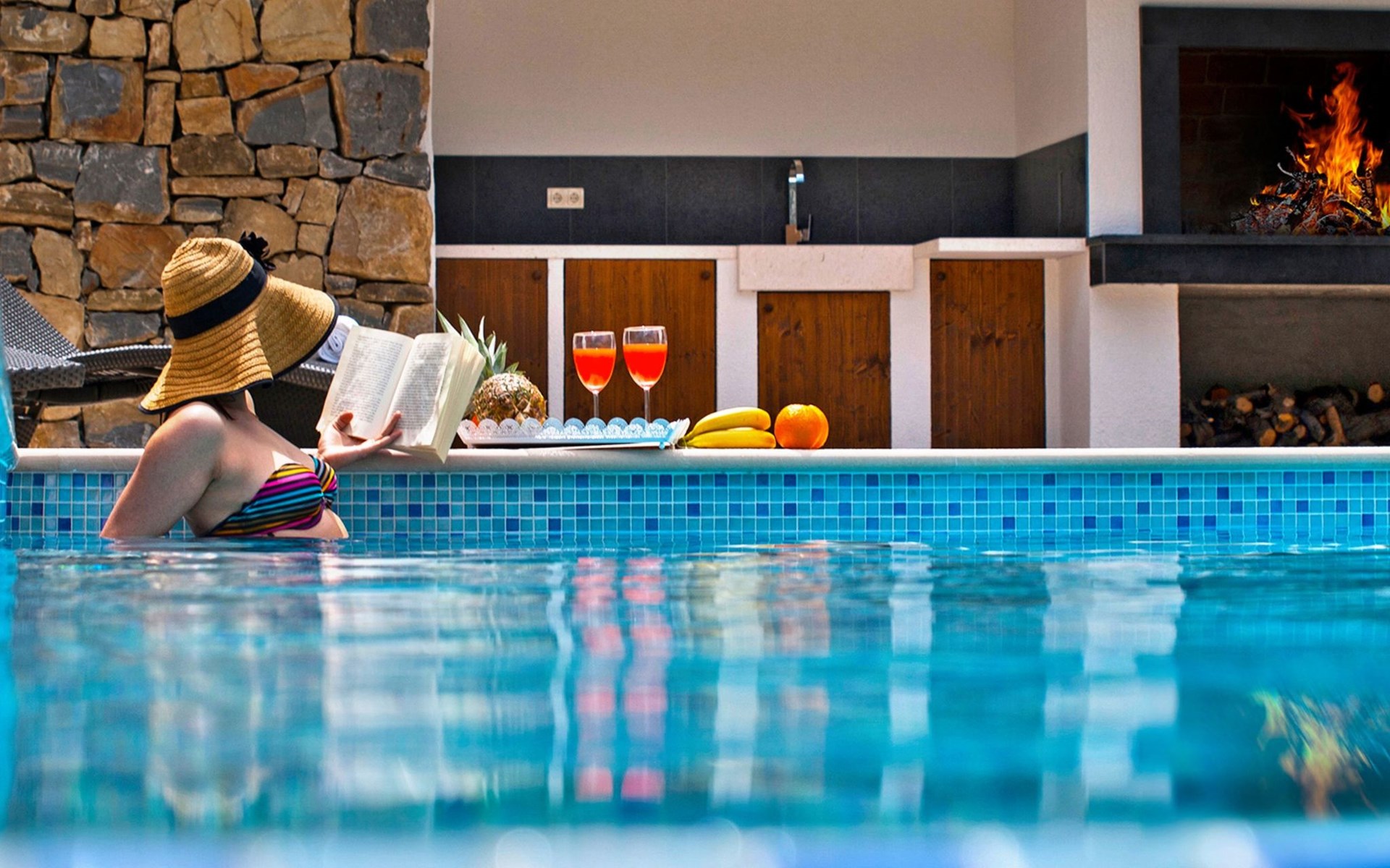 Every floor has two big balconies with an endless view. The wicker armchairs in the side balcony area provide a shady little place to relax. The great 30m² Infinity pool is surrounded by a 680m² plot of land. There are six deckchairs and an outdoor seating area with a grill and a fully-equipped outdoor kitchen on the 100m² pool terrace. The traditional stone architecture outside is warm and has an appealing design, complementing the modern architecture of the house. You can sunbathe on the comfortable loungers, have a nap on the roofed balcony and enjoy evenings with a view of the illuminated pool.