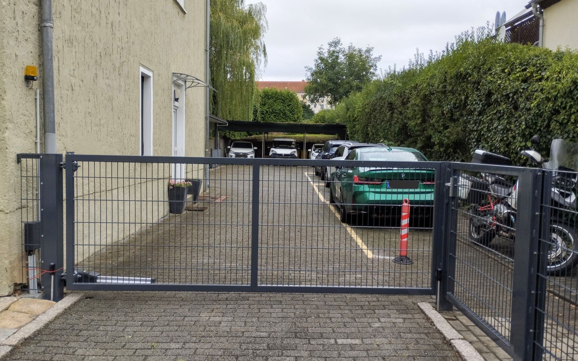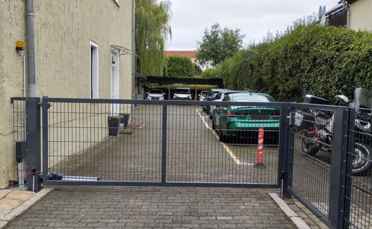 The outdoor area of our flat surprises with a covered terrace in the courtyard. This is the perfect place to relax with a coffee break or an after-work beer while enjoying the view of the company car. There is also good news for cycling enthusiasts: your own bikes are welcome and can be stored in a covered bike rack. Please note that charging e-bikes or electric vehicles via the flat's electricity supply is not permitted for safety reasons.