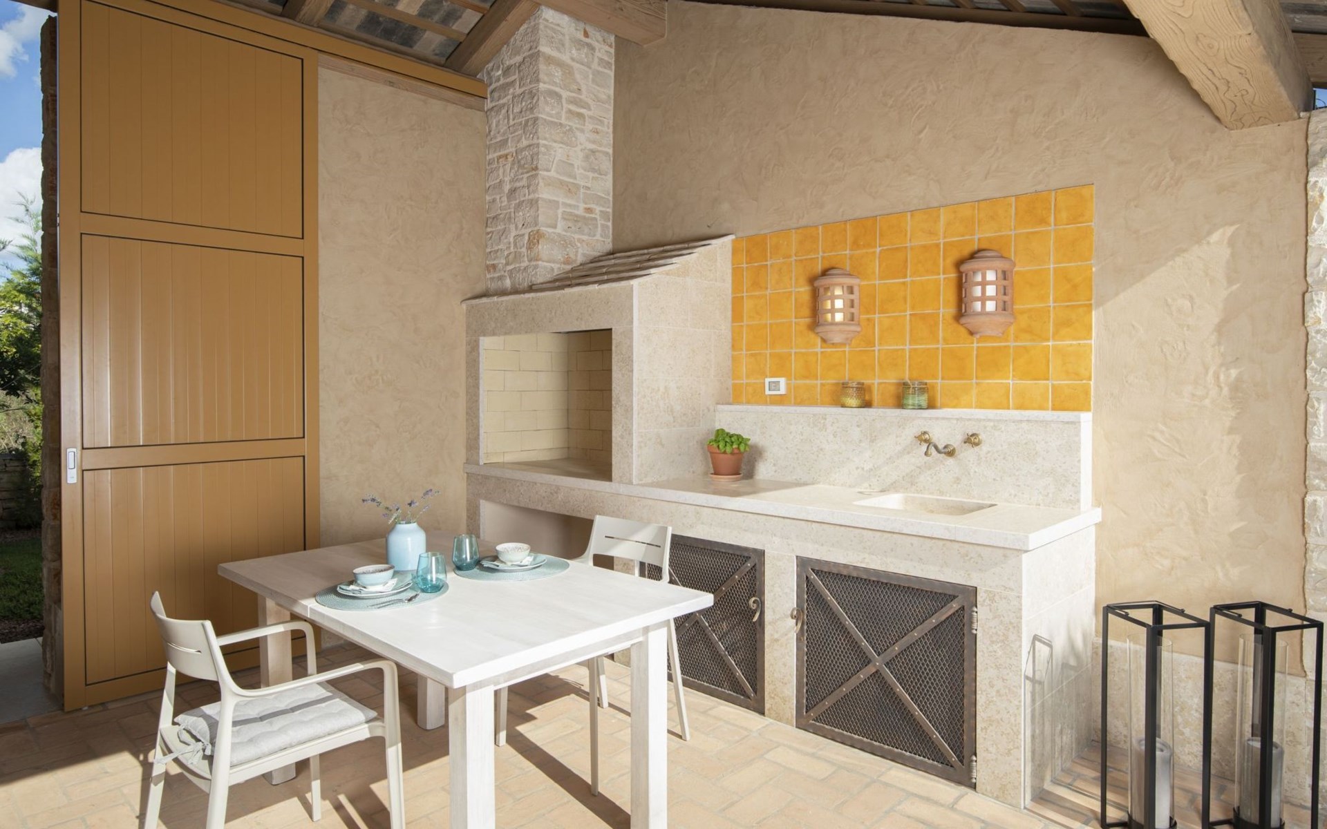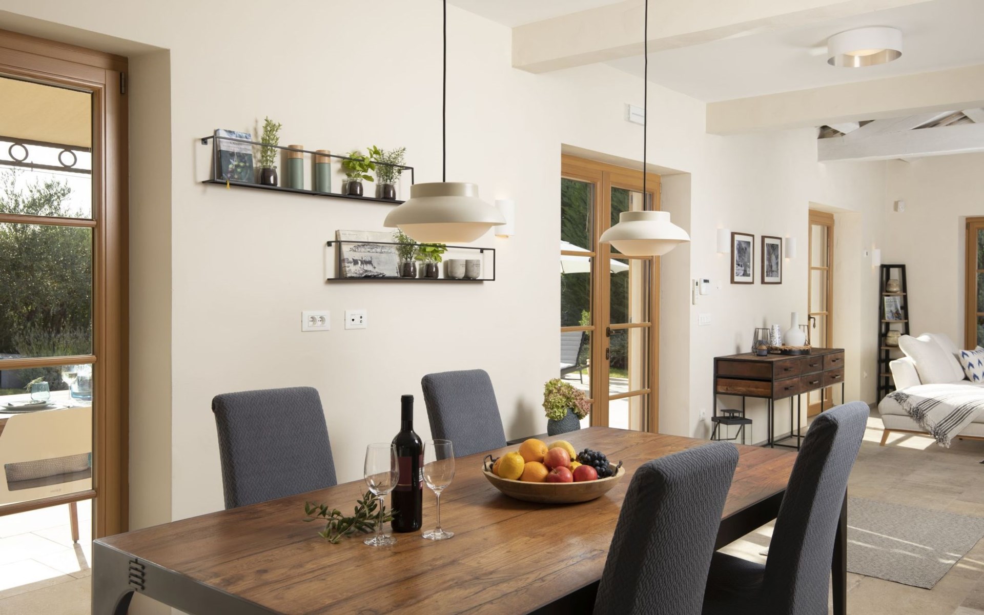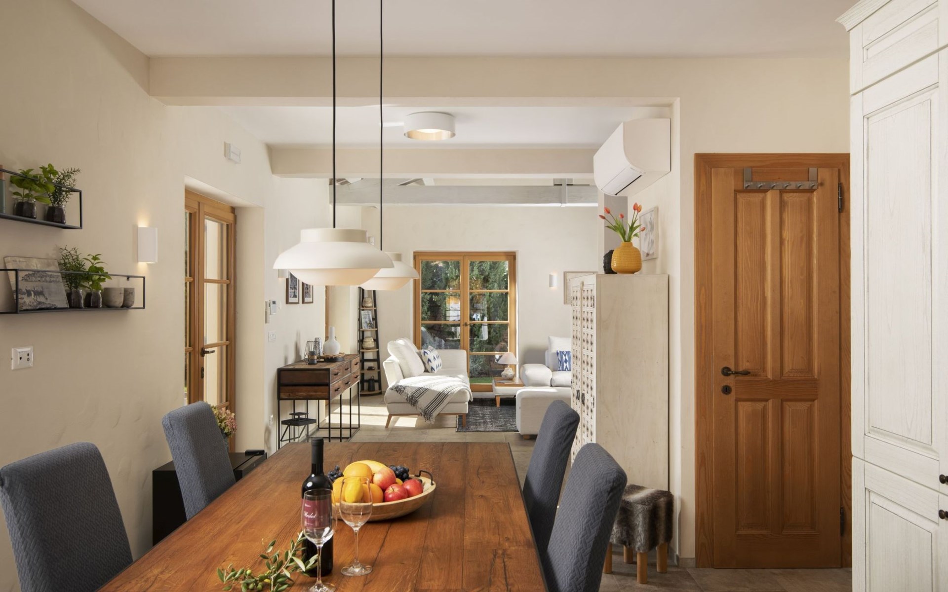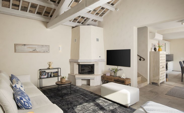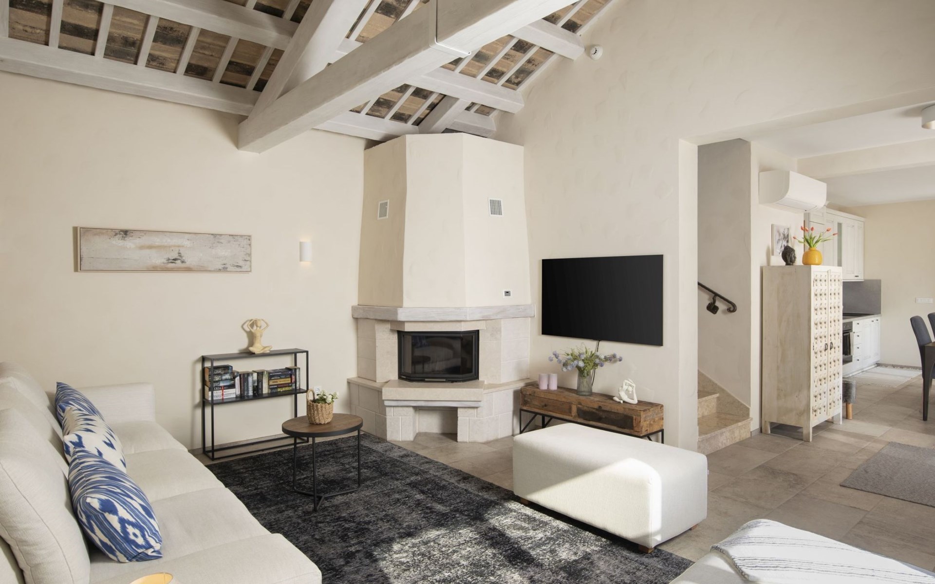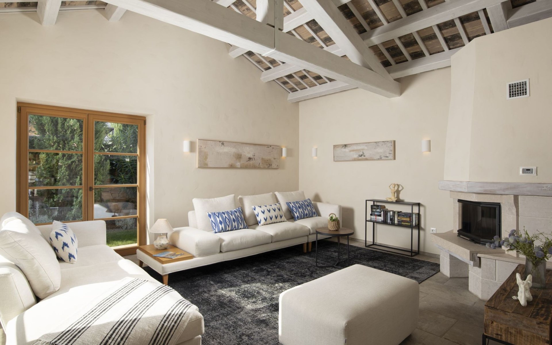 Inside the villa, guests will find all the modern amenities needed for a comfortable stay. A cozy indoor fireplace, three air conditioning units, and satellite TV with Netflix with streaming functions and entertainment. The fully equipped kitchen is perfect for preparing meals. The villa includes two bathrooms: one with a bathtub and shower, the other with a guest toilet.