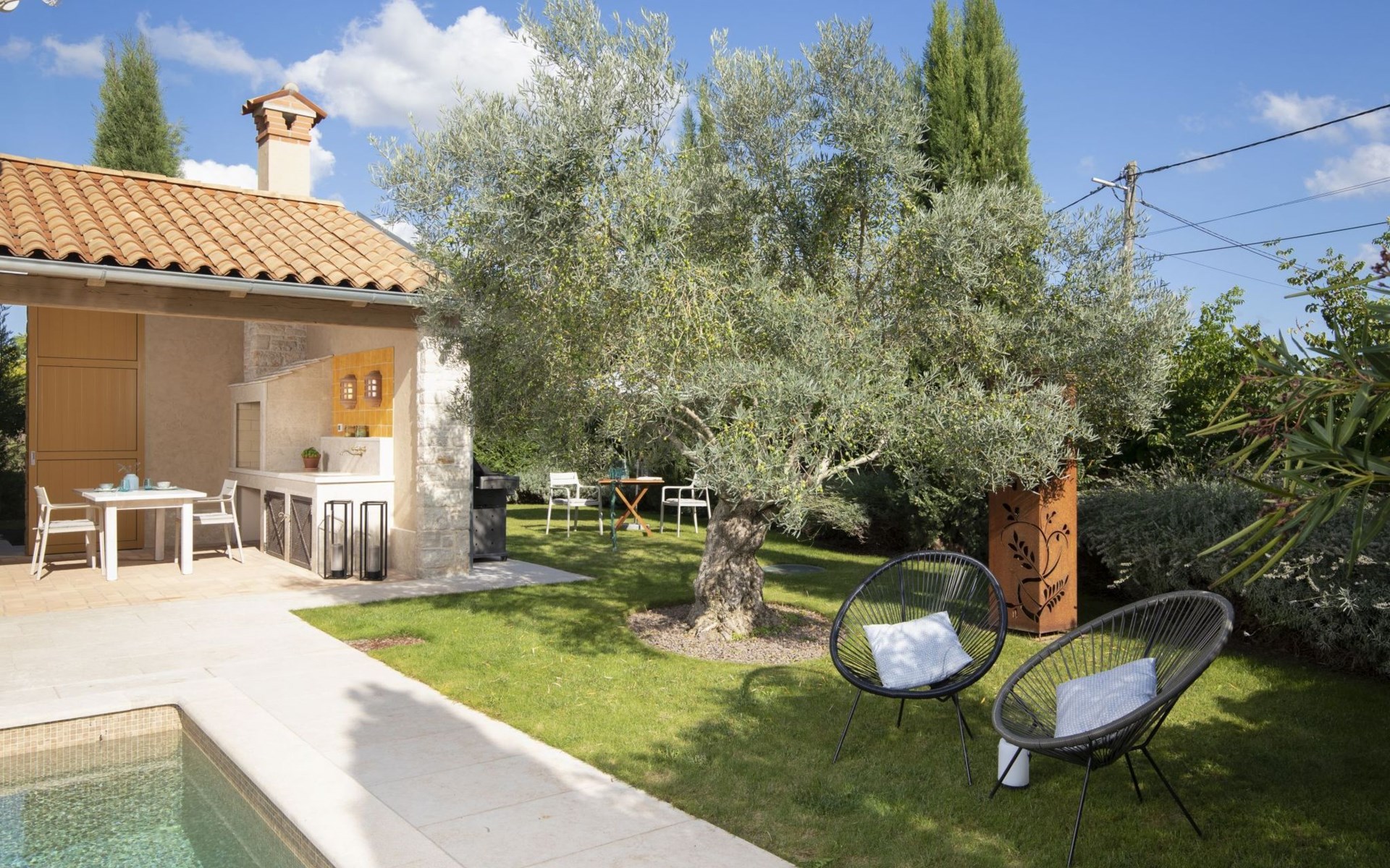 Surrounded by an immaculately maintained garden filled with lush greenery, floral arrangements, and Mediterranean plants, the villa offers a peaceful and relaxing oasis. The centerpiece of the garden is a spacious 40 m² pool, surrounded by comfortable loungers, perfect for sunny days and relaxing by the water. Next to the pool, there is an outdoor kitchen under a shaded pergola, ideal for al fresco dining.