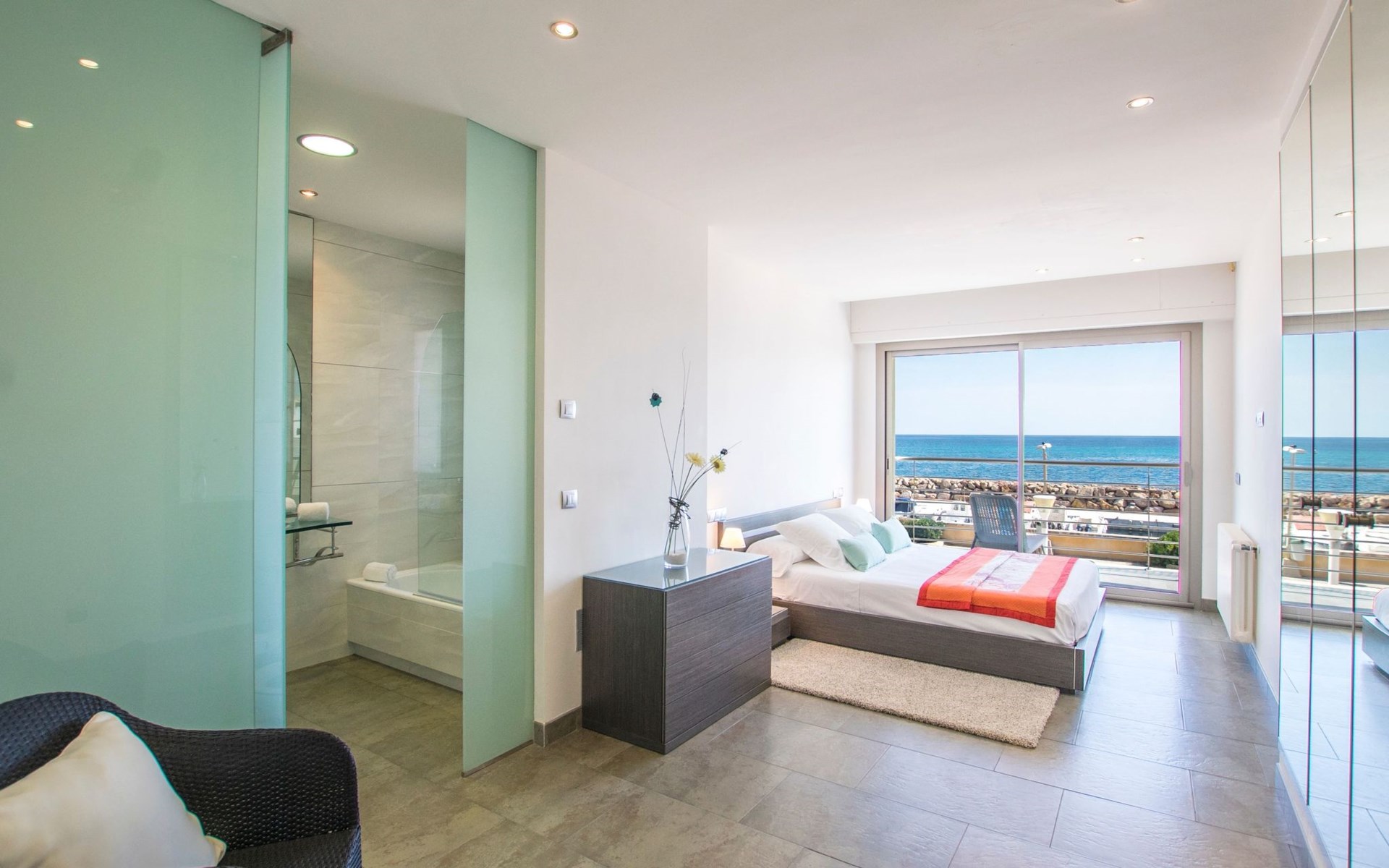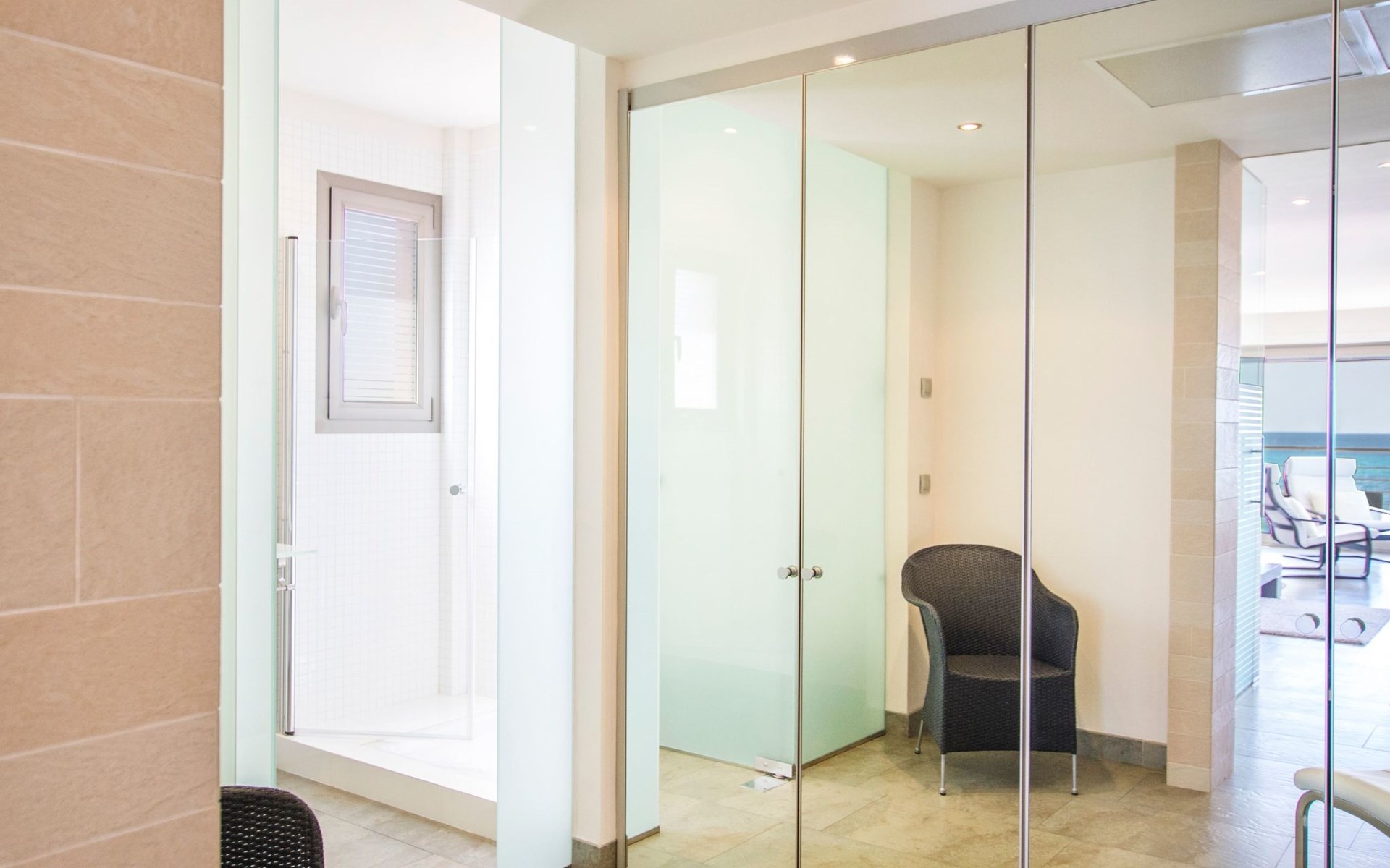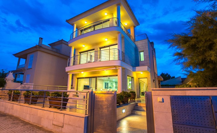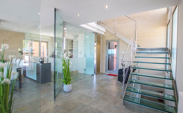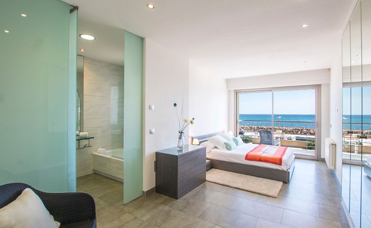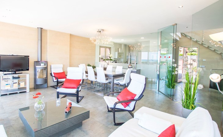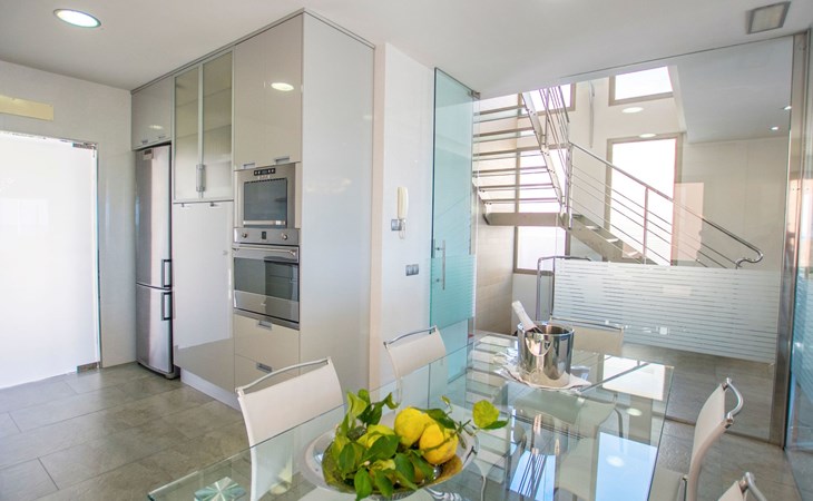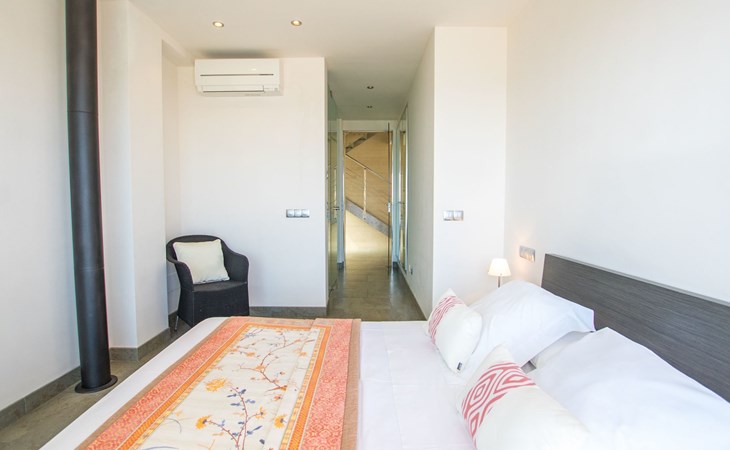 Inside, the villa is distributed over three floors carefully designed for your comfort and enjoyment. The main floor features a large terrace, a spacious living-dining room bathed in natural light through the large windows and a designer kitchen-dining room equipped with state-of-the-art appliances, from where the view of the sea will not leave you indifferent. You will also find a toilet conveniently located to facilitate your needs. The basement floor houses an impressive indoor swimming pool measuring 11 metres long by 4 metres wide, an ideal space to relax and enjoy regardless of the weather outside (not heated).