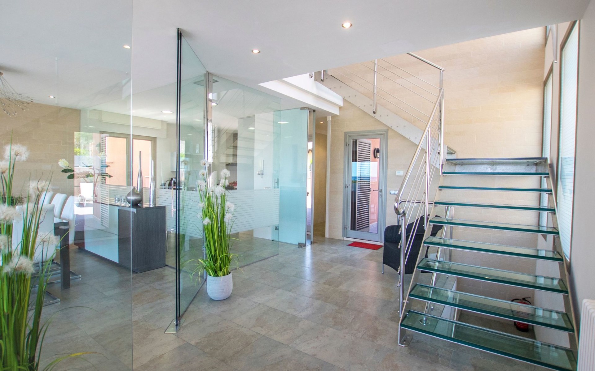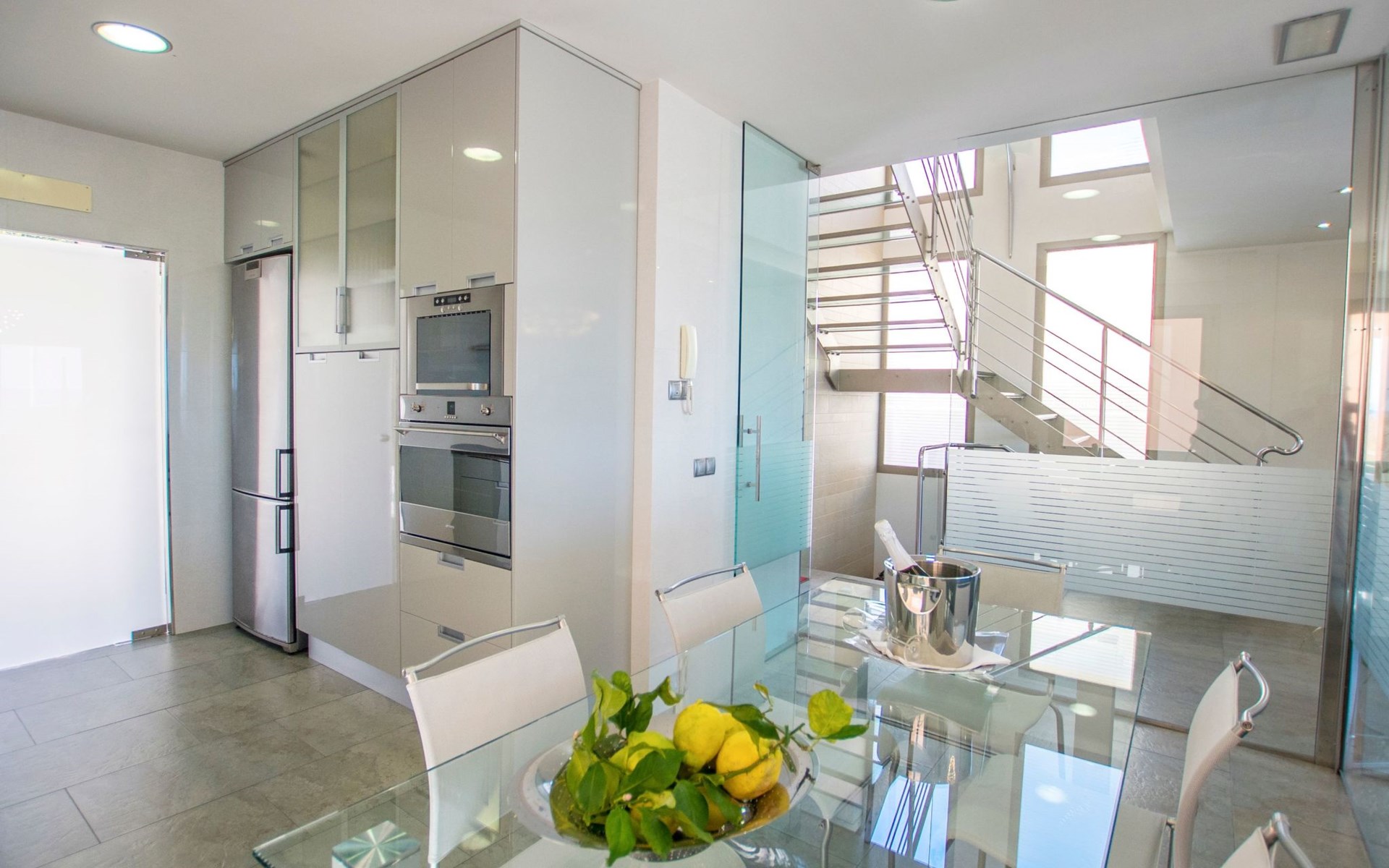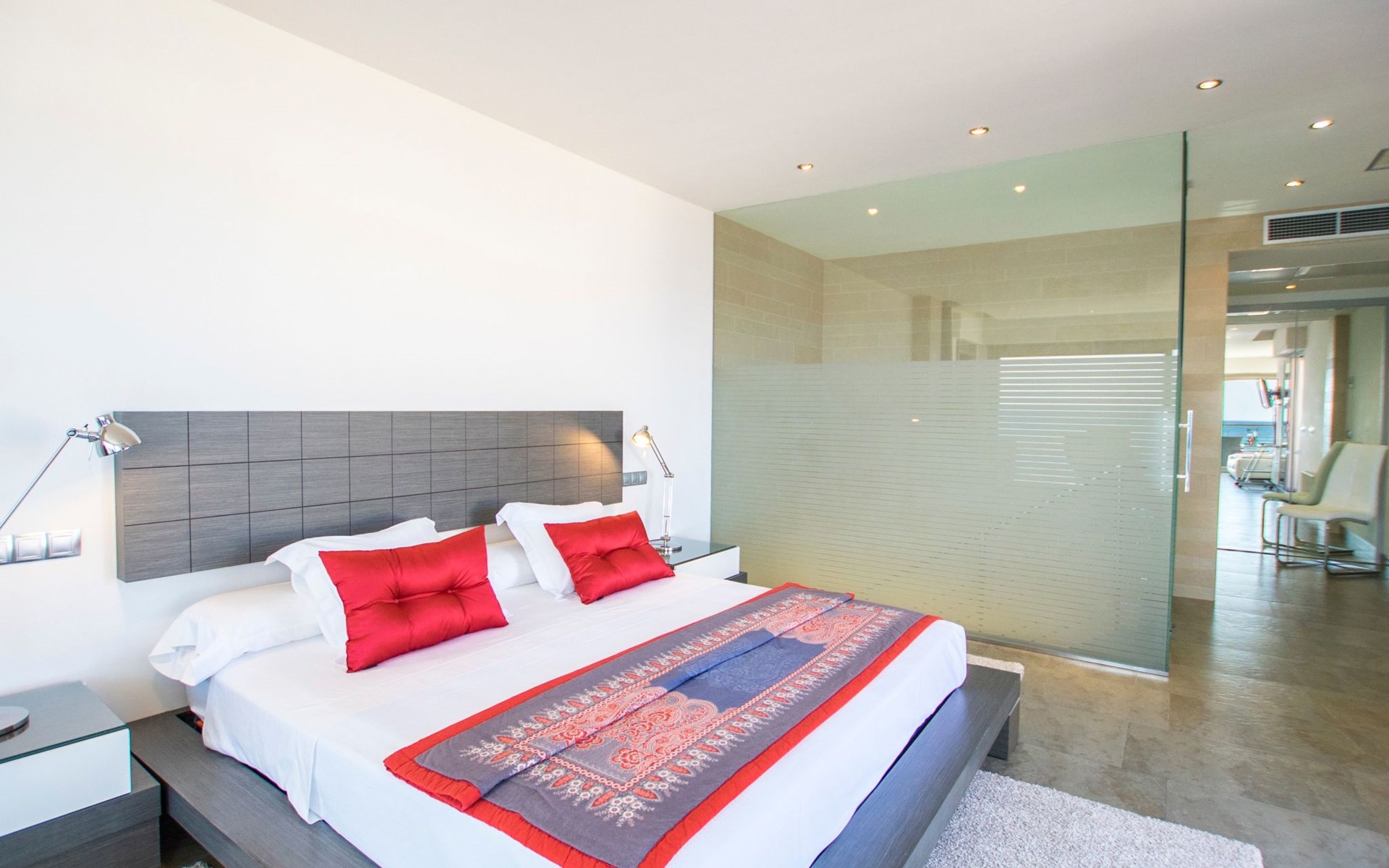 Inside, the villa is distributed over three floors carefully designed for your comfort and enjoyment. The main floor features a large terrace, a spacious living-dining room bathed in natural light through the large windows and a designer kitchen-dining room equipped with state-of-the-art appliances, from where the view of the sea will not leave you indifferent. You will also find a toilet conveniently located to facilitate your needs. The basement floor houses an impressive indoor swimming pool measuring 11 metres long by 4 metres wide, an ideal space to relax and enjoy regardless of the weather outside (not heated).
