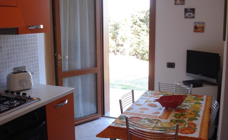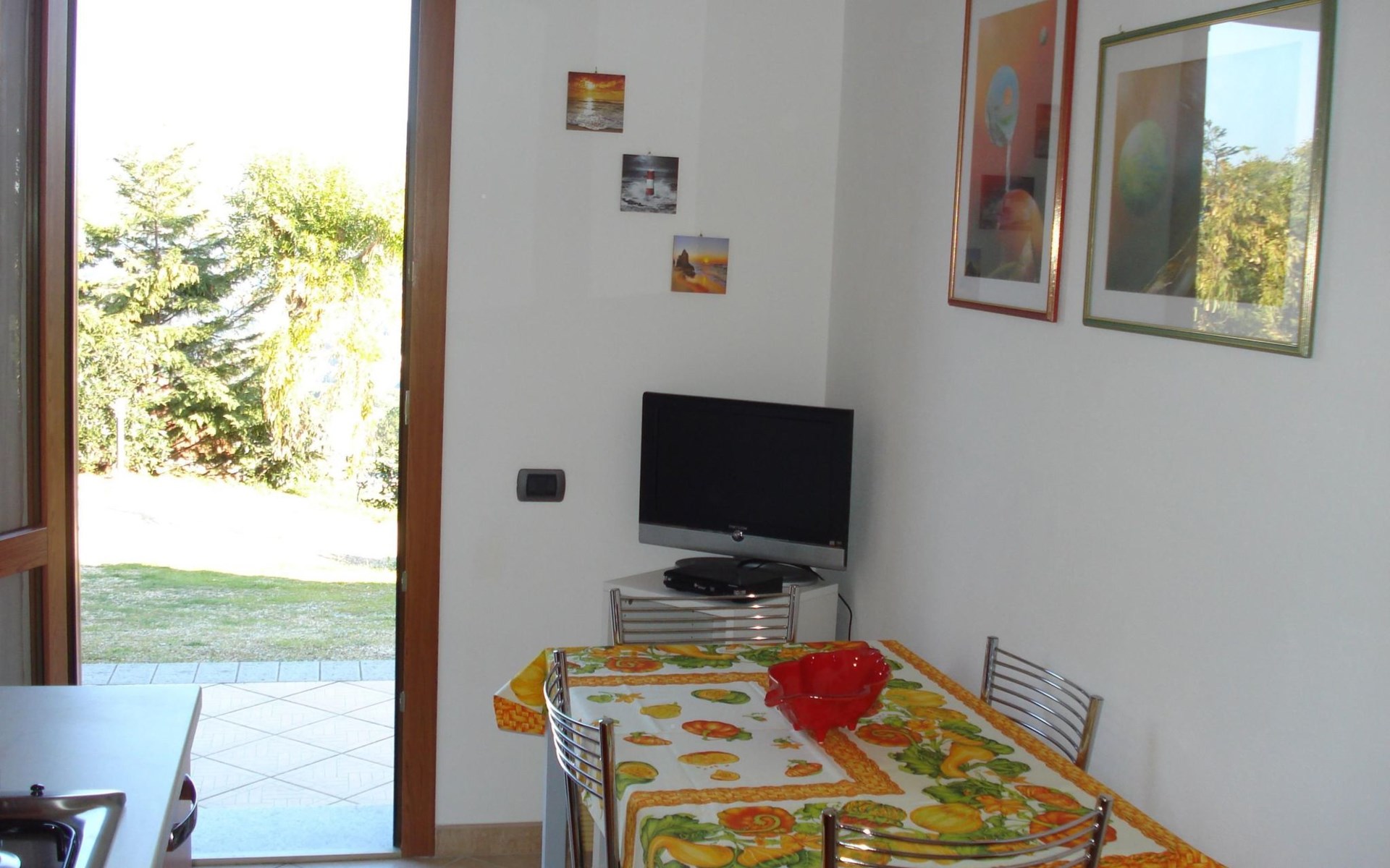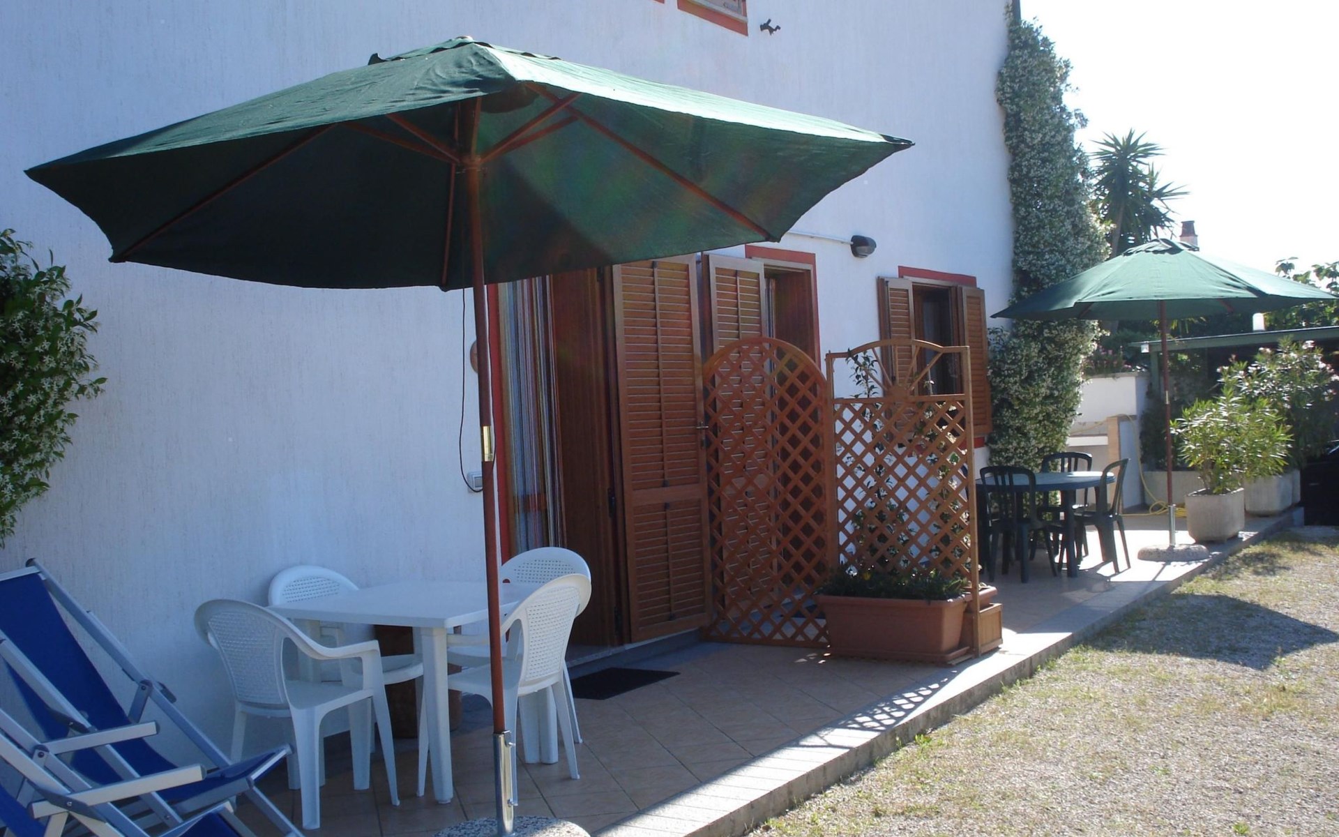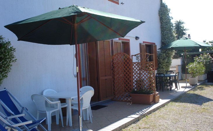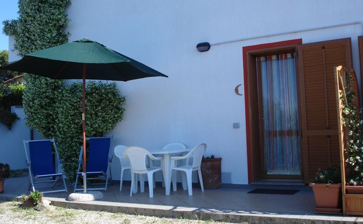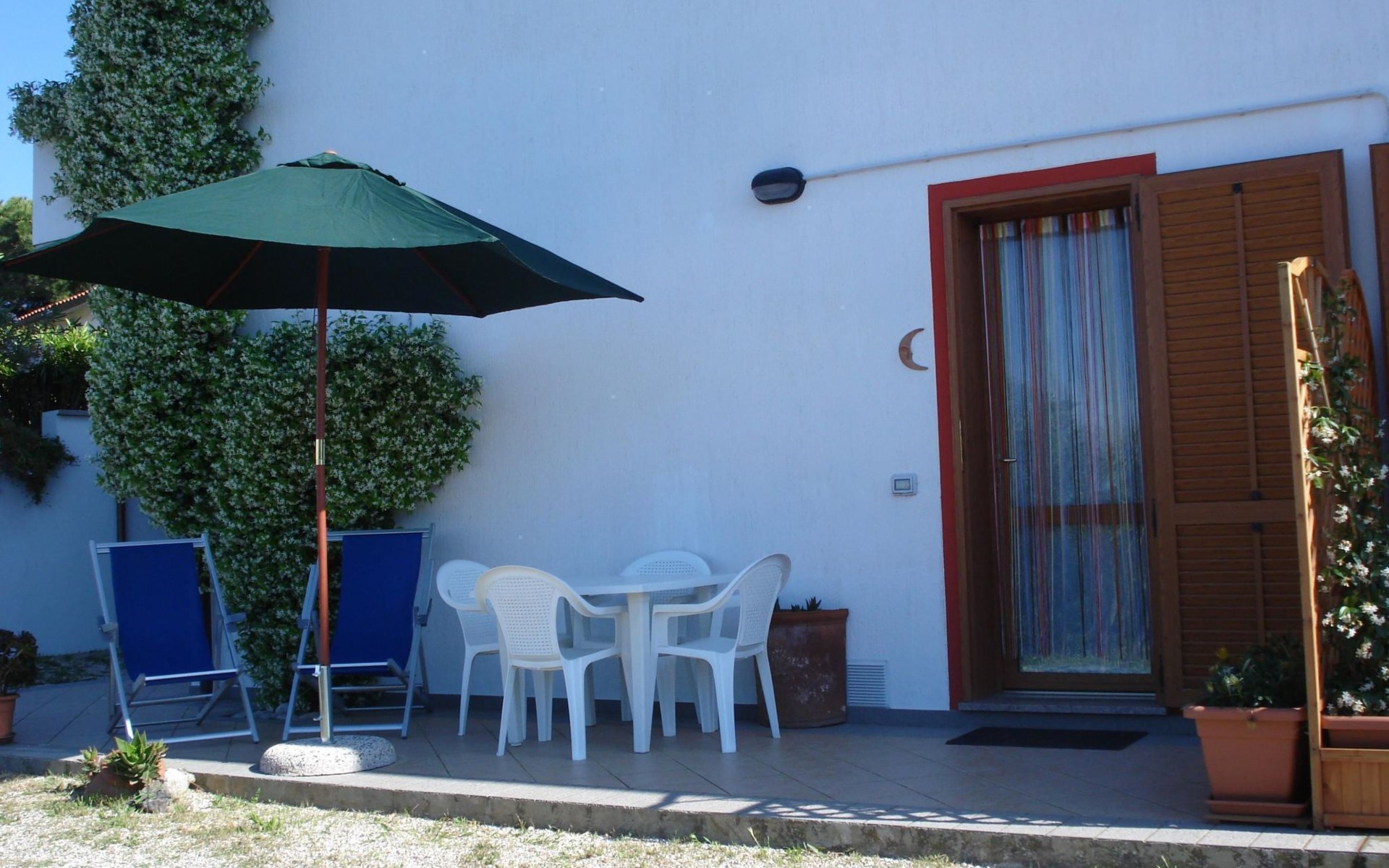 The apartment has a terrace with a table and chairs.