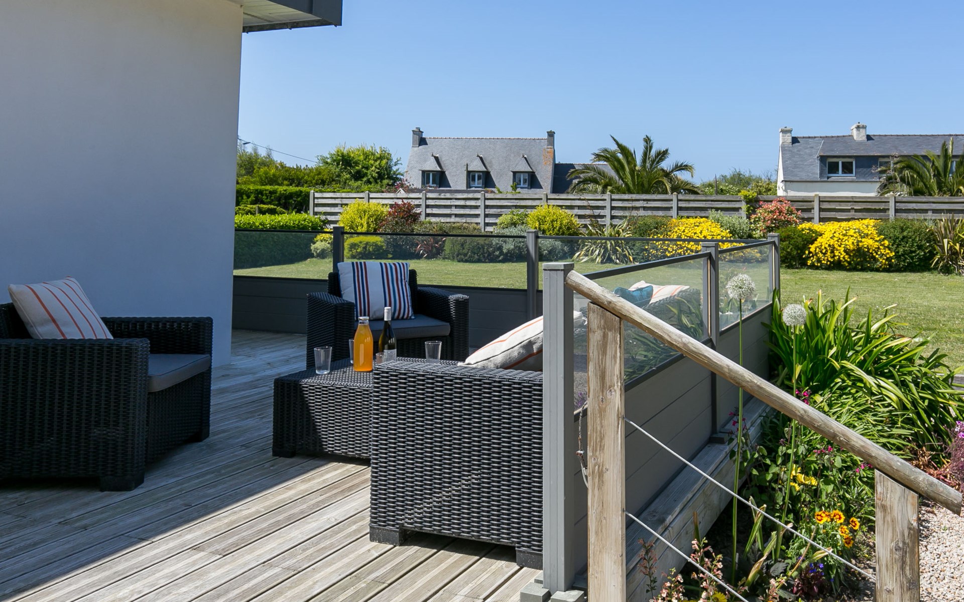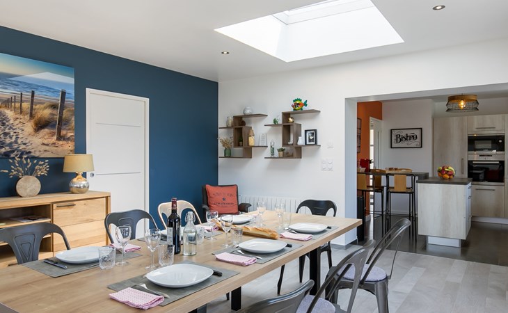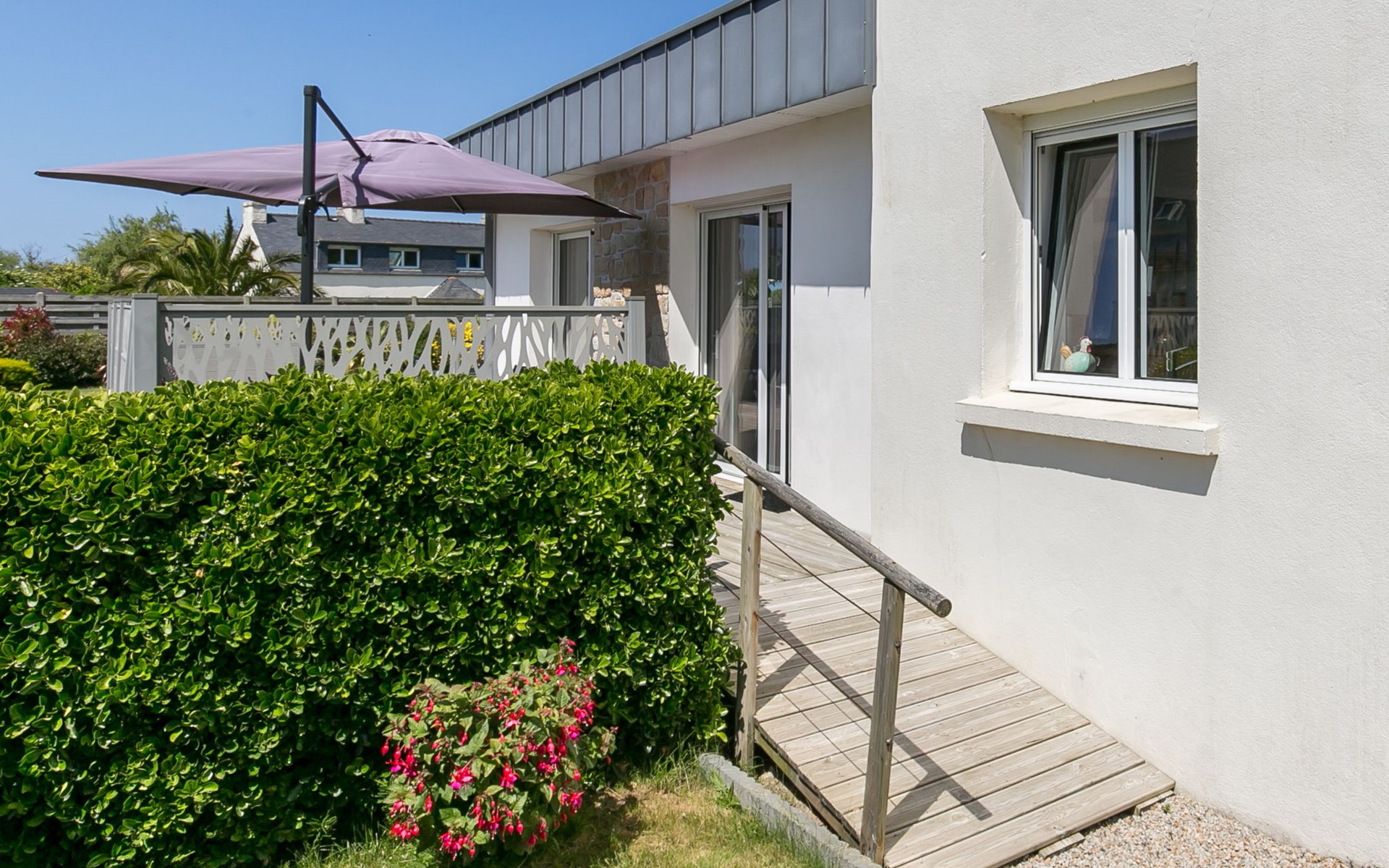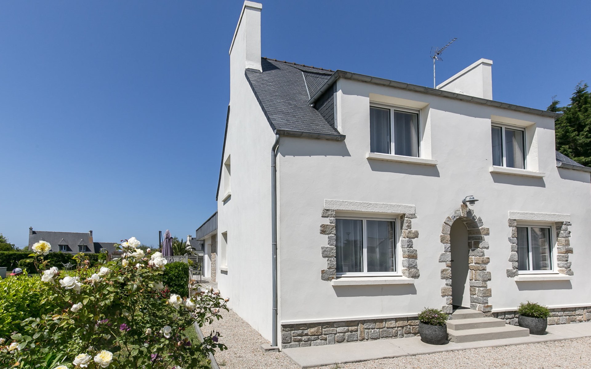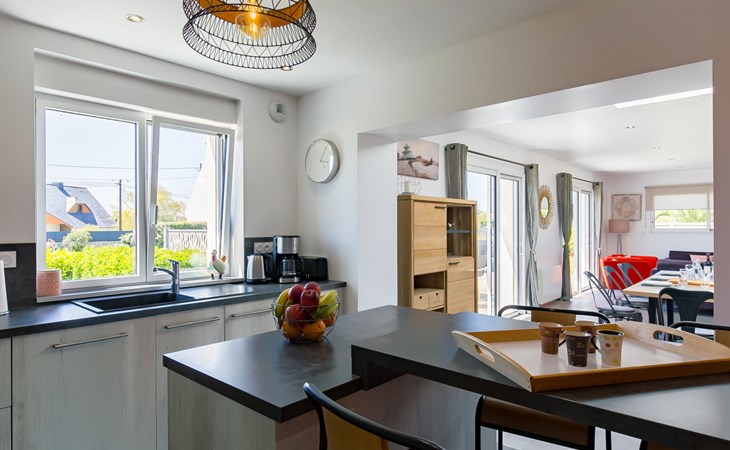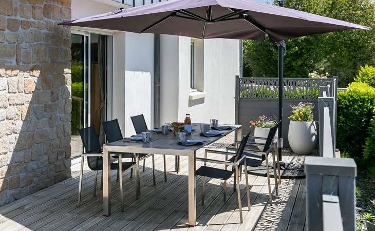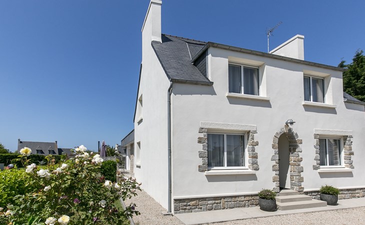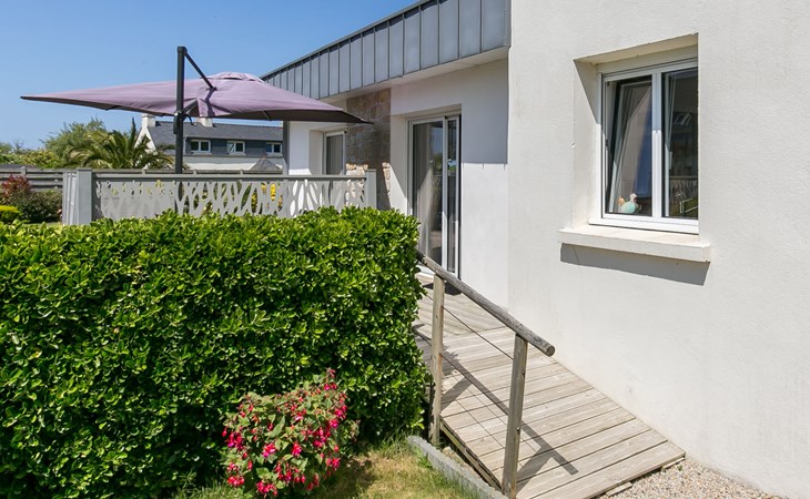 Modern, beautiful, comfortable single-family house "Maison du Venec". 550 m from the centre of Santec, 5 km from the centre of Roscoff, 5 km from the centre of Saint-Pol-de-Léon, in a quiet position in the residential district, 550 m from the sea, 550 m from the beach, in a cul-de-sac. Private: property 1'000 m2 (fenced), large, well-kept garden with lawn and wildlife garden, parking (for 3 cars) on the premises. Shop 5 km, grocery 600 m, supermarket 5 km, shopping centre 5.5 km, restaurant 3 km, bakery 450 m, bus stop "Mairie" 500 m, sandy beach "Plage du Pouldu" 550 m, thermal baths "Thalasso Roscoff" 5 km. Sports harbour 5.4 km, marina 6 km, golf course (9 hole) 19 km, surf school 2.8 km, sailing school 5 km, walking paths from the house 500 m. Nearby attractions: Plage du Dossen, Île de Siek 3 km, Jardin exotique Roscoff, Île de Batz 5.5 km, Carantec 15 km, Plage 14 km, Château de Kerjean 21 km, Morlaix 26 km. Hiking paths: GR34, sentier des douaniers 550 m.