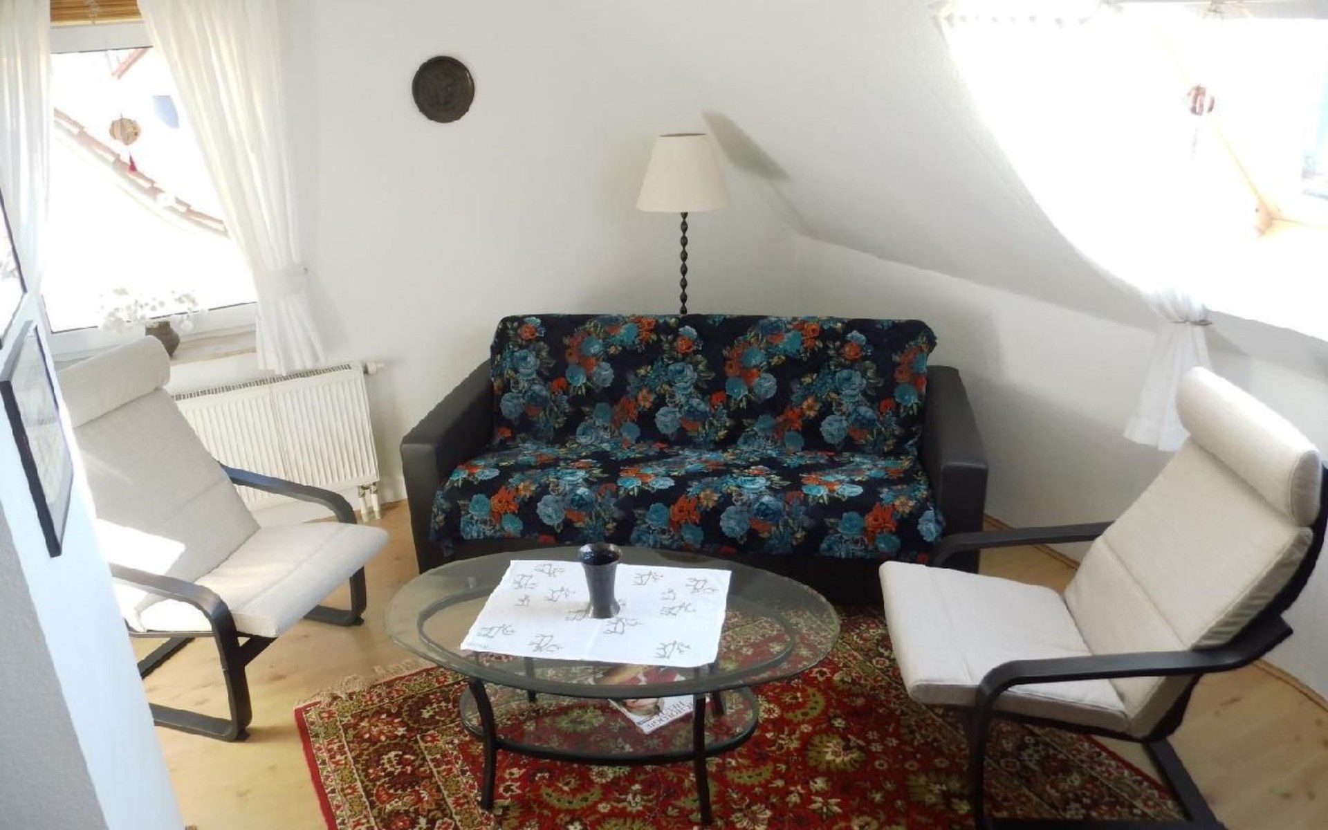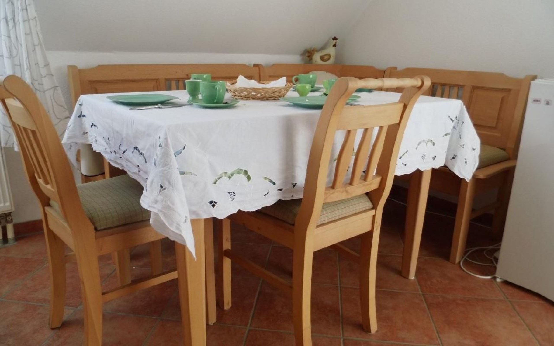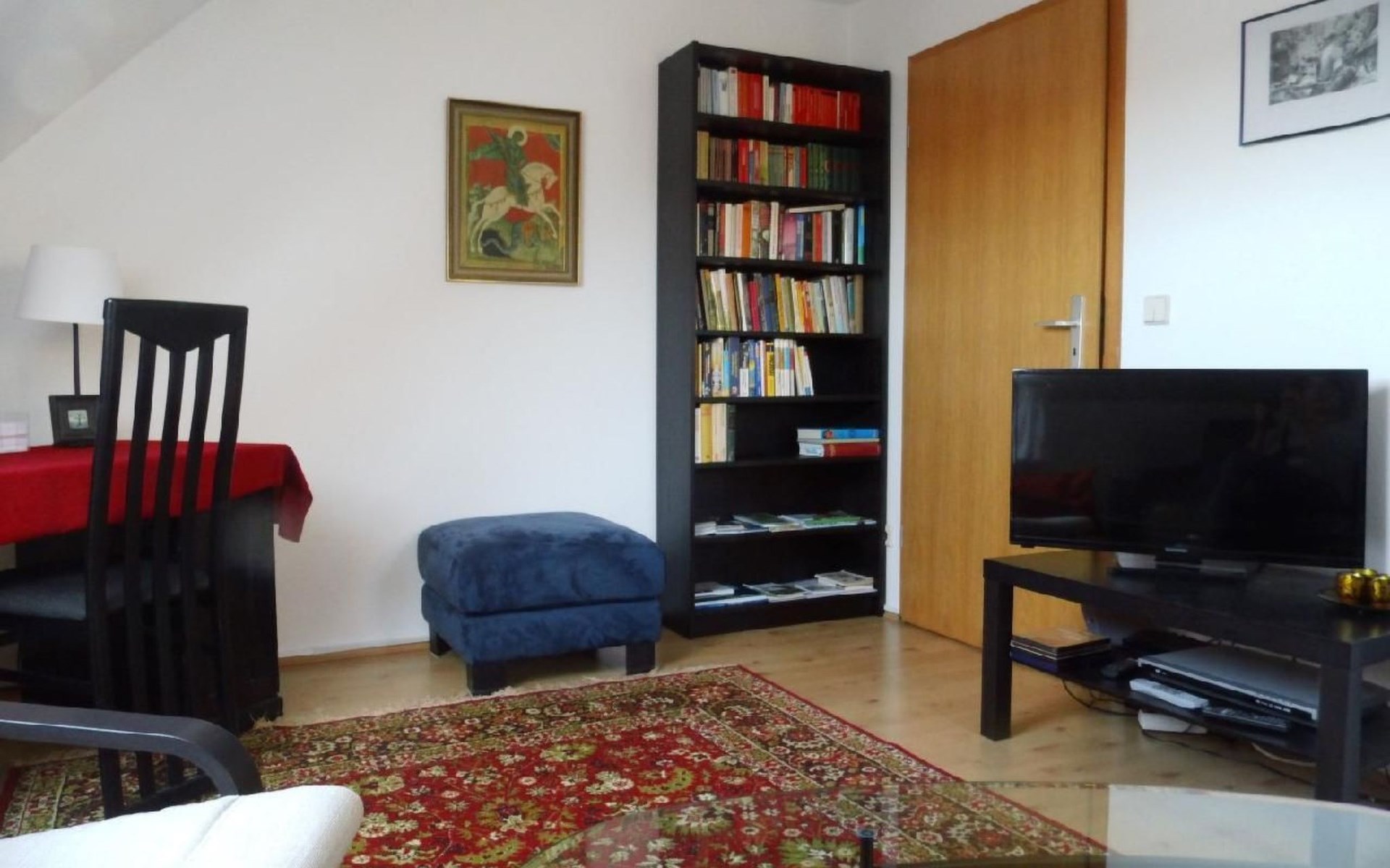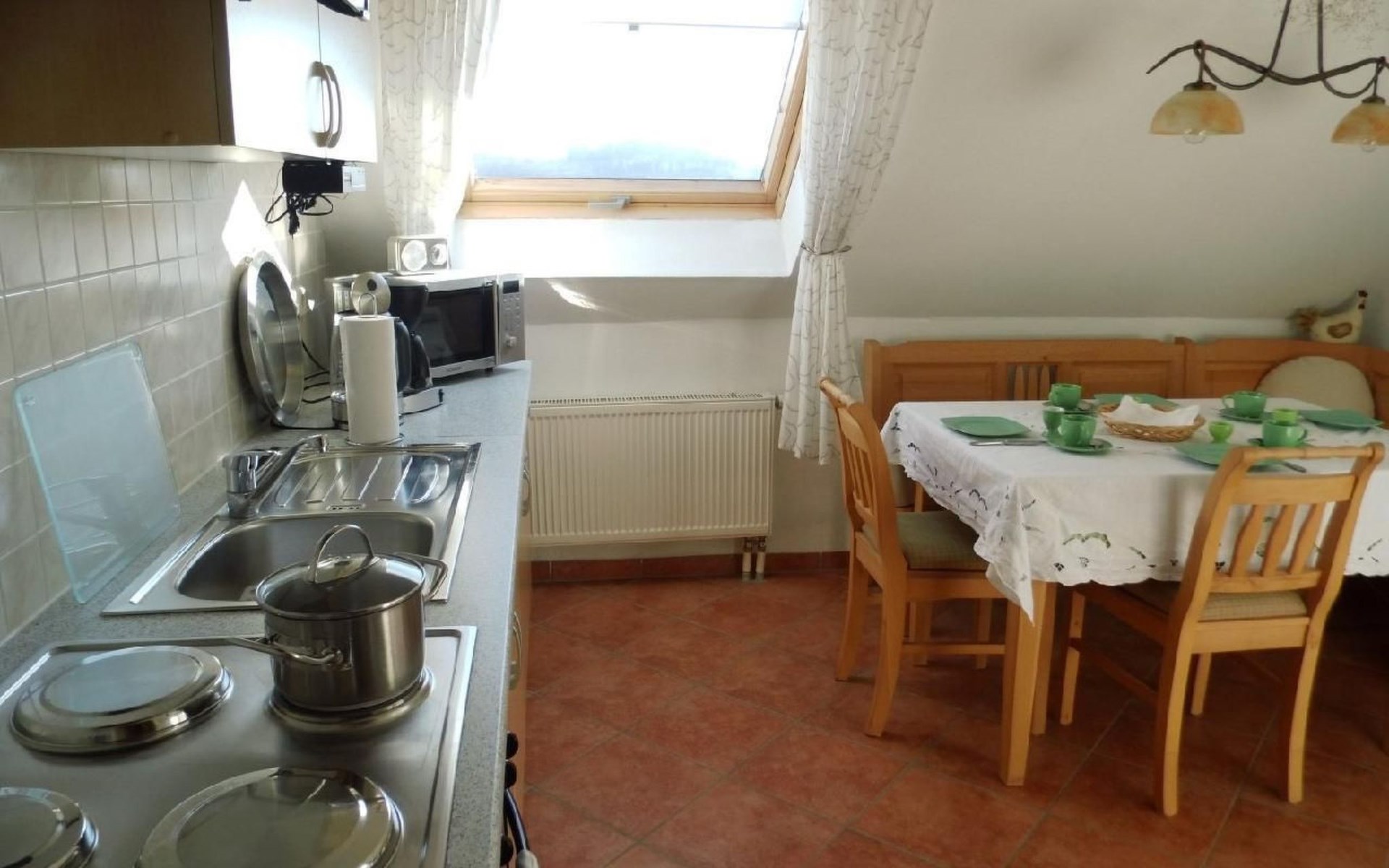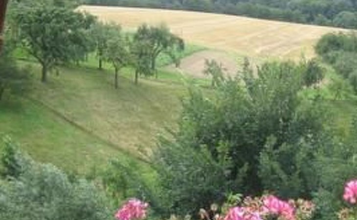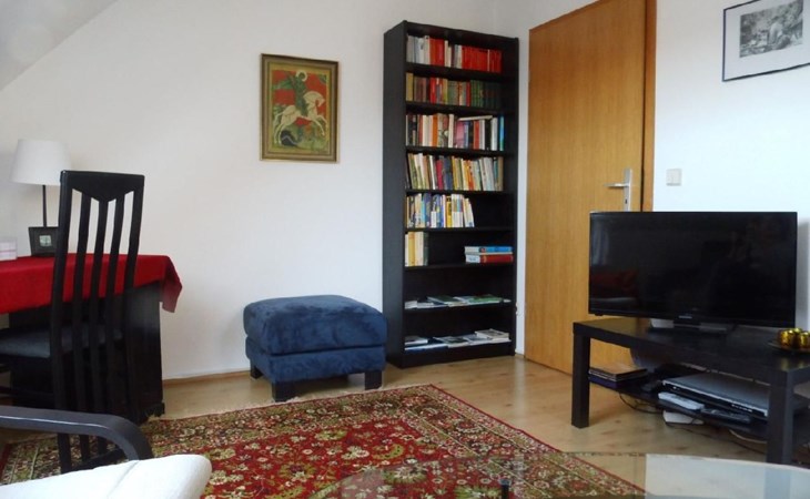 Our house is situated on a quiet hillside high above the Elbe with a beautiful view of the Elbe valley and the Ore Mountains. We rent out the top floor all year round as a holiday flat for visitors to Dresden and anyone else who just wants to relax. The flat has two rooms - a bedroom with a double bed and a cosy living room with a pull-out couch, TV, DVD player, books, magazines, maps and information material as well as games for rainy days. The fully equipped kitchen (fridge, cooker, sink, microwave, coffee machine, kettle) with sitting area offers the opportunity to cook for yourself if you don't want to eat out. Directly off the kitchen is a balcony where you can enjoy the wonderful countryside and sunshine in summer. The rural location close to the city offers ideal conditions for relaxation and culture. While the gentle hills and typical local orchards invite you to take long walks, the state capital with its diverse cultural offerings beckons. A 20-minute walk through a romantic forest gorge takes you directly to Pillnitz Palace and Park, which attracts visitors and locals alike with its festivals and concerts, especially in summer. In addition to Dresden, the surrounding sights are also worth a visit, e.g. Meißen, Stolpen, Moritzburg and Königstein Fortress. If you like hiking, you will find a variety of hiking routes in the Pillnitz vineyards, Saxon Switzerland, the Ore Mountains and Upper Lusatia. Please note that pets are only permitted in this holiday home on request directly from the landlord. Accommodation tax of 6 % of the accommodation costs. Short description 1Number of kitchens : 1